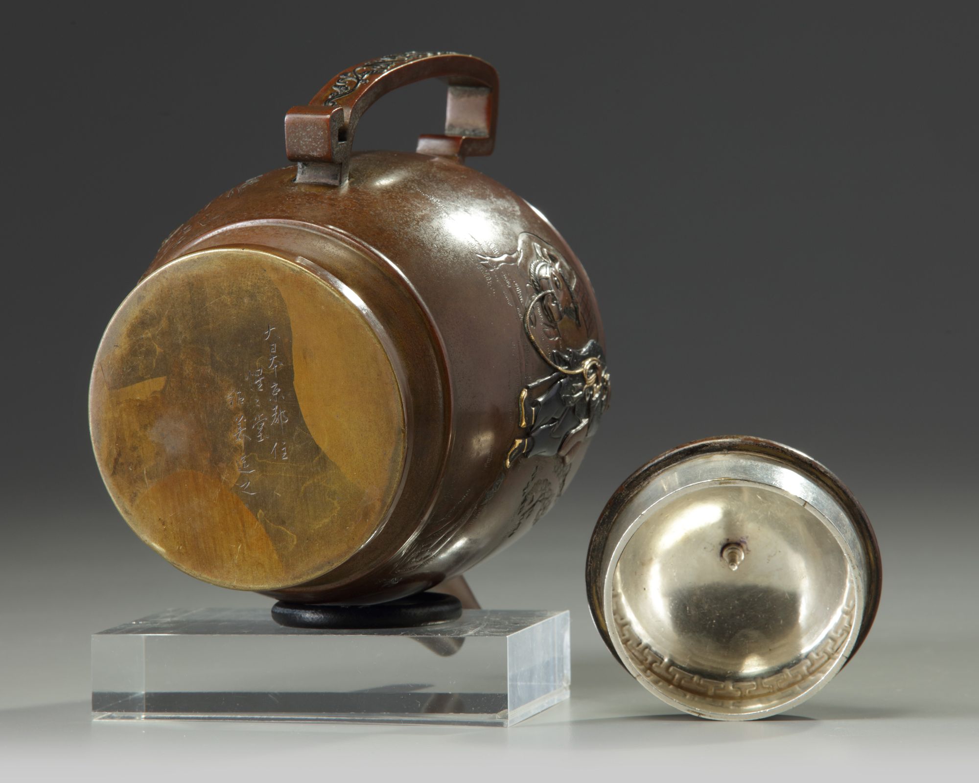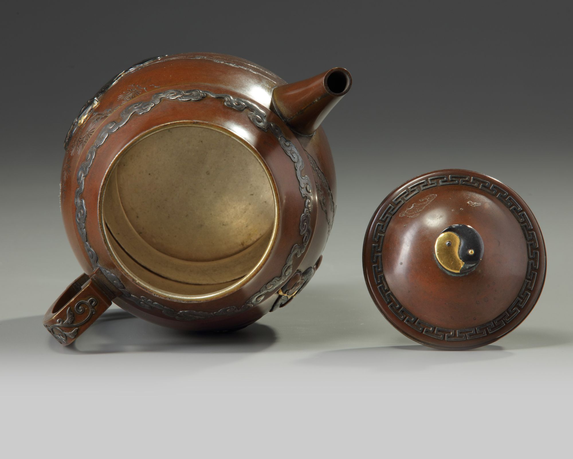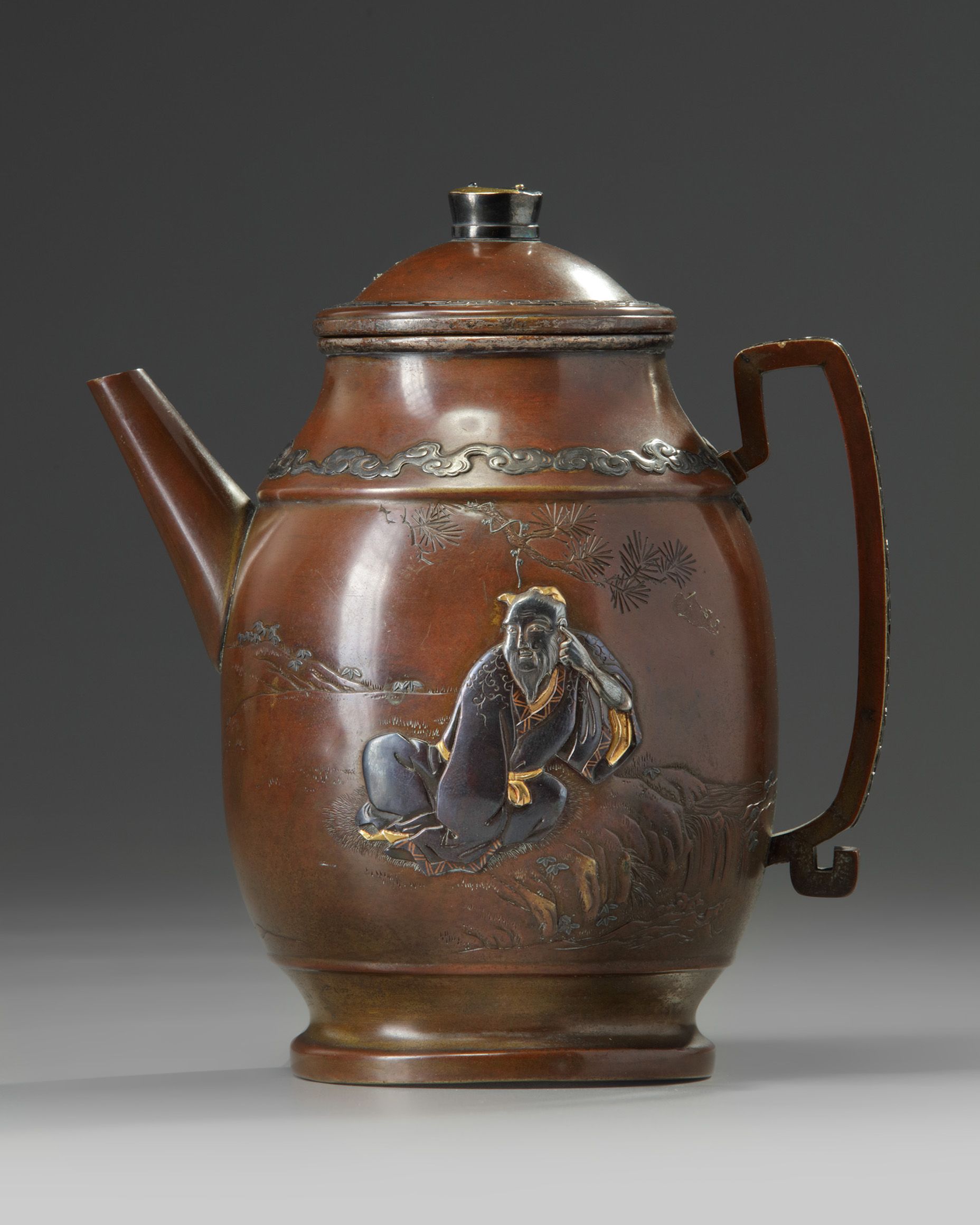 The teapot with a long handle and a straight spout, decorated in low relief with a figure beside a cow and an old figure seated on the other side,The shouilder is surrounded by clouds, The base is signed.