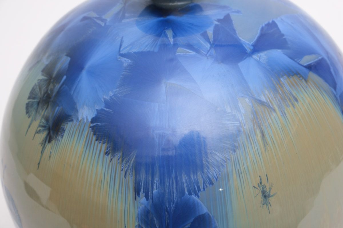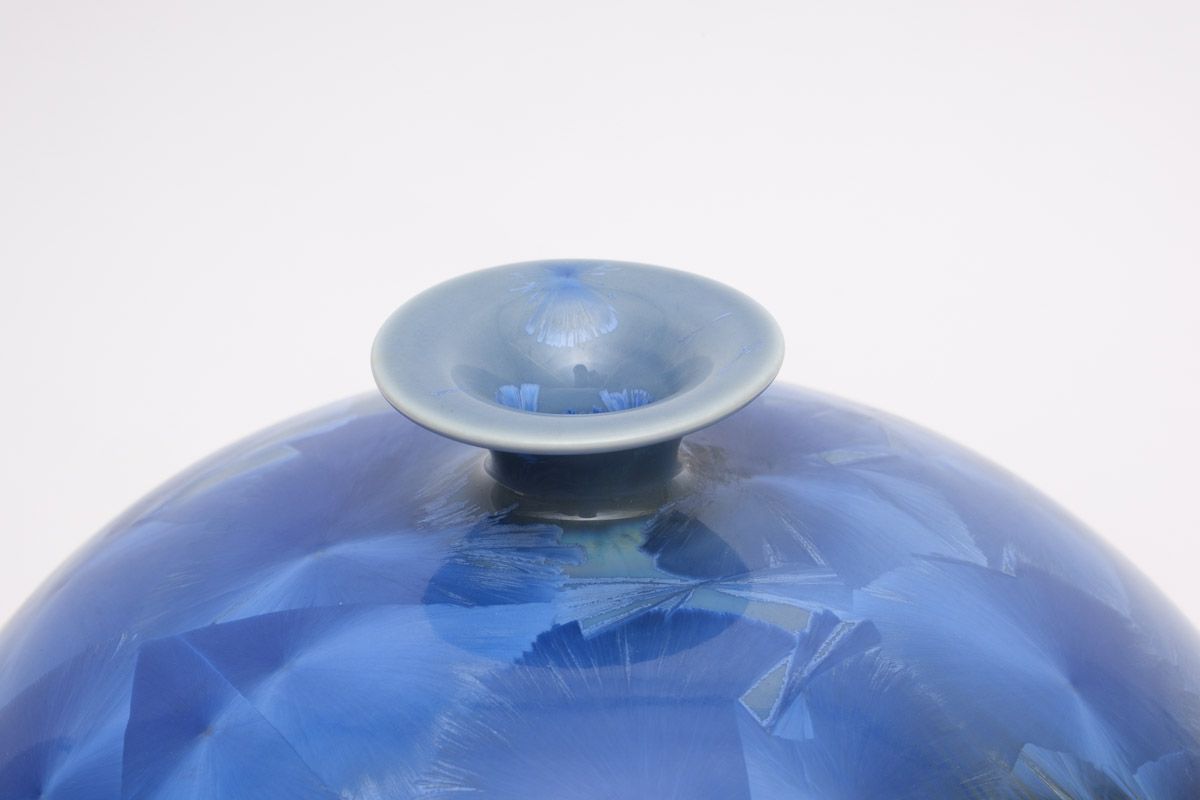 Globular vase with a narrow mouth decorated with metallic clear blue patches. Bottom marked: Ōka.