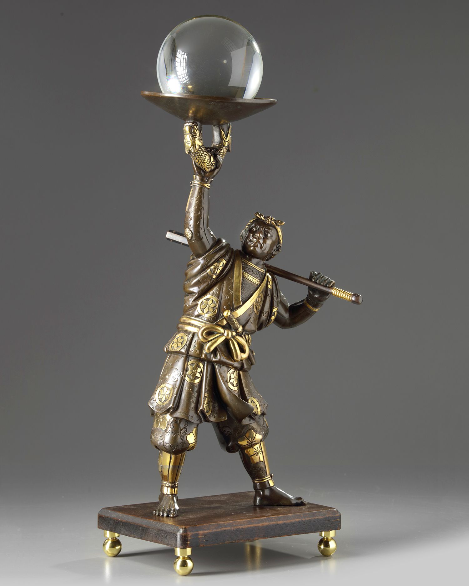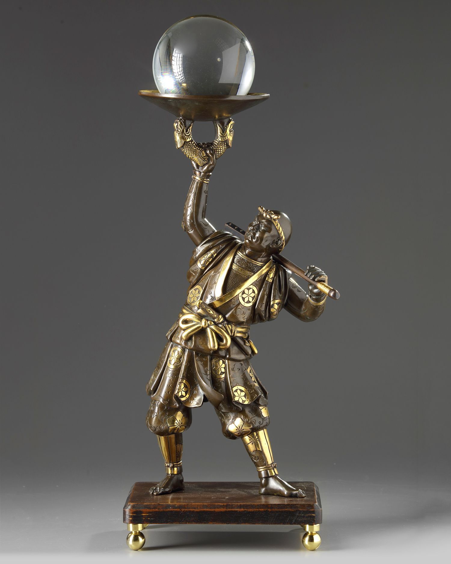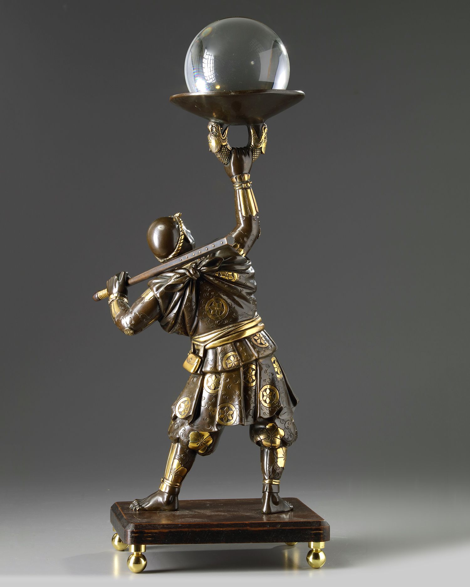 A bronze and partial-gilt sculpture of an animated Samurai, supported on a detachable rectangular wood standard lacquered in gold takamaki-e.