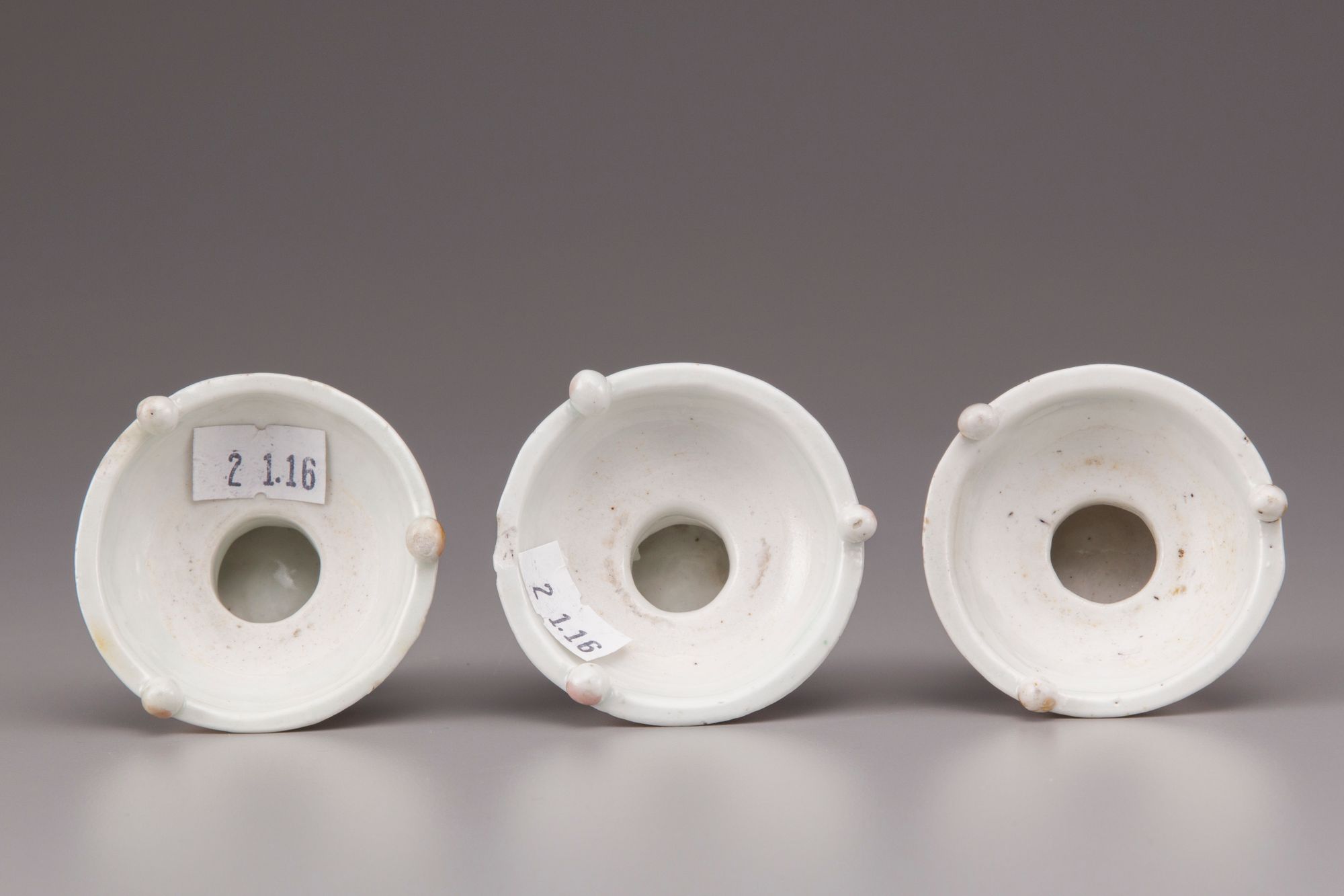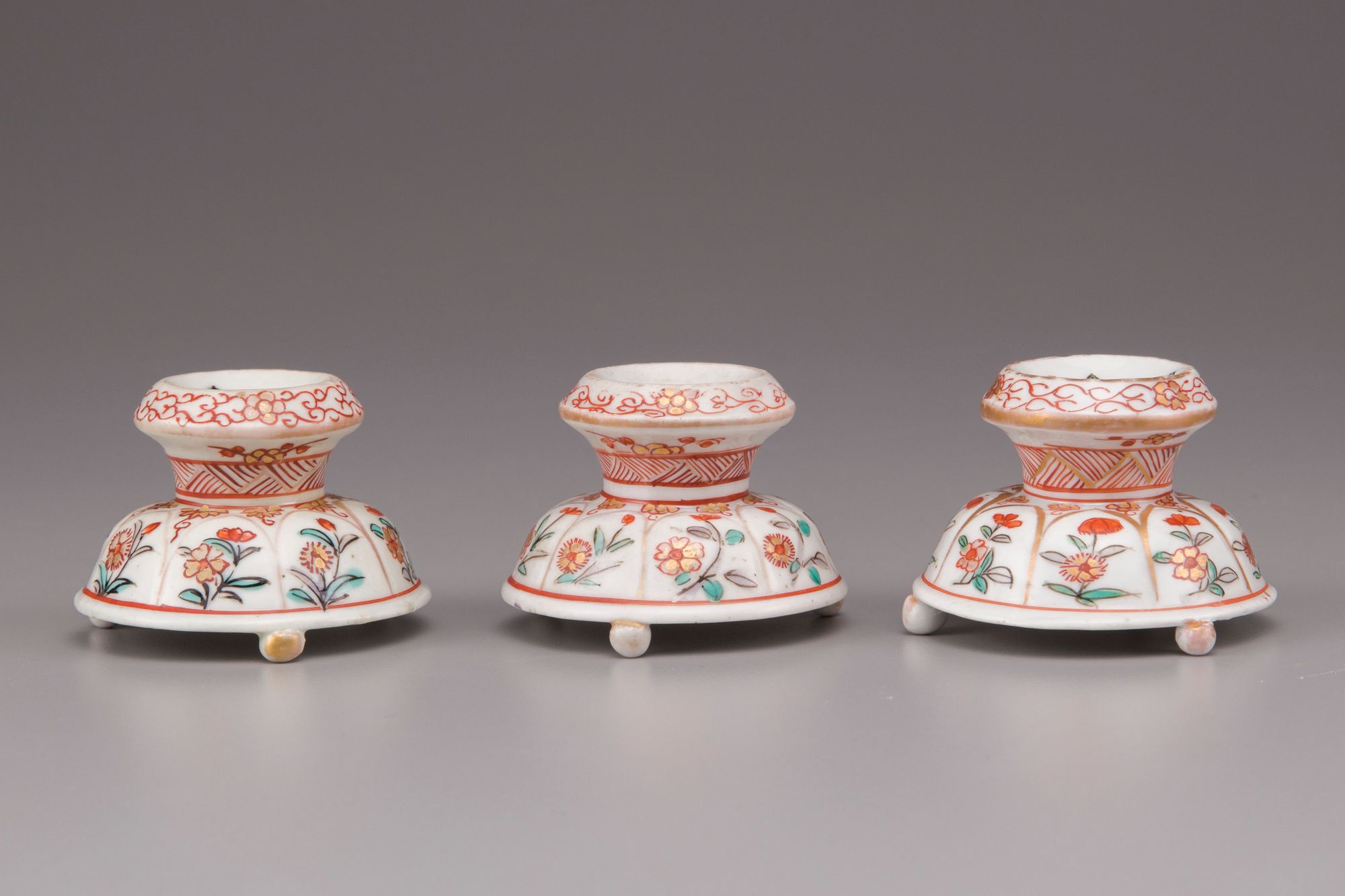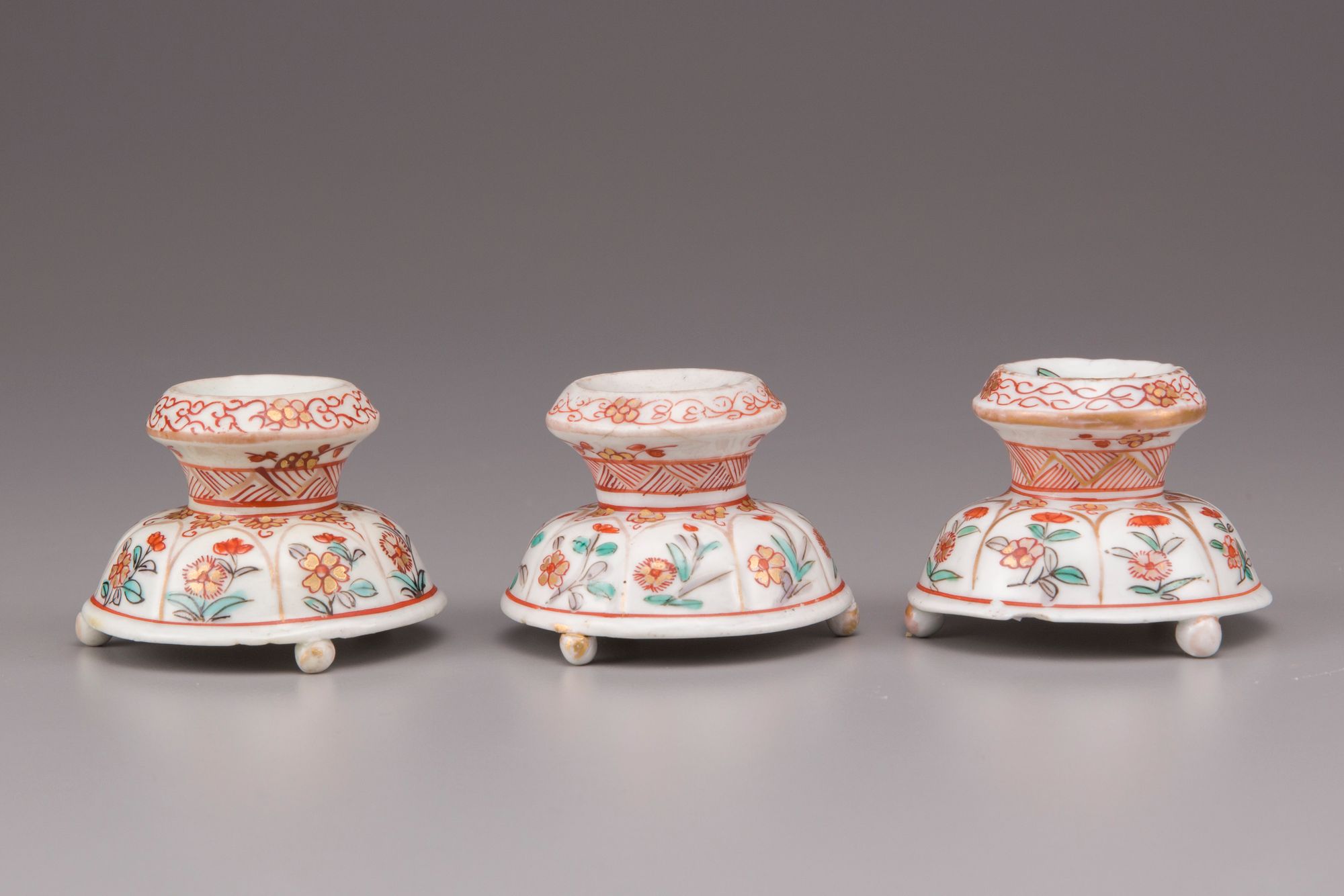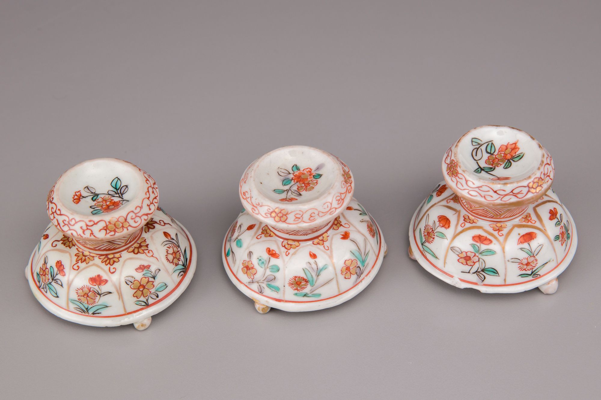 Salt, the high, domed open body on three small ball feet. The neck widening into a broad rim tapering to the slightly concave top. Imari decorated in overglaze iron-red, green, aubergine enamels and gold. The lower part with moulded panels shaped as lotus petals in low relief, filled with carnation and prunus sprays. On the neck a zig-zag lines pattern border and three flowering prunus sprays. The shoulder with flowerheads alternating with foliate scrolls. On top, inside the scale, a flowering carnation spray.