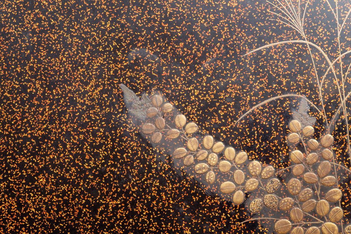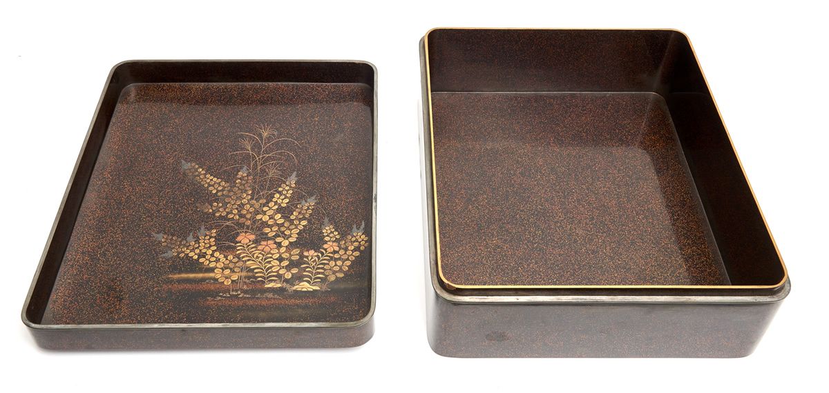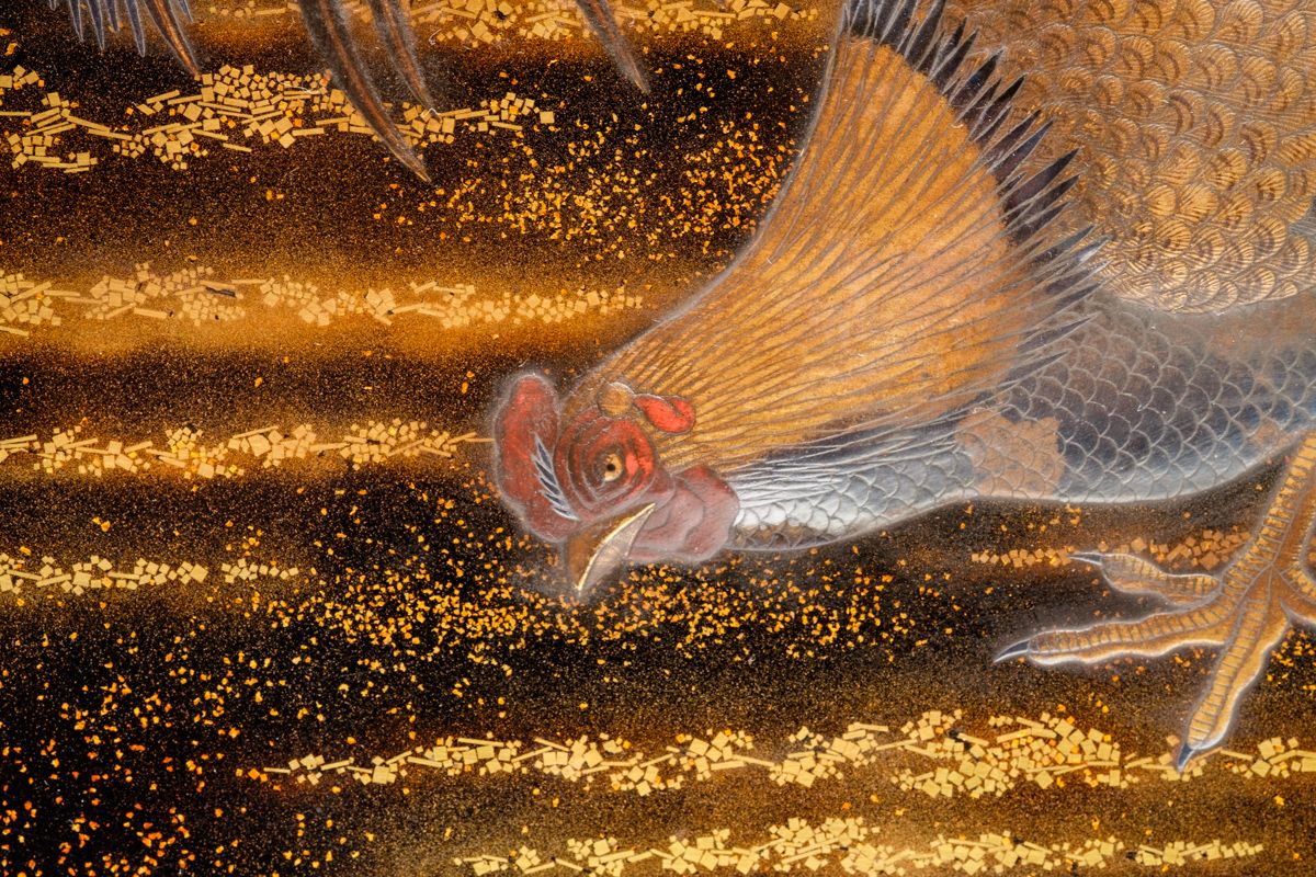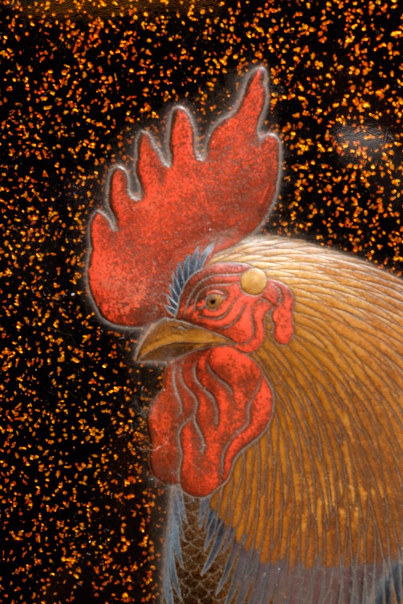 Large lacquerware stationery box (ryoshibako) decorated with a cock and a hen in raised gold- and silver maki-e lacquer with some red. The inside has sprinkled gold-lacquer (nashiji) and the lid shows at the inside a flower design. In a box.