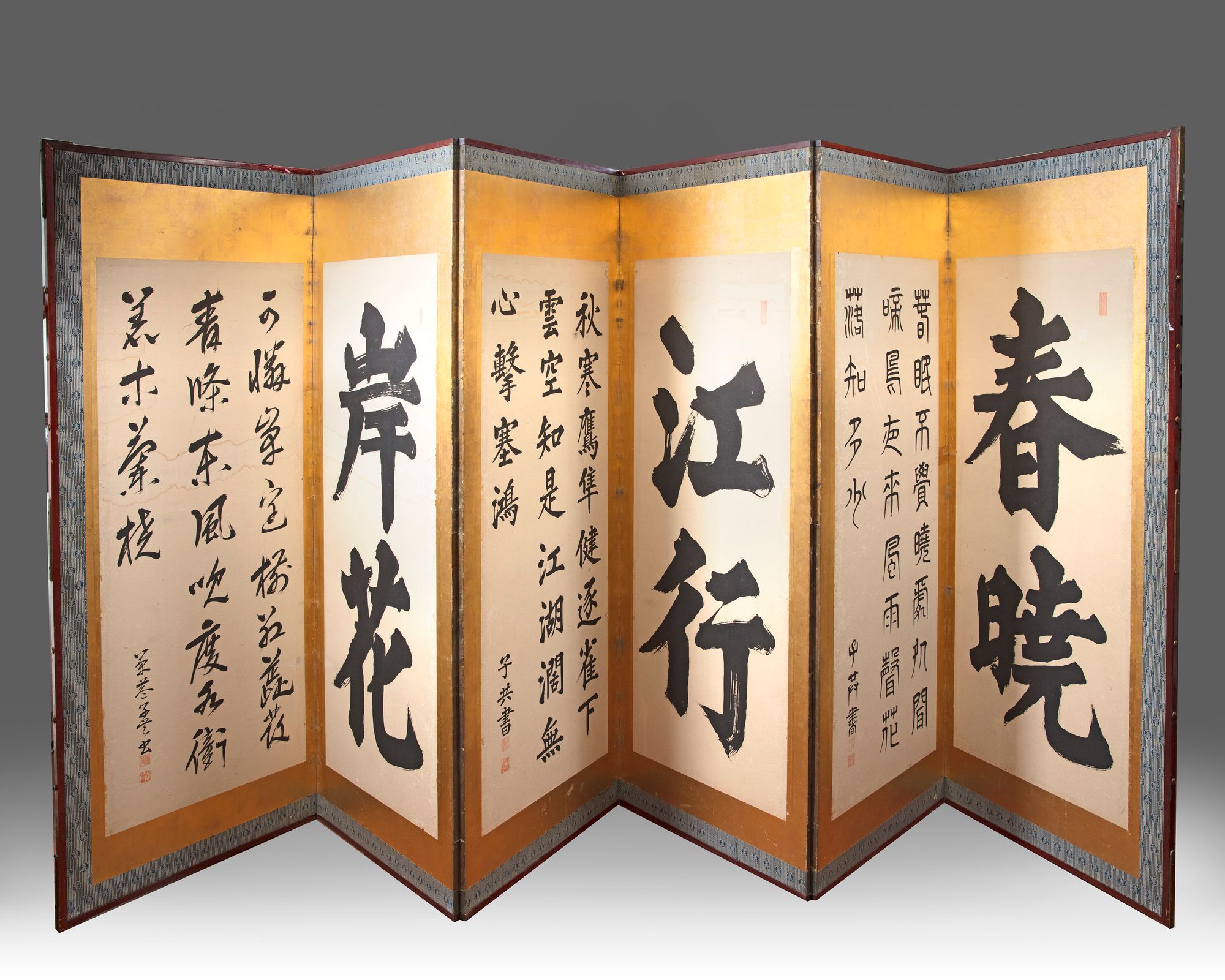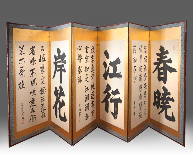 A panel screen, ink ,color and gold. Gold leaf on paper. Decorated with A Japanese calligraphy.
