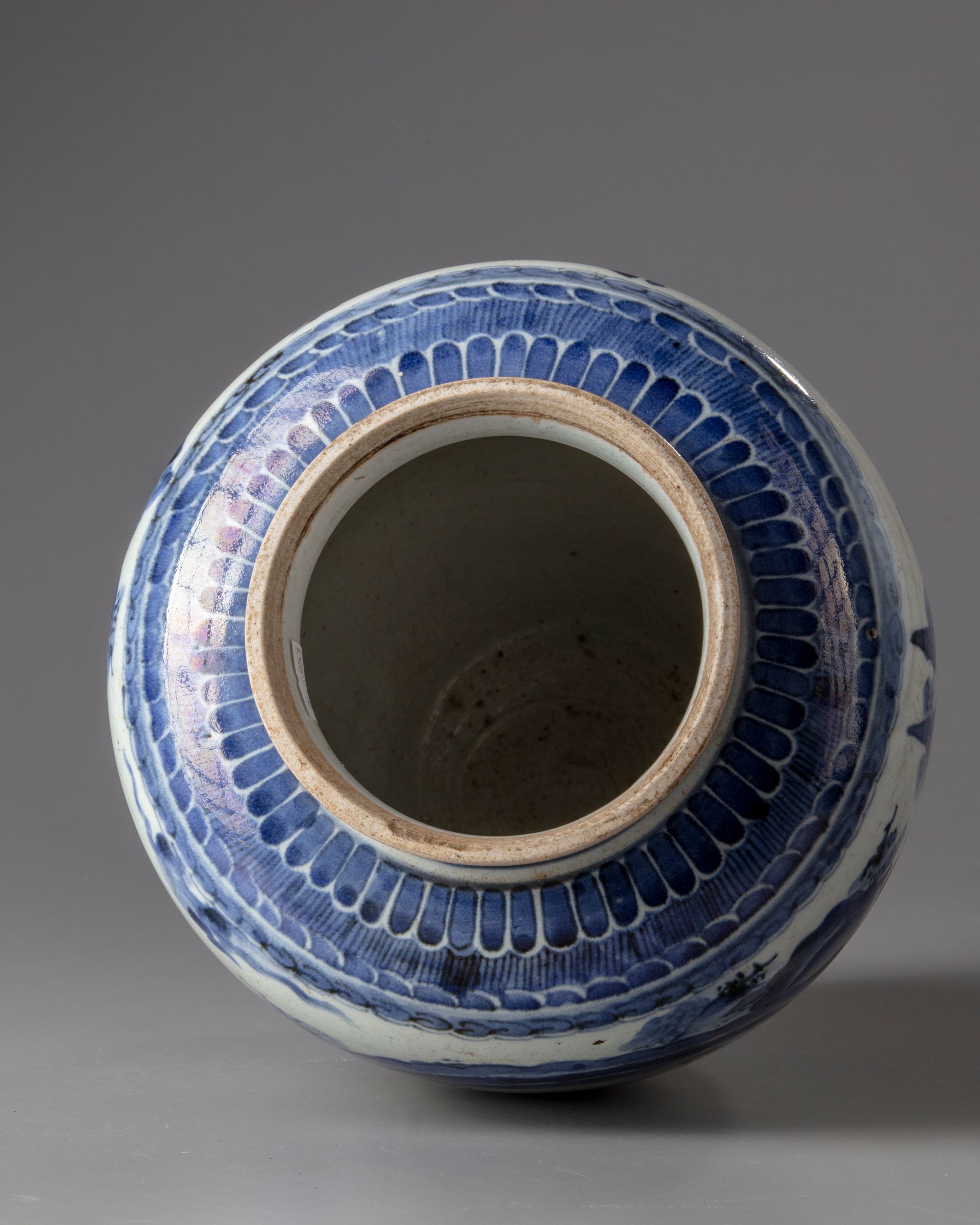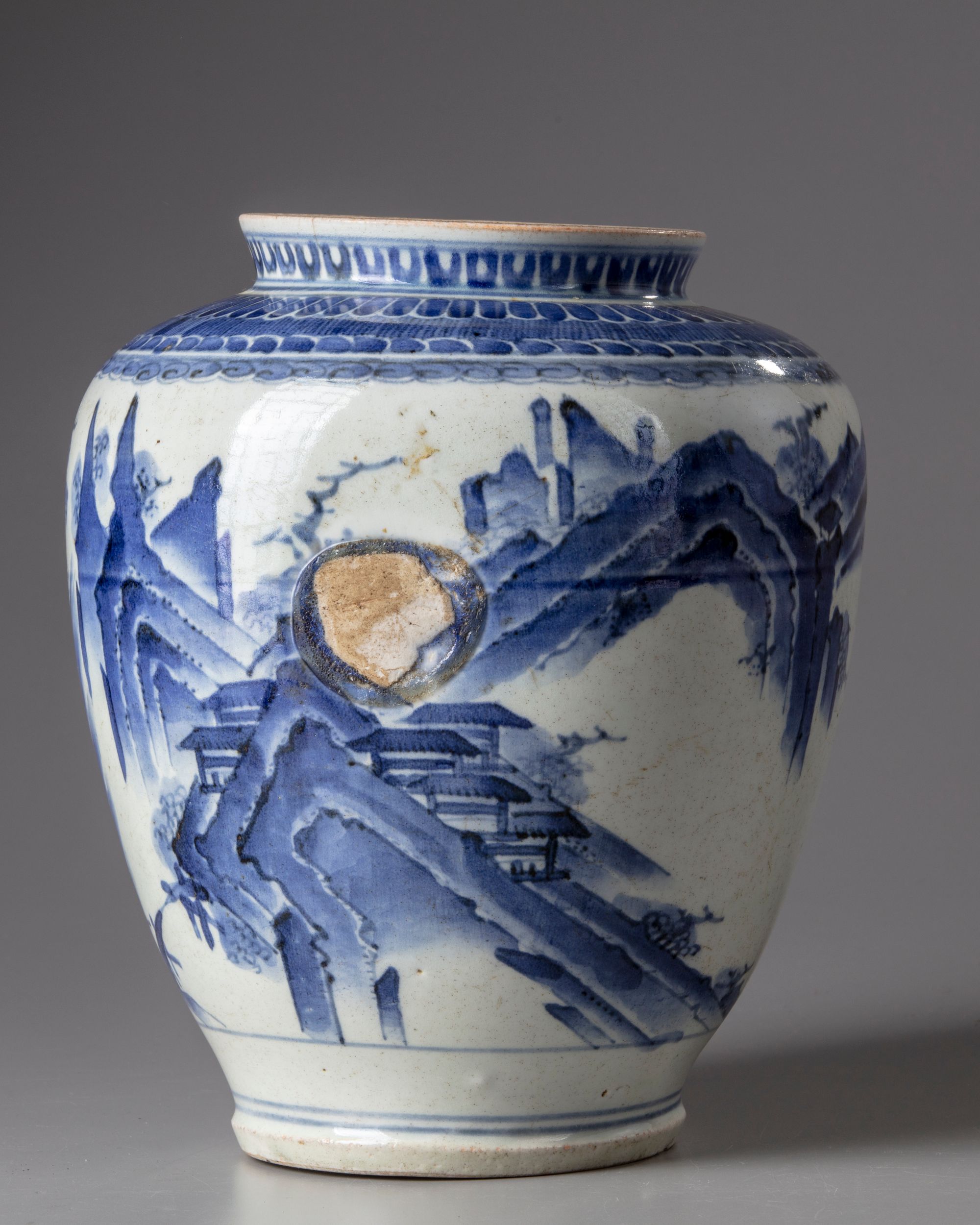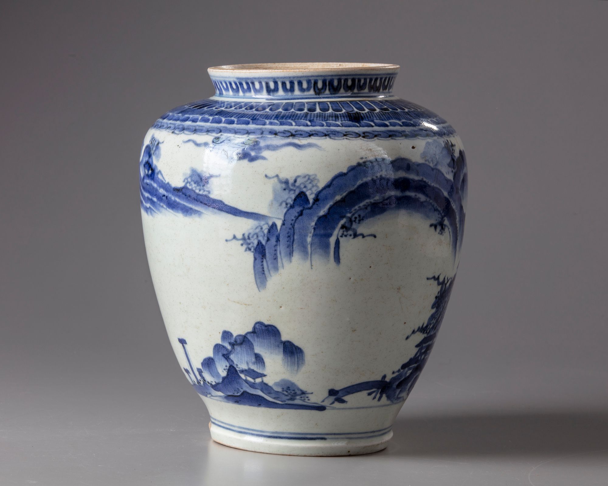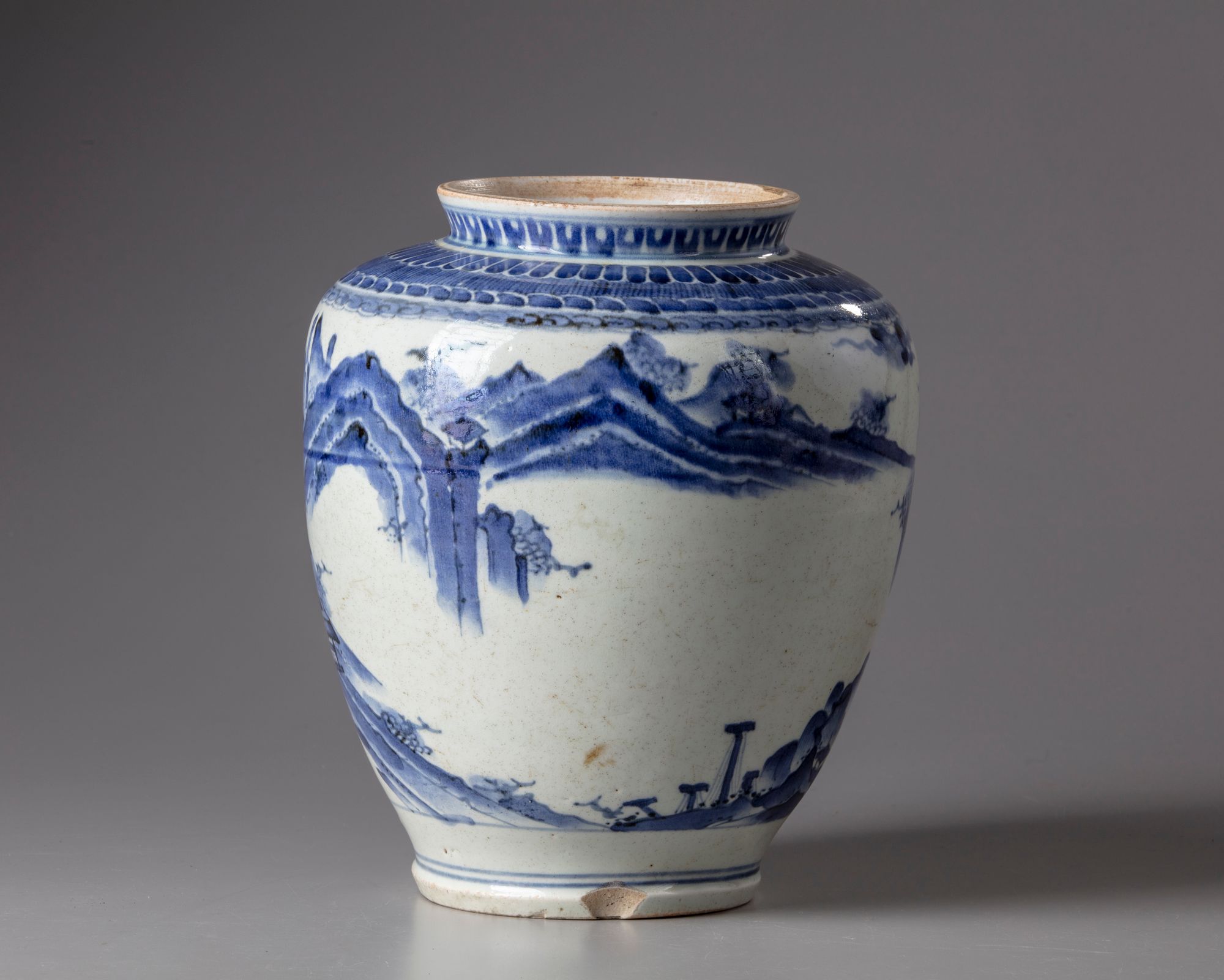 A baluster form with a small footring and an everted rim, decorated in underglaze blue with houses in a mountainous landscape with bands of stripes to the shoulder.