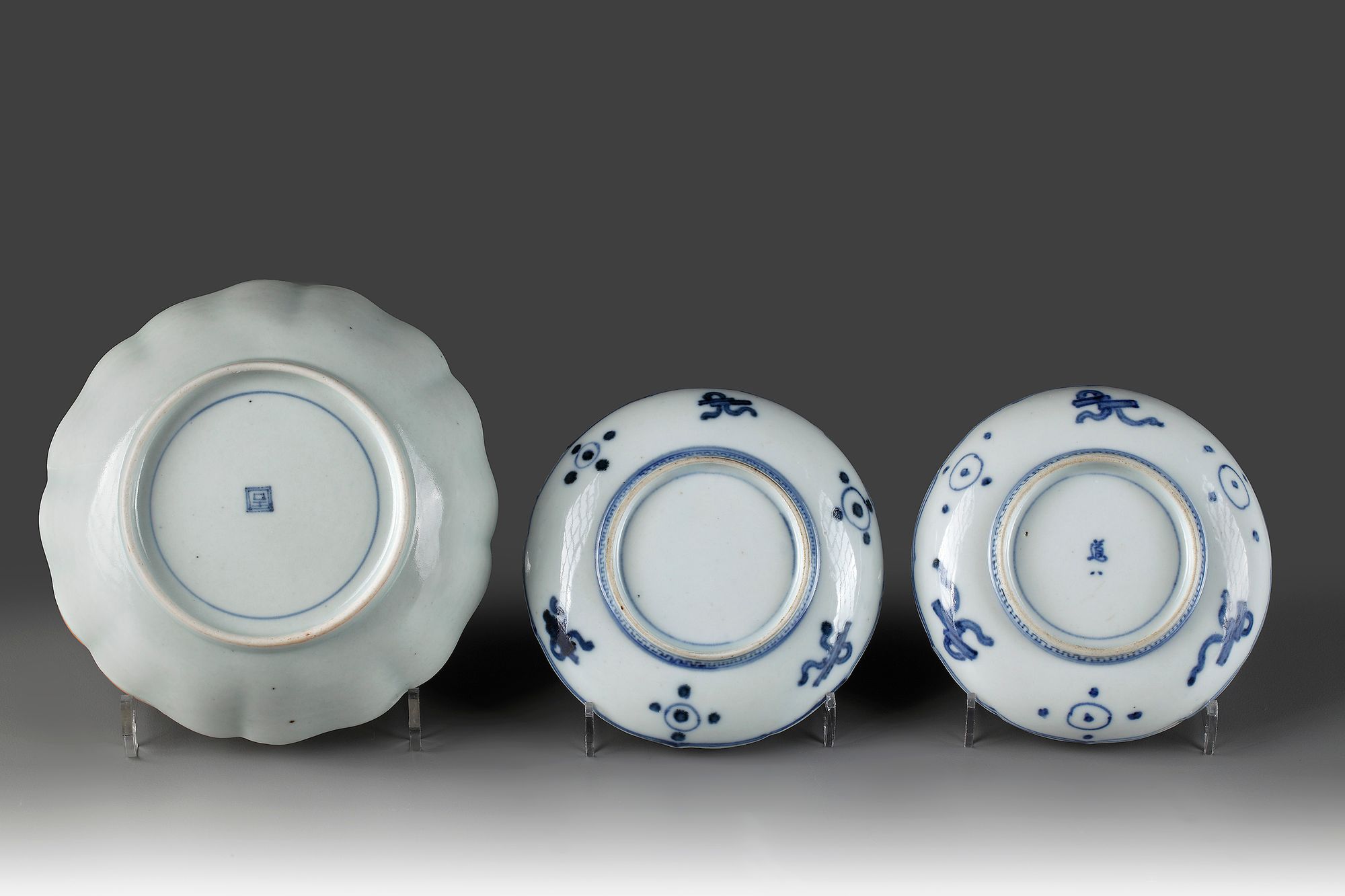 The large dish decorated with a mountainous river landscape and three figure in a boat and calligraphy in the undecorated area. Diameter 15.4 cm. And a pair of smaller dishes with a warrior on a horse and a small boy in a garden scene and pine tree, calligraphy in the undecorated area. Diameter: 12 cm. Both modelled after earlier Chinese examples.