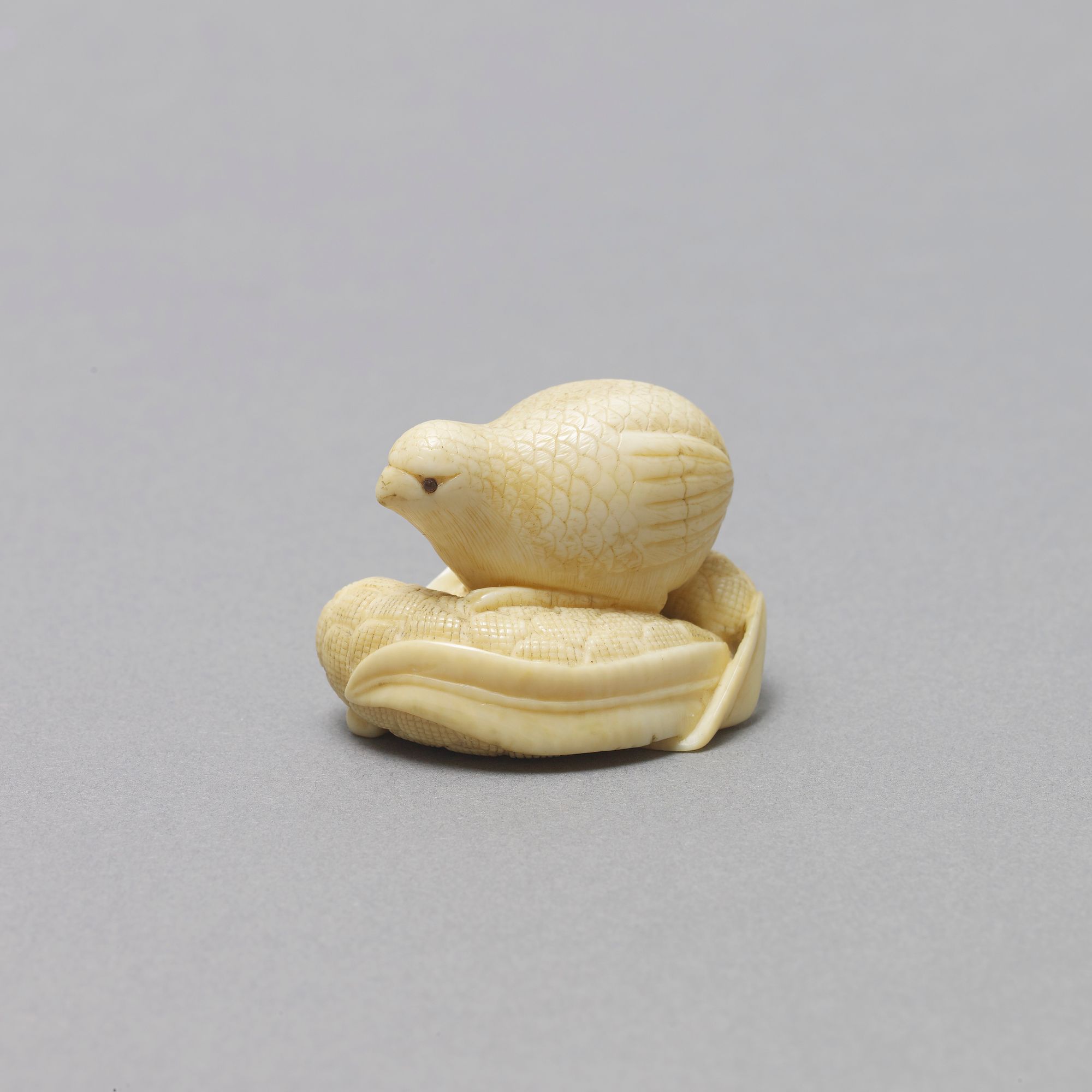 Perched on two large millet ears. The eyes are inlaid in horn Signed: Hakuryu
