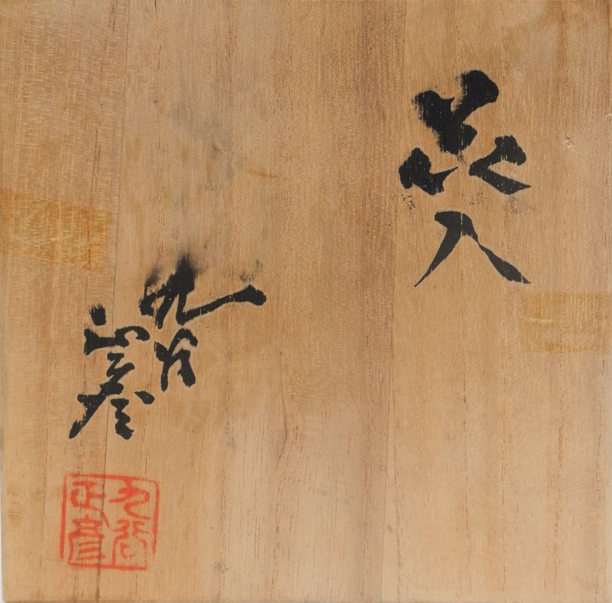 Small Kutani-ware porcelain vase with a tall neck with a glaze changing from above dark purple to yellow, green and below very dark blue by Kutani Masahiko (Tokuda Yasokichi III, 1933-2009), in original signed box. The vase shows some similarity with a aubergine. Bottom mark in blue: Masahiko. In original signed box.