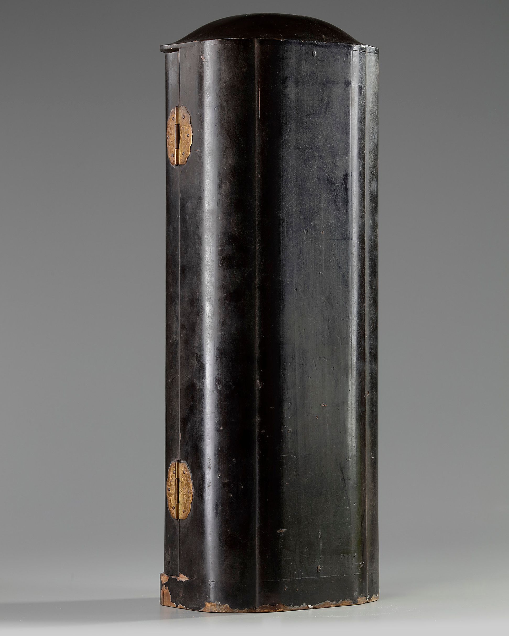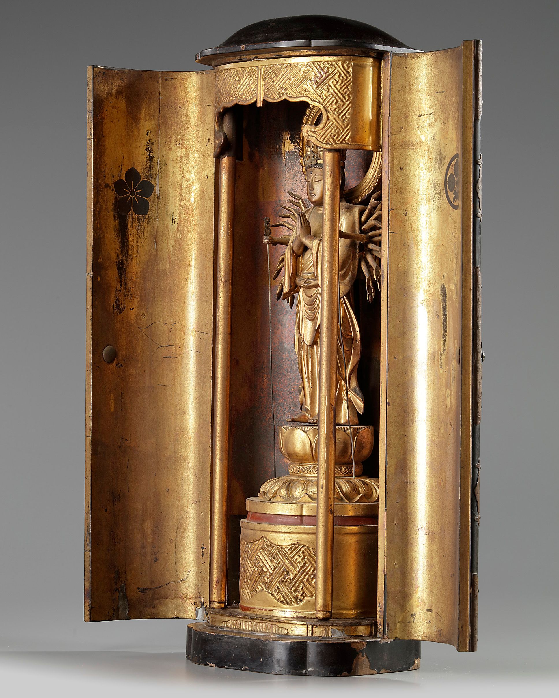Each of the two doors of the shrine shows a crest: left the platycodon-flower (kikyō) of the Chisan-branch of the esoteric Shingon-school. Right an unidentified crest. Above a round lotus-throne stands a form of the Eleven Headed Kannon (Jūichimen Kannon). In Sanskrit: Ekadasamukha: The Jūichimen Senju Sengan Kannon, Kannon with Eleven heads, "Thousand" Hands and "Thousand" Eyes. The central hands folded in front of the breast and standing before a round halo. The gilded figure has a fine carved face.