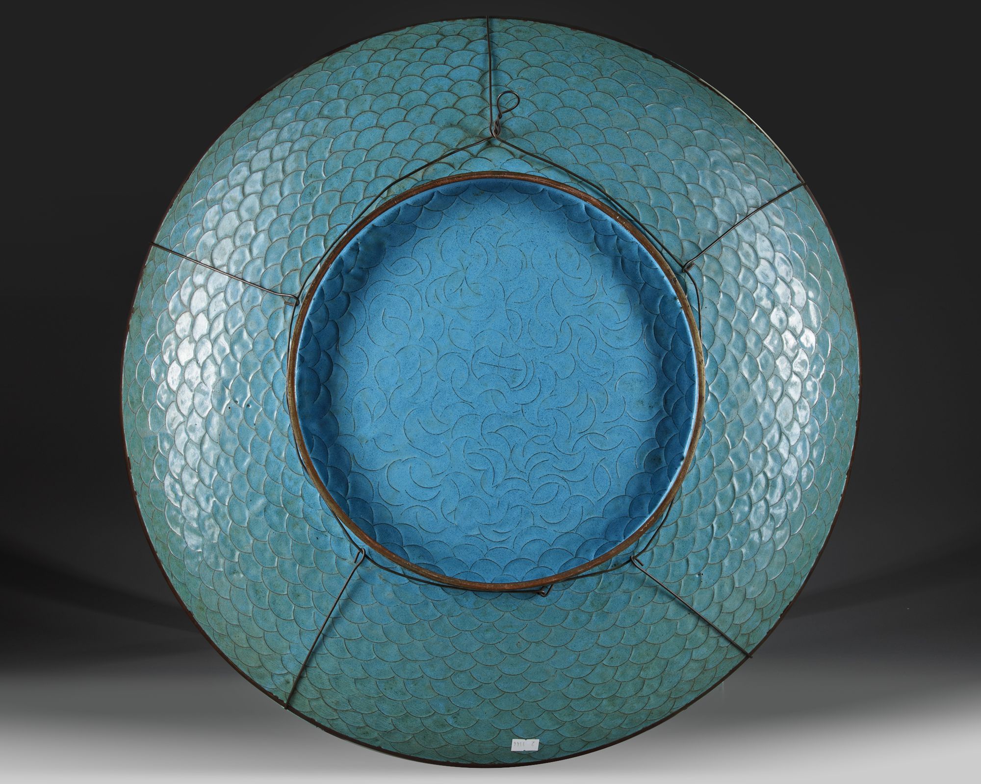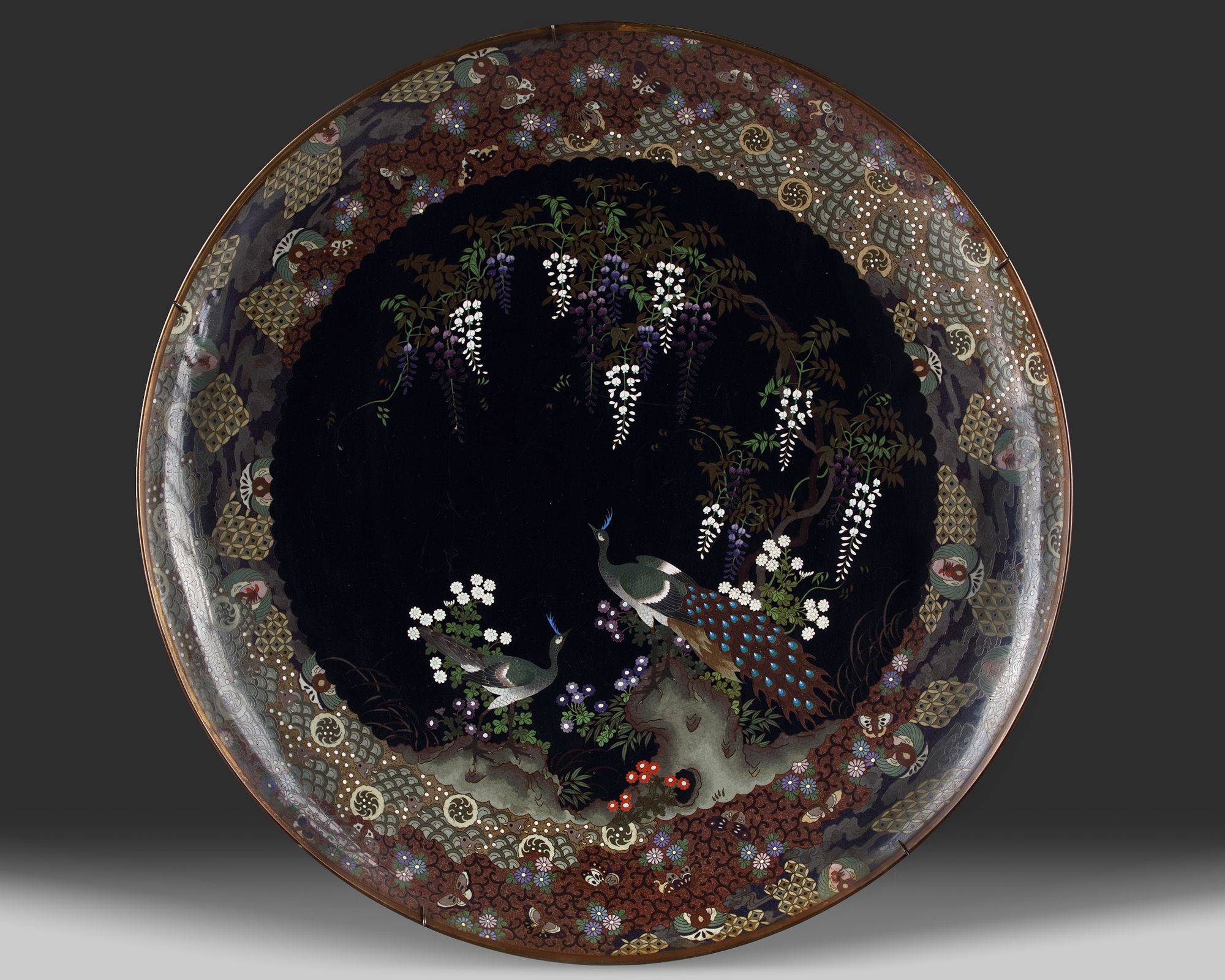 A large Japanese cloisonné charger, decorated with two pheasants on ornamental rocks amongst flowers and foliage. Diameter 60 cm.