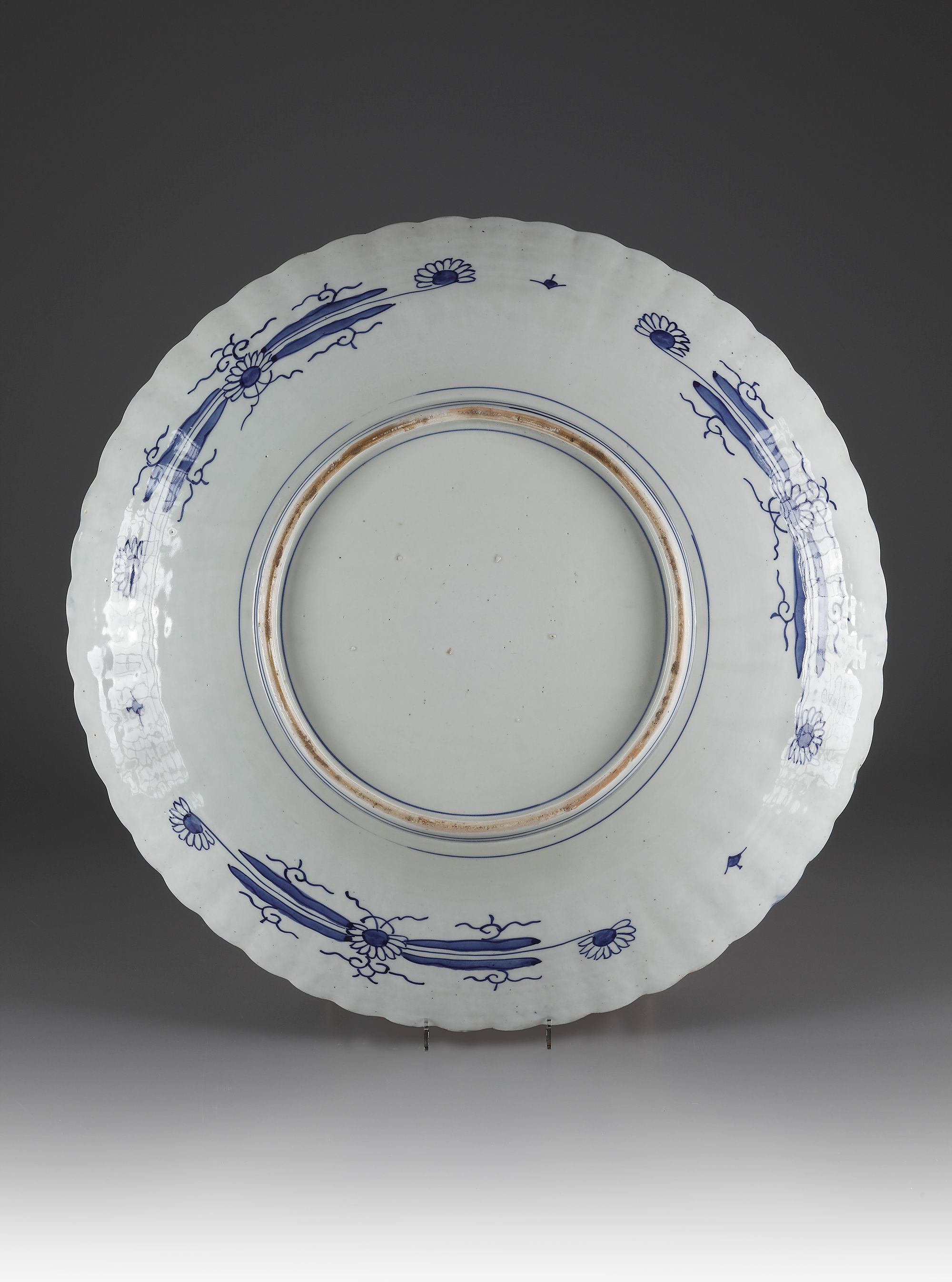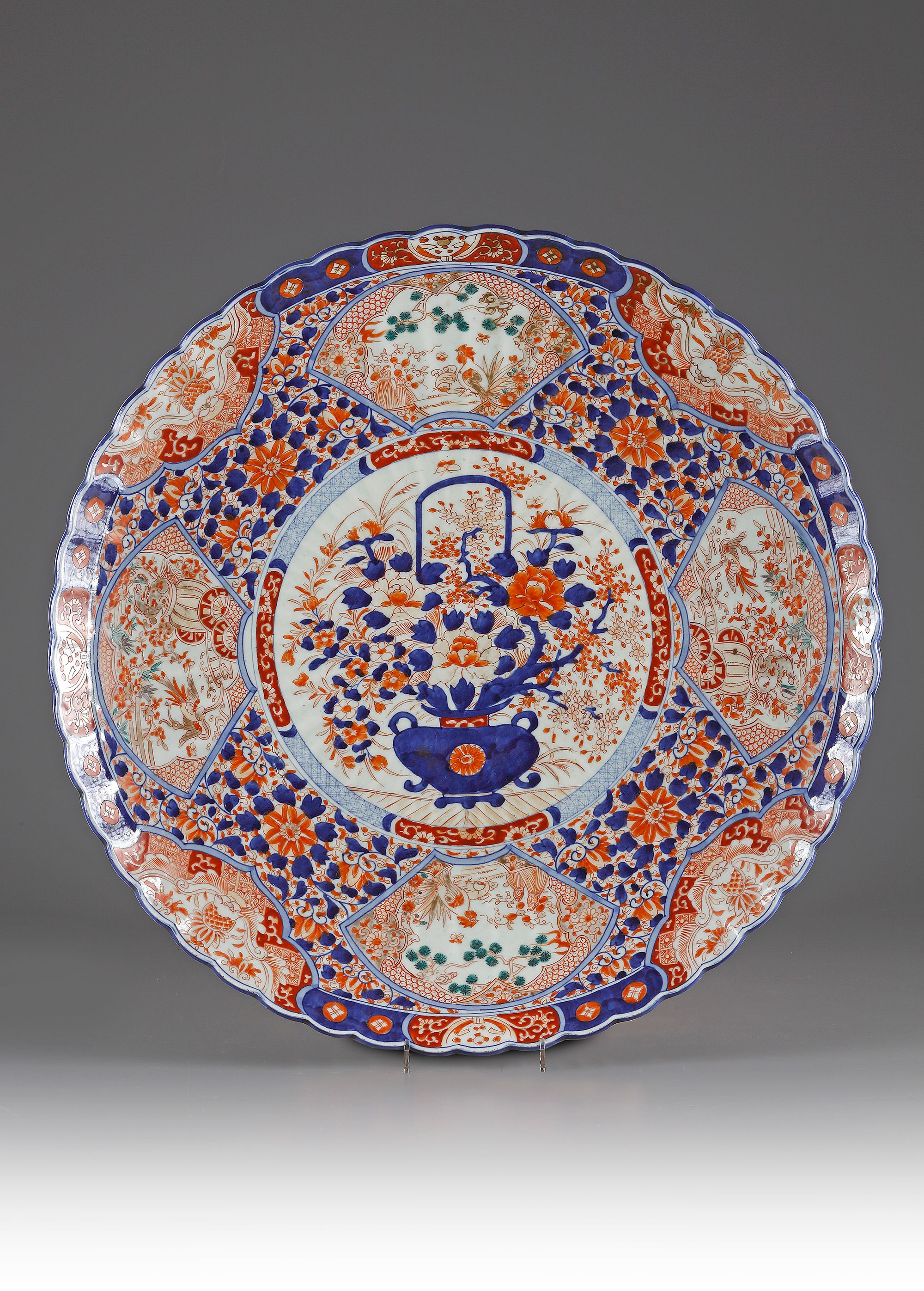 Centrally decorated with a basket holding blossoming flowers, encircled by four fan shaped cartouches and floral decoration.