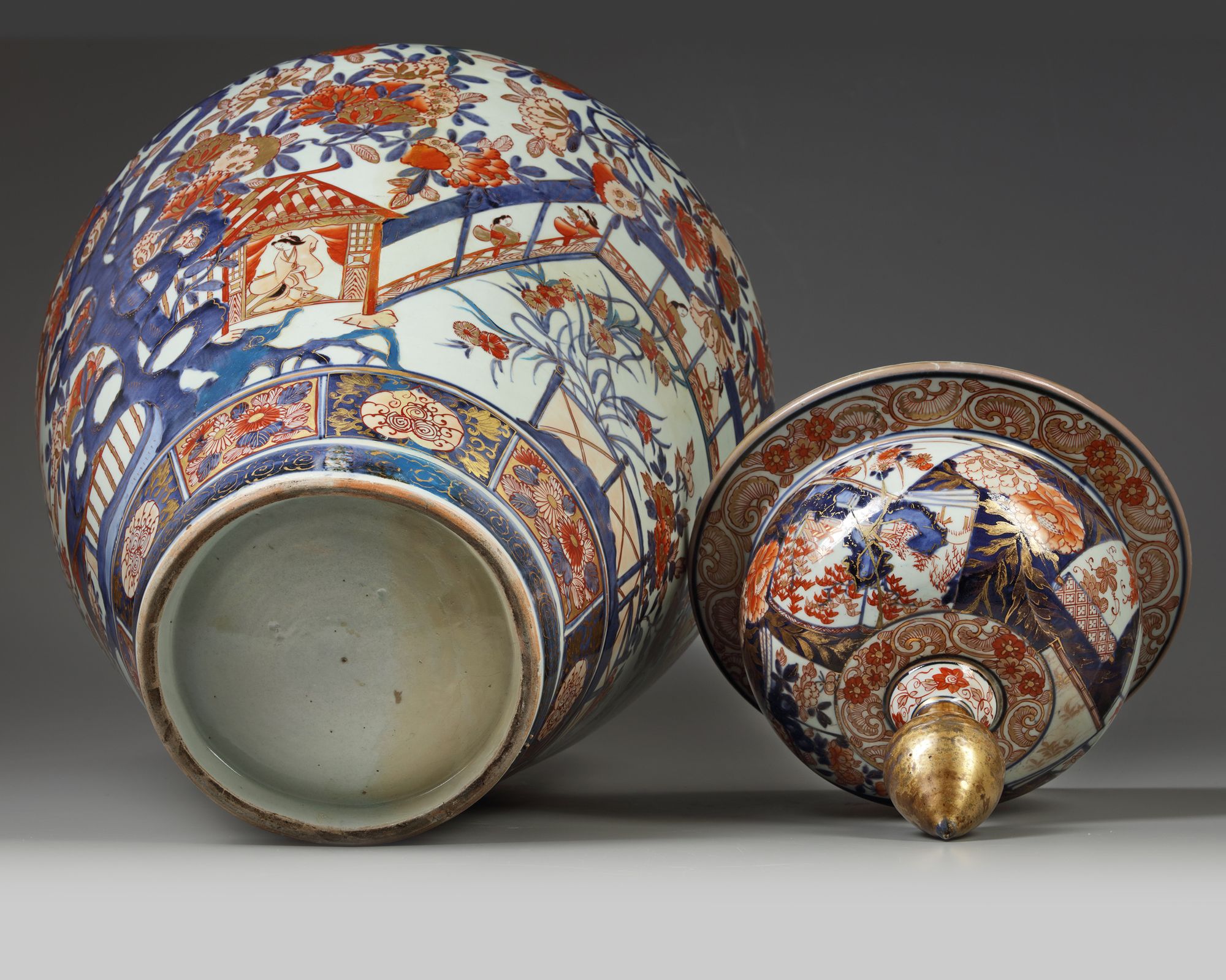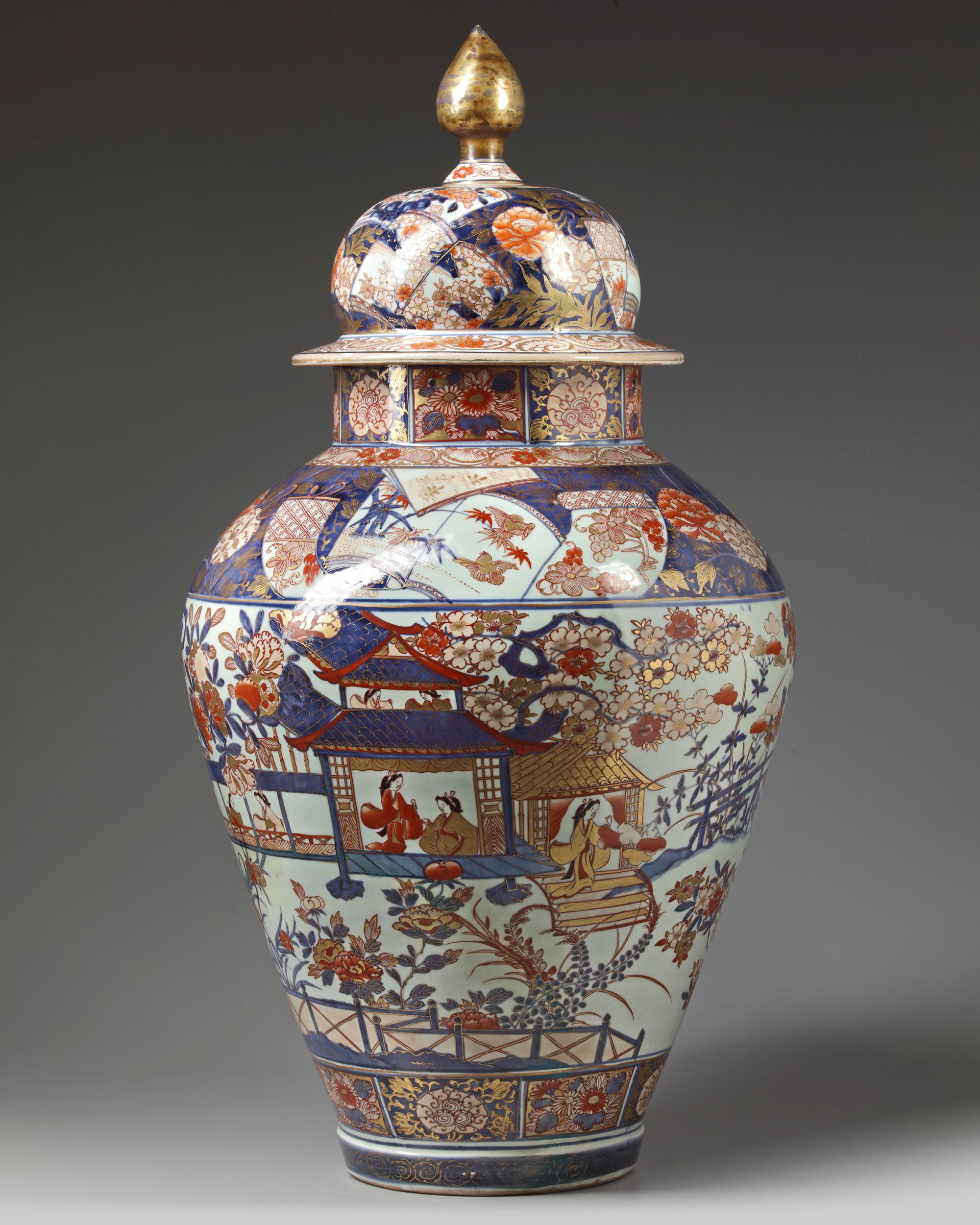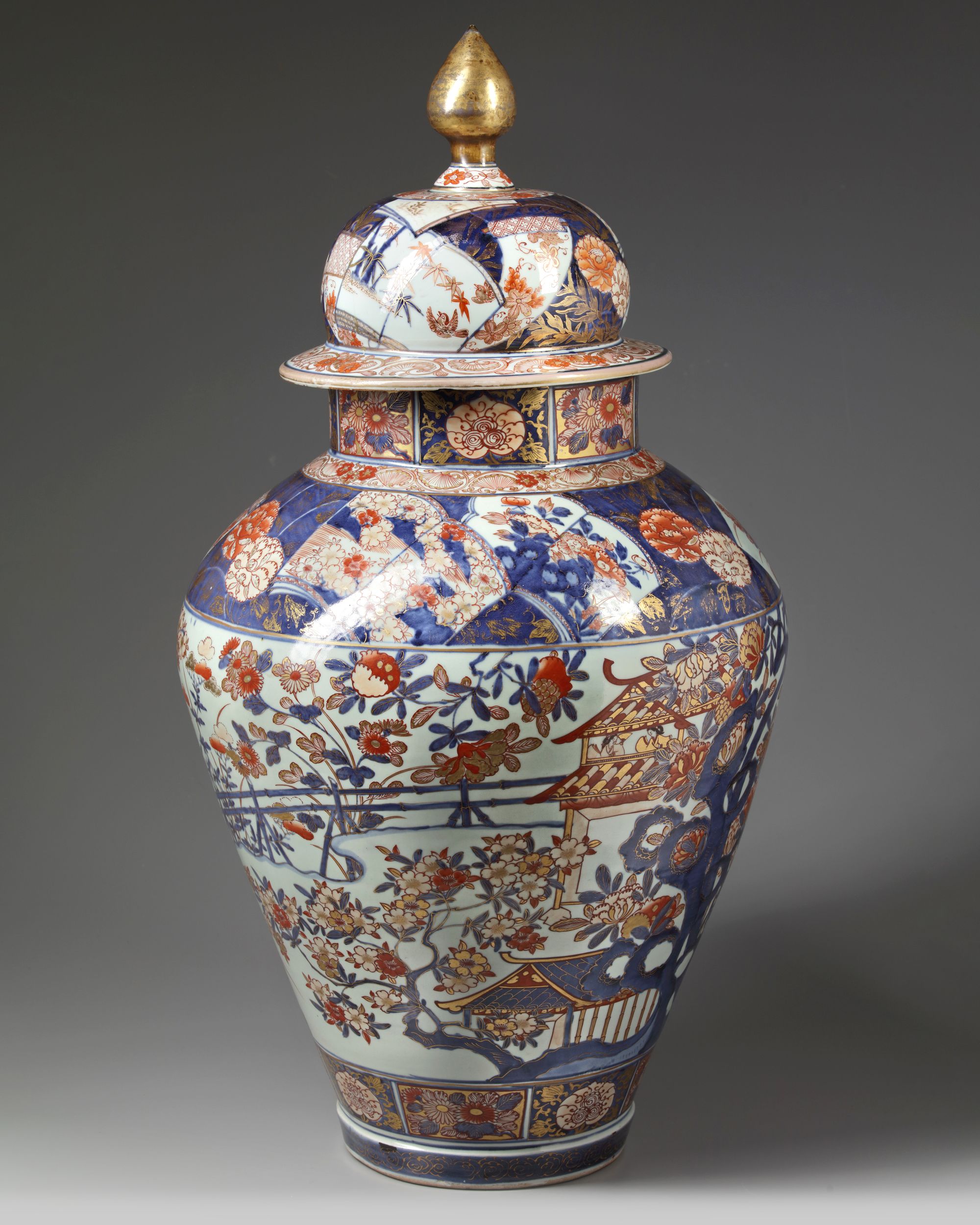 The vase is decorated with ladies in a terrace amongst large densely blossoming sakura, peonies and pomegranate, below a band of shaped cartouches enclosing further flowers and plants. The neck and foot are decorated with squared panels enclosing floral designs. The domed cover is similarly decorated. 58 cm. high (the vase) 81 cm. high (overall)