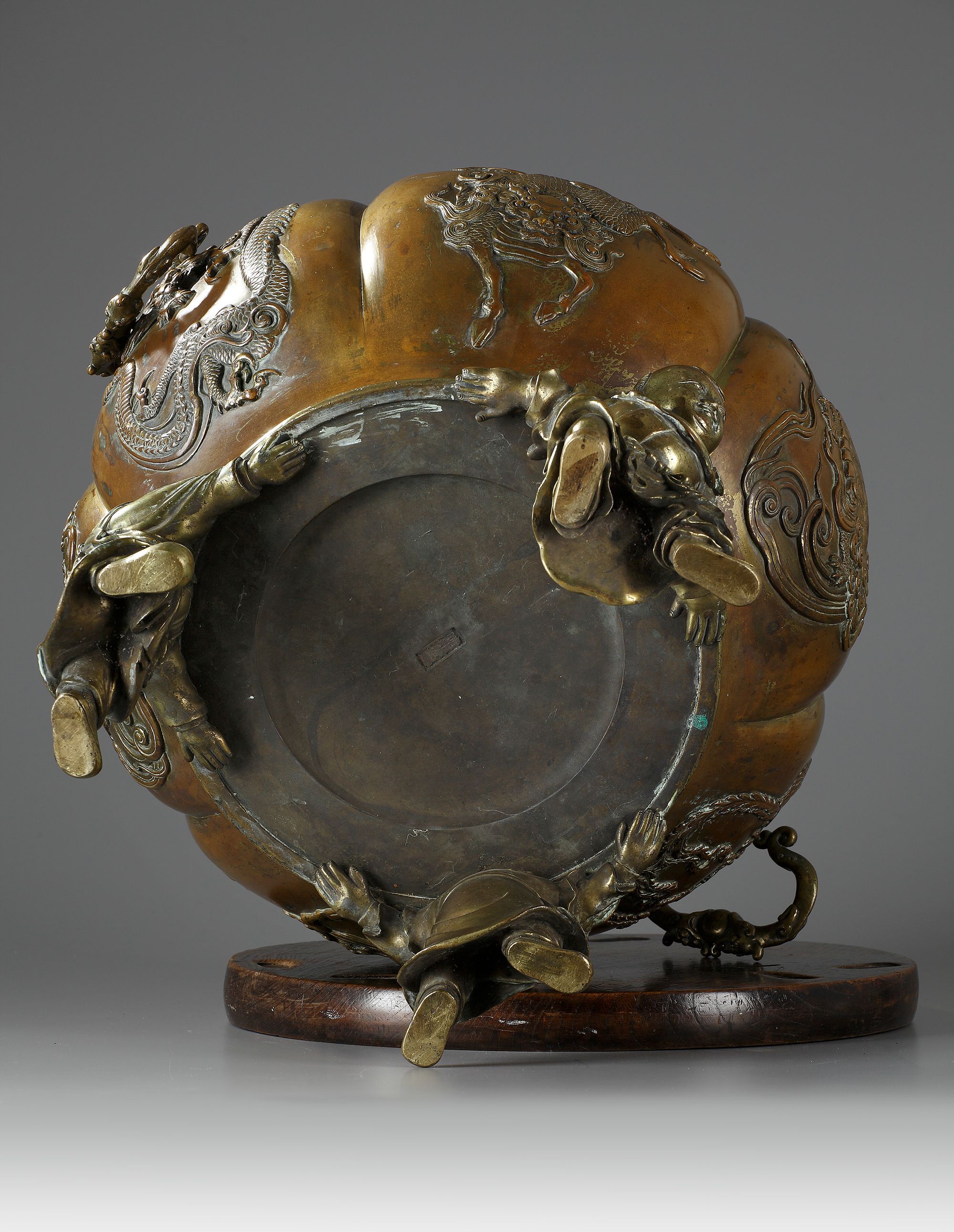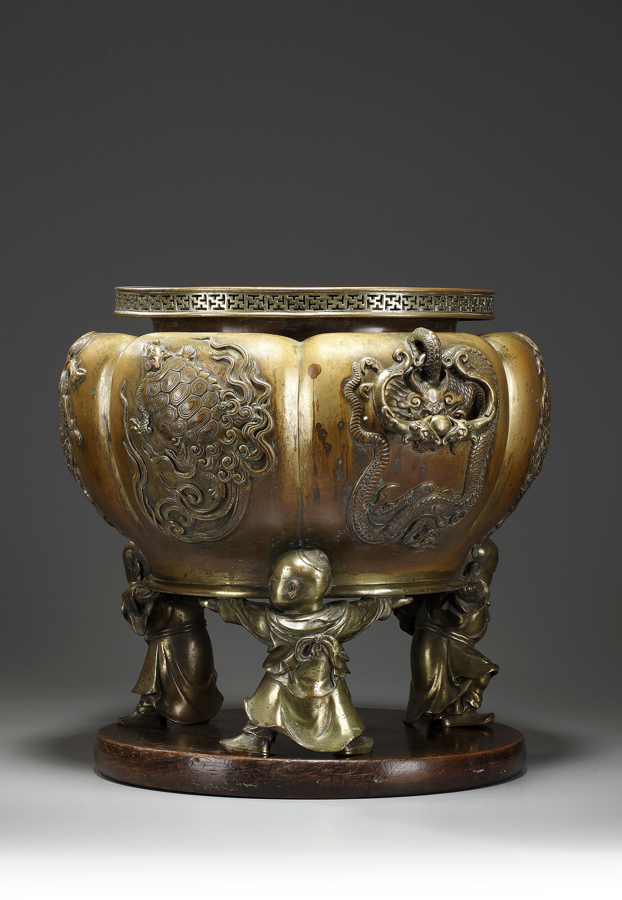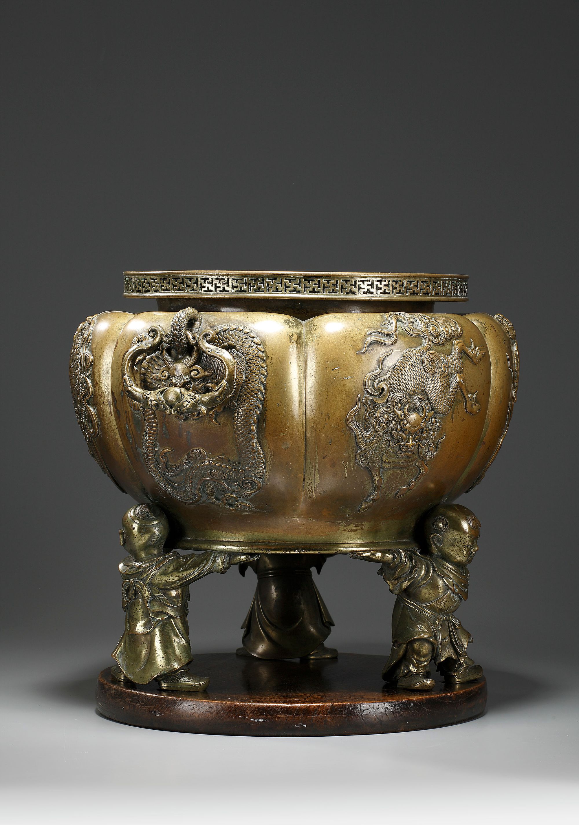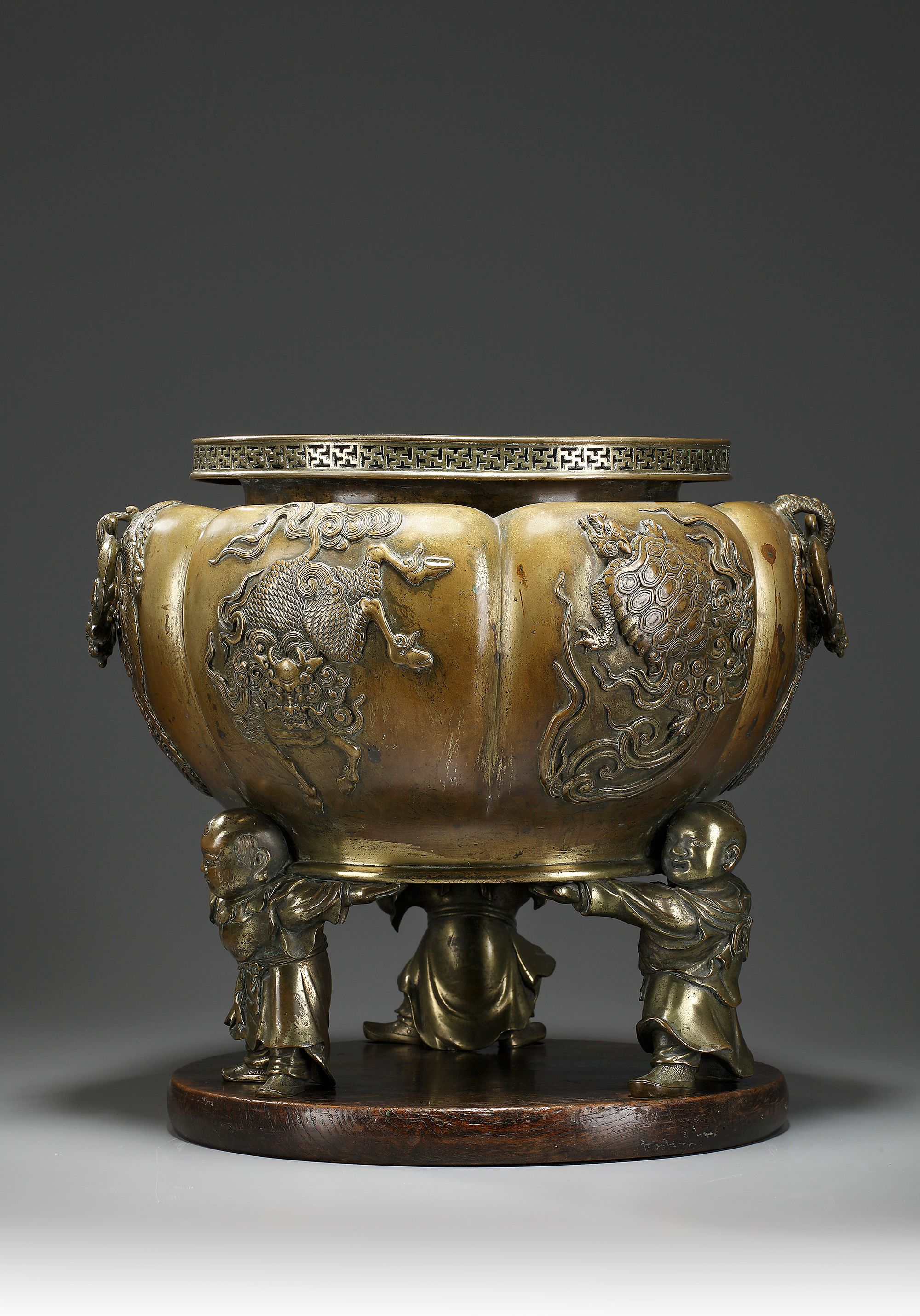 A massive bronze censer with fretwork rim. The lobed body with six panels depicting mythical animals and two dragon handles set to the body.