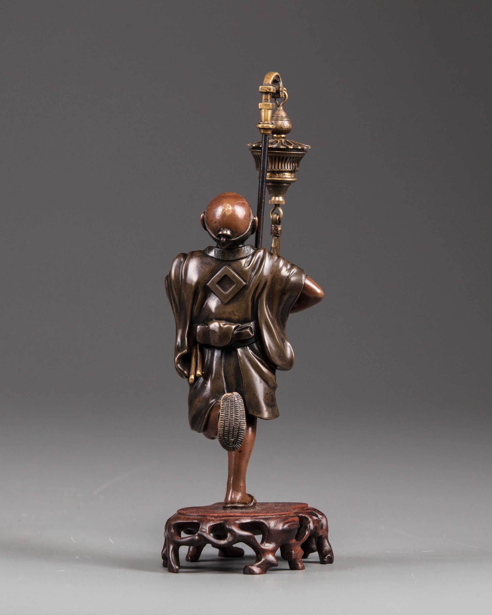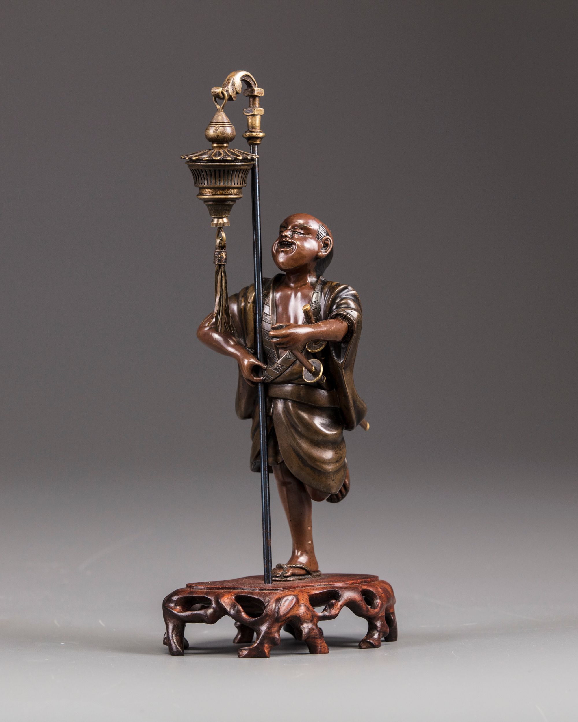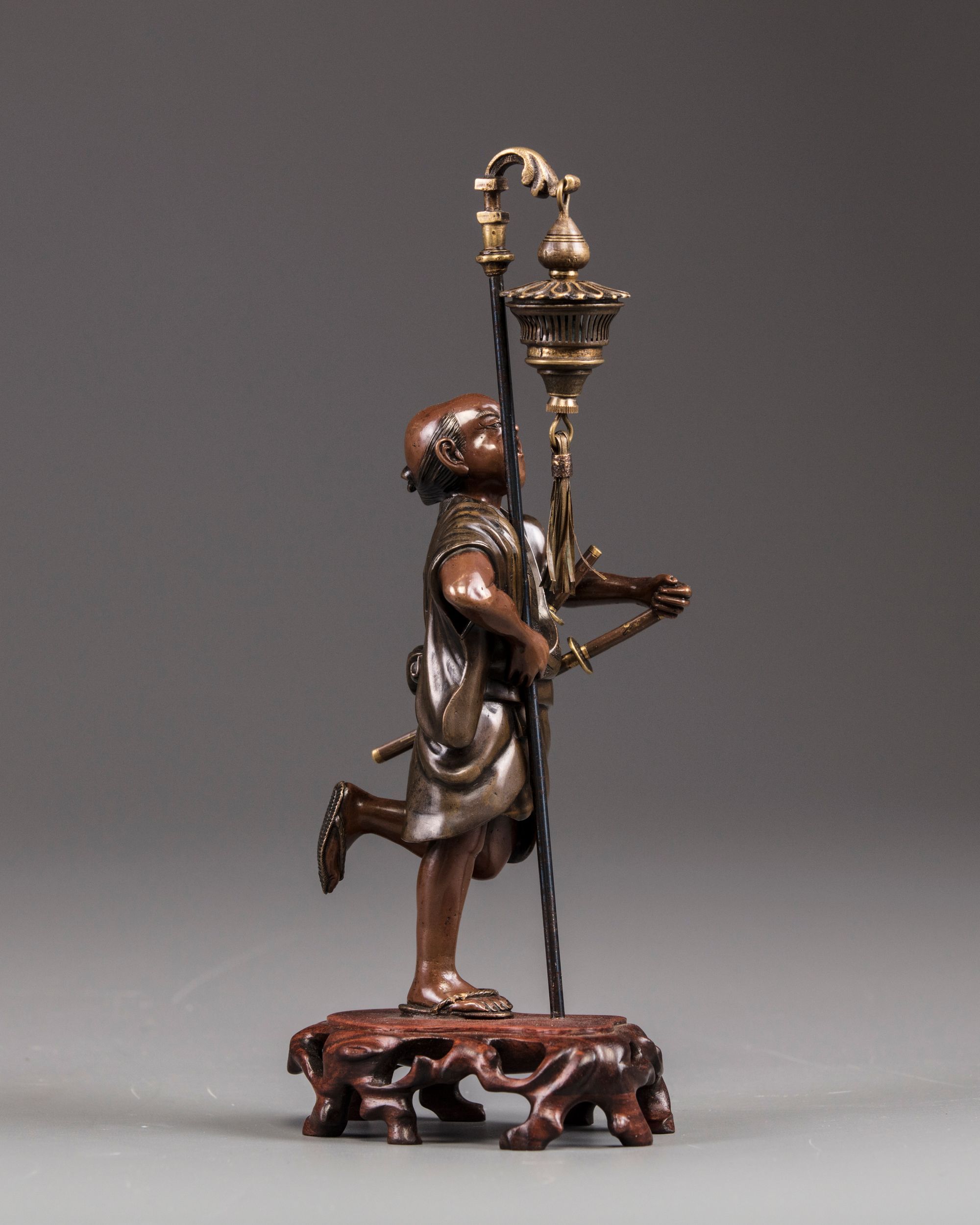 A bronze figure of a samurai holding a lantern