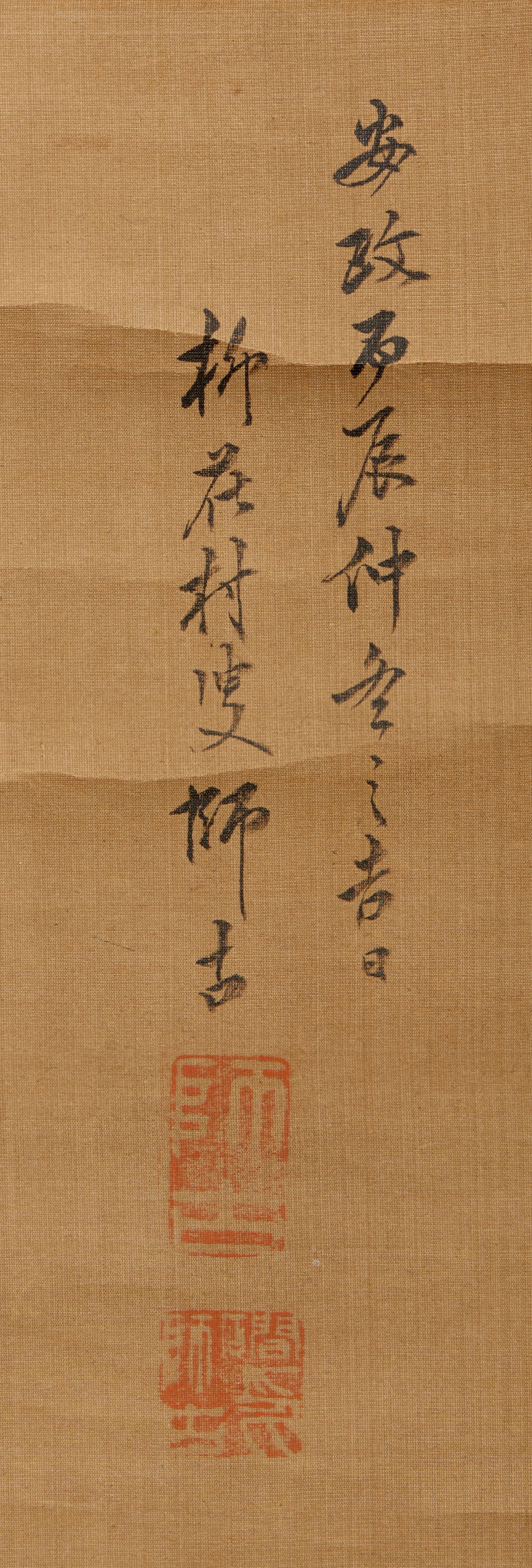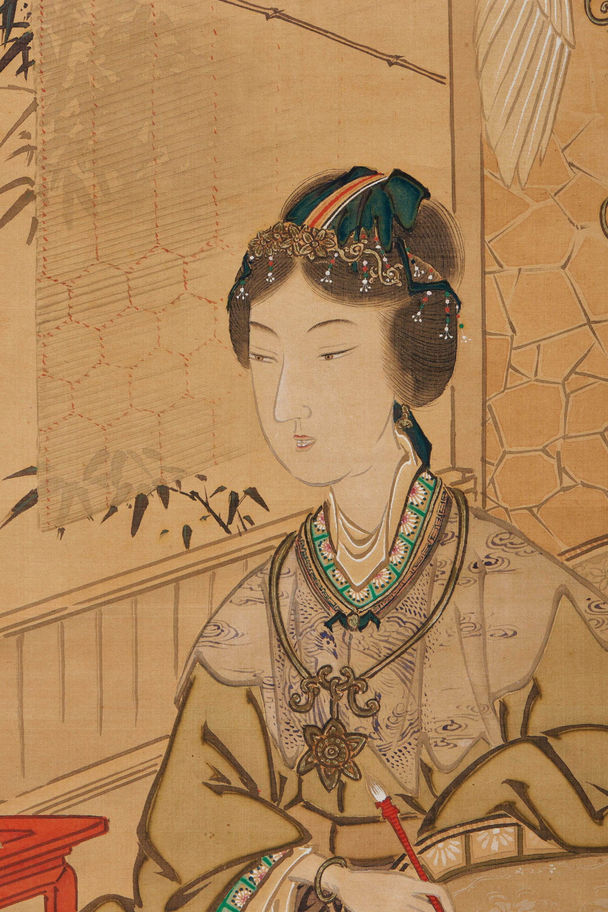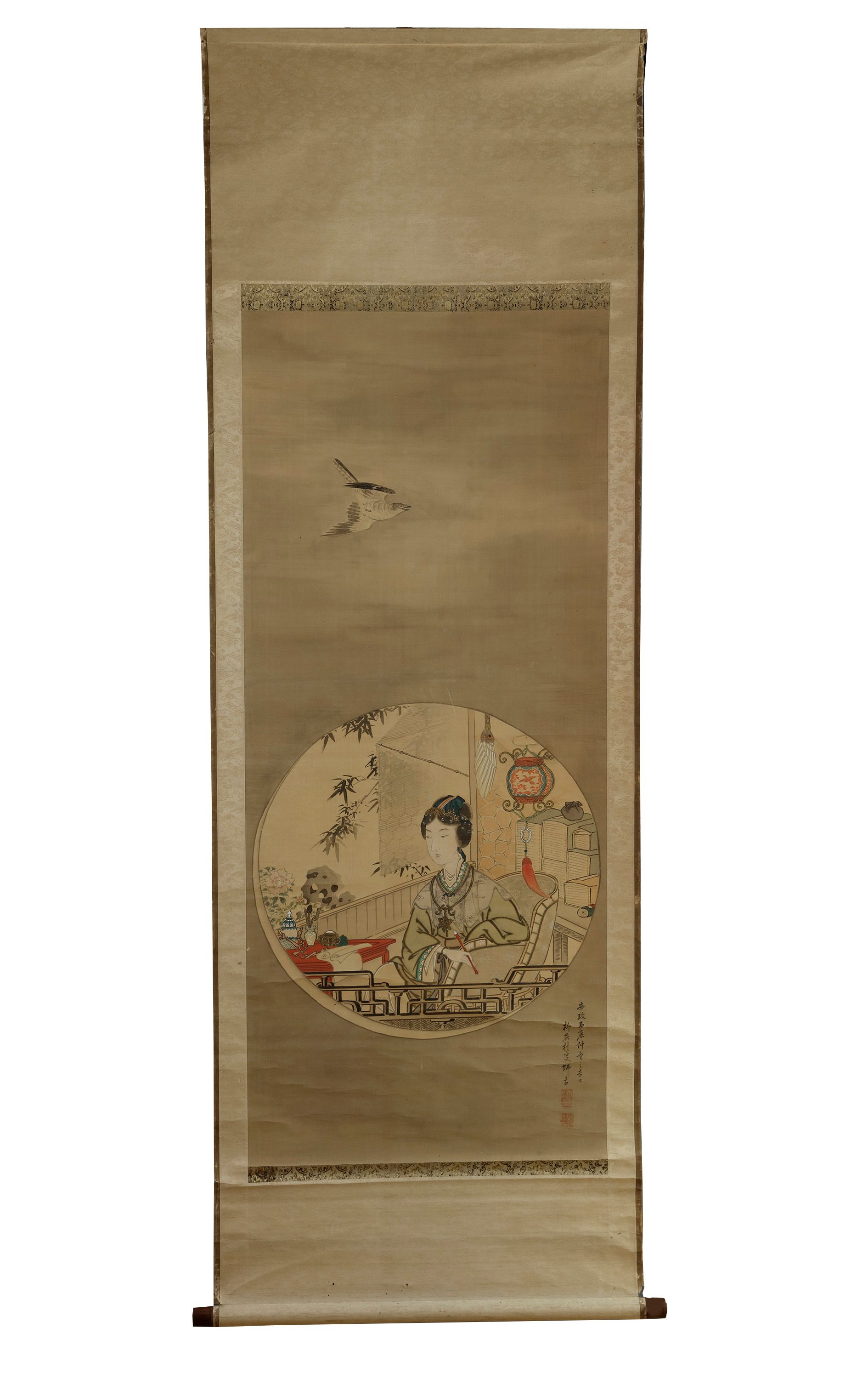 Hanging painting (kakejiku) with a polychrome painting on silk depicting an elegant Chinese lady sitting in front of her writing desk seen thru a round window, dated Ansei 3 (1856) and signed Shiko with seals “Shiko” and “Hazama Shiko in”: names of Hazama Seigai (1811-1878) a painter from Nagato in Yamaguchi Province, in a box.