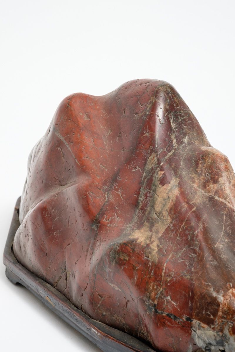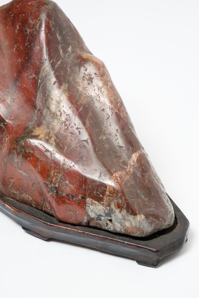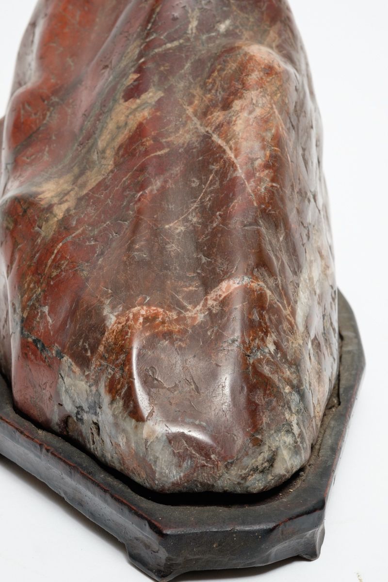 A Suiseki landscape stone, red with grey-white veins polished stone in the shape of a mountain on a wooden tray.