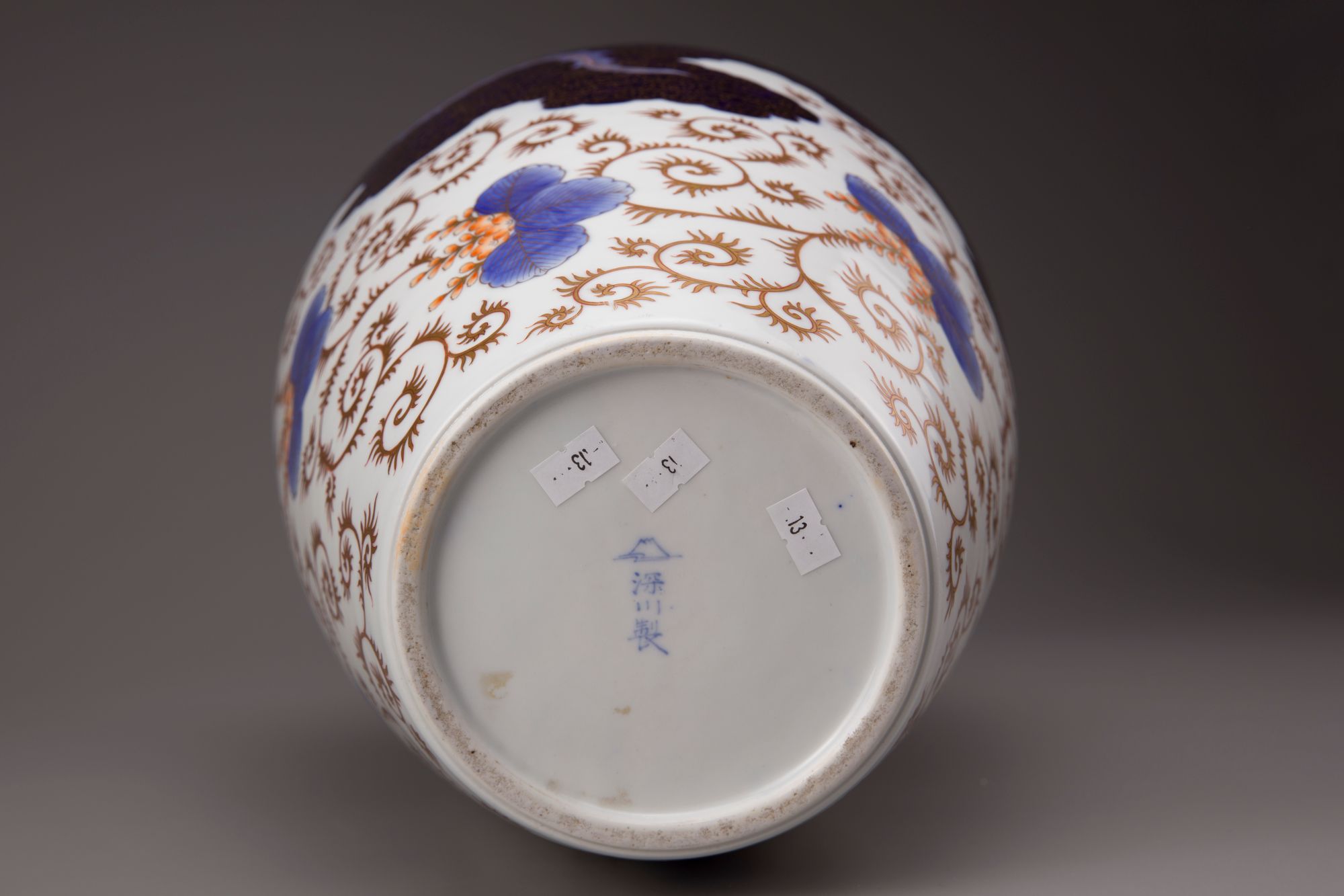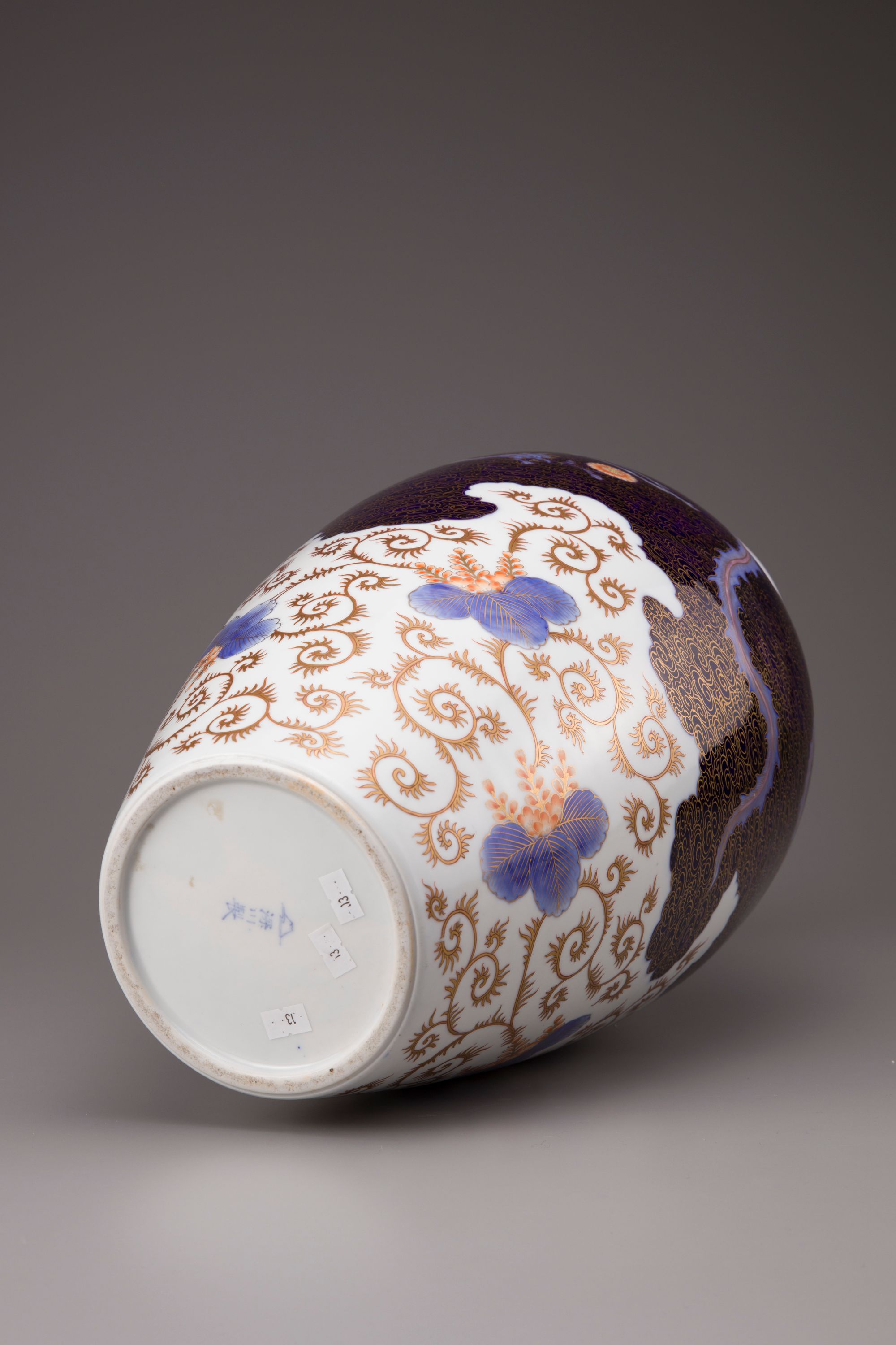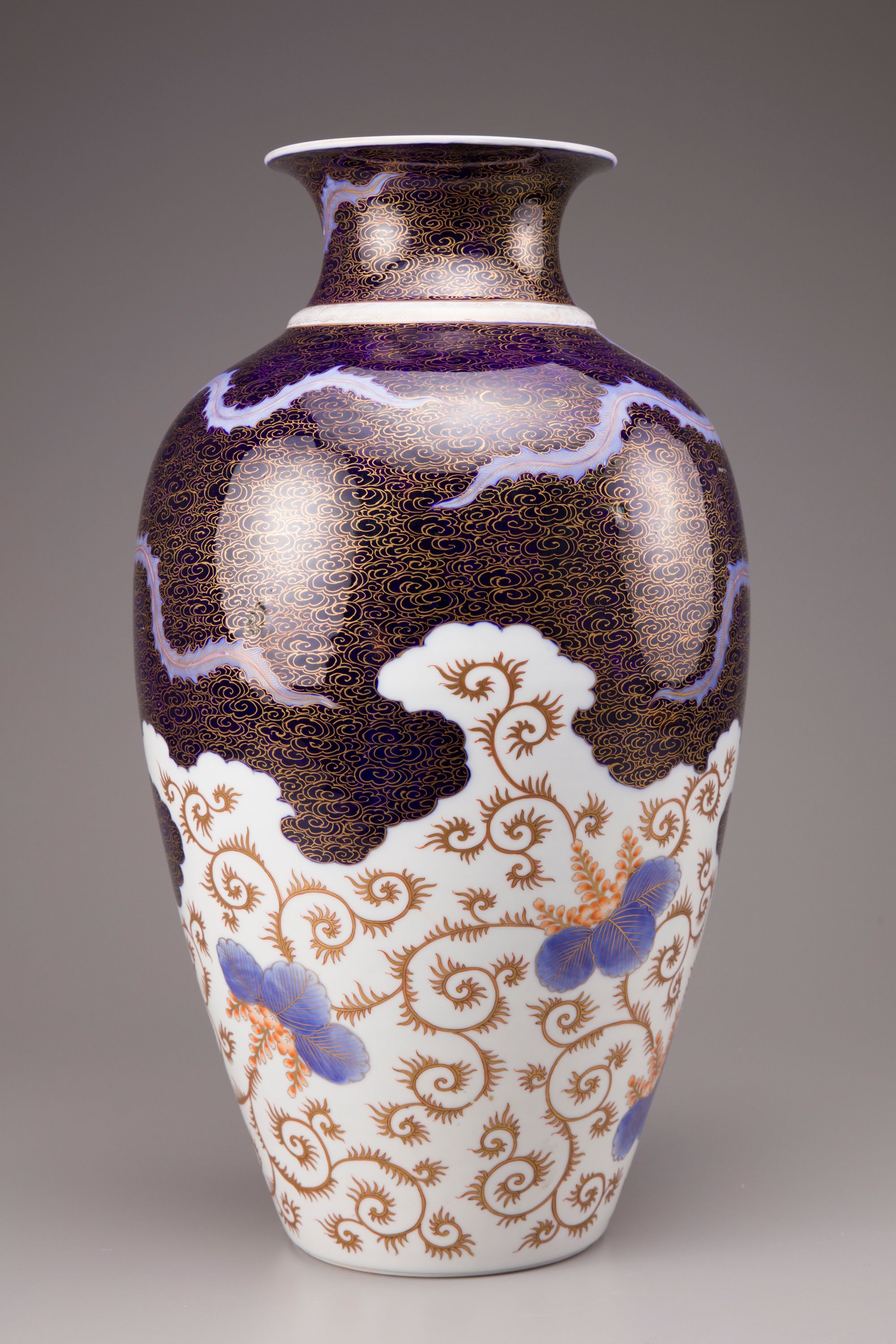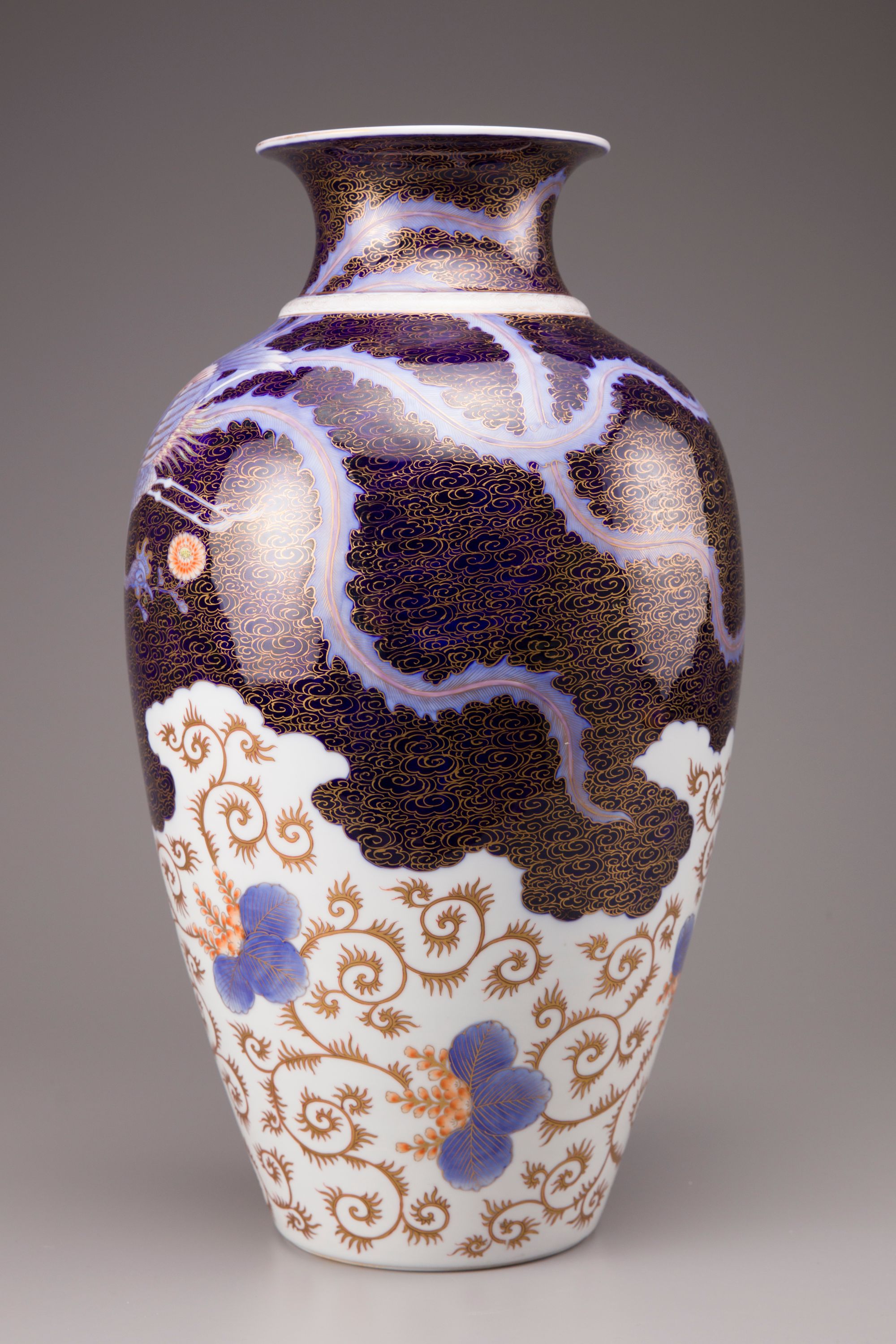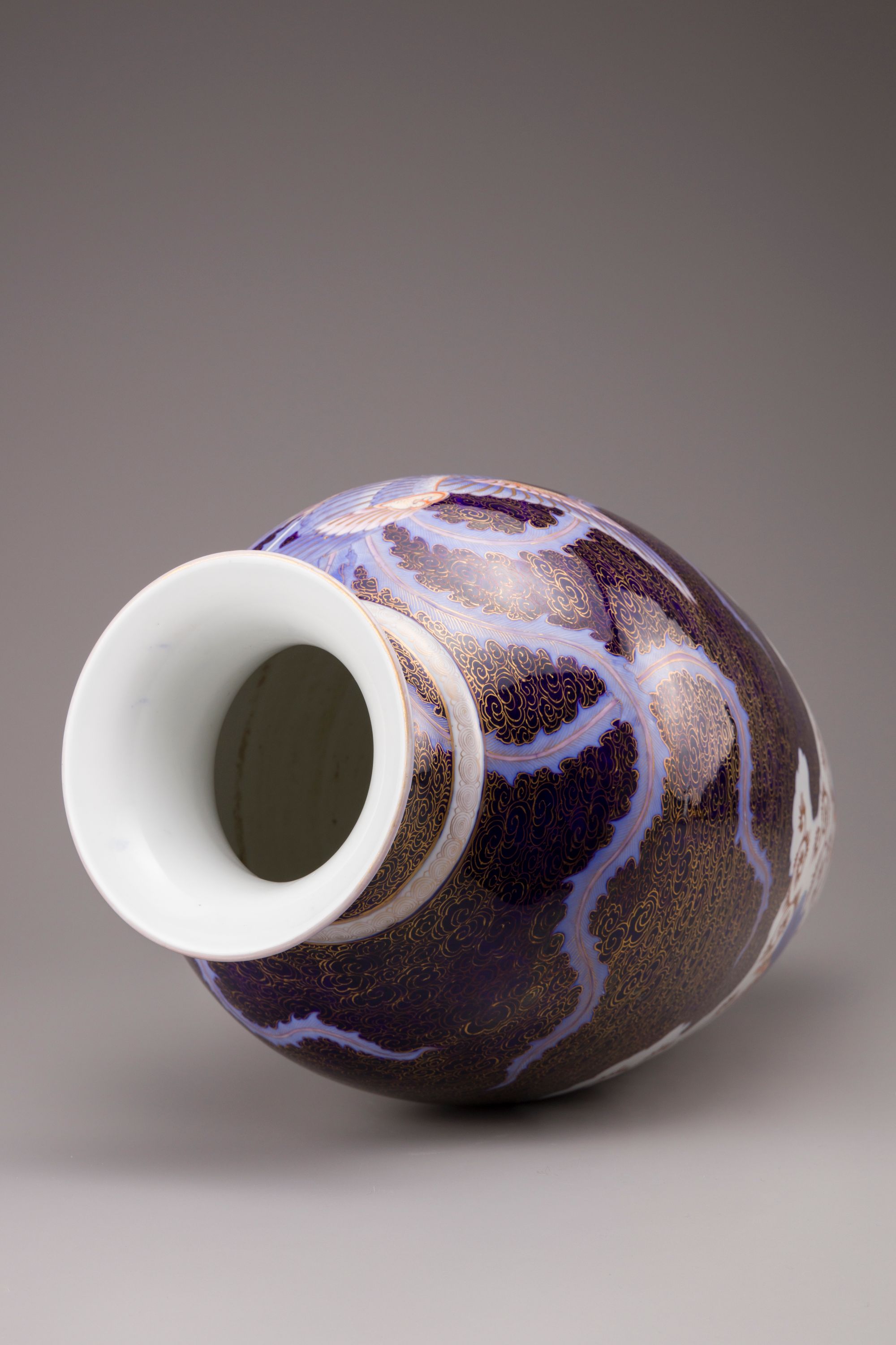 Ovoid shaped vase with short neck and flaring mouth, decorated with a phoenix and flower scroll in underglaze blue with blue, purple and orange enamels and gilt.