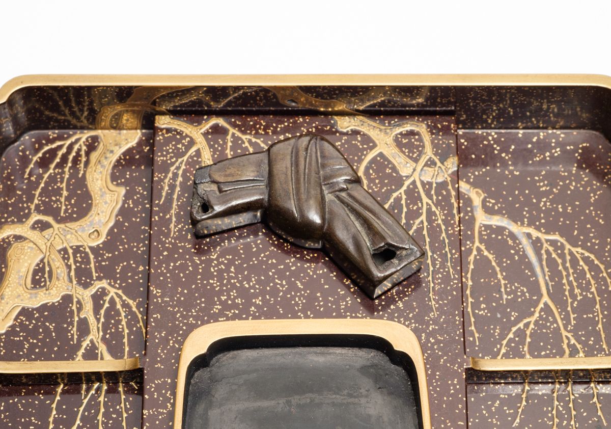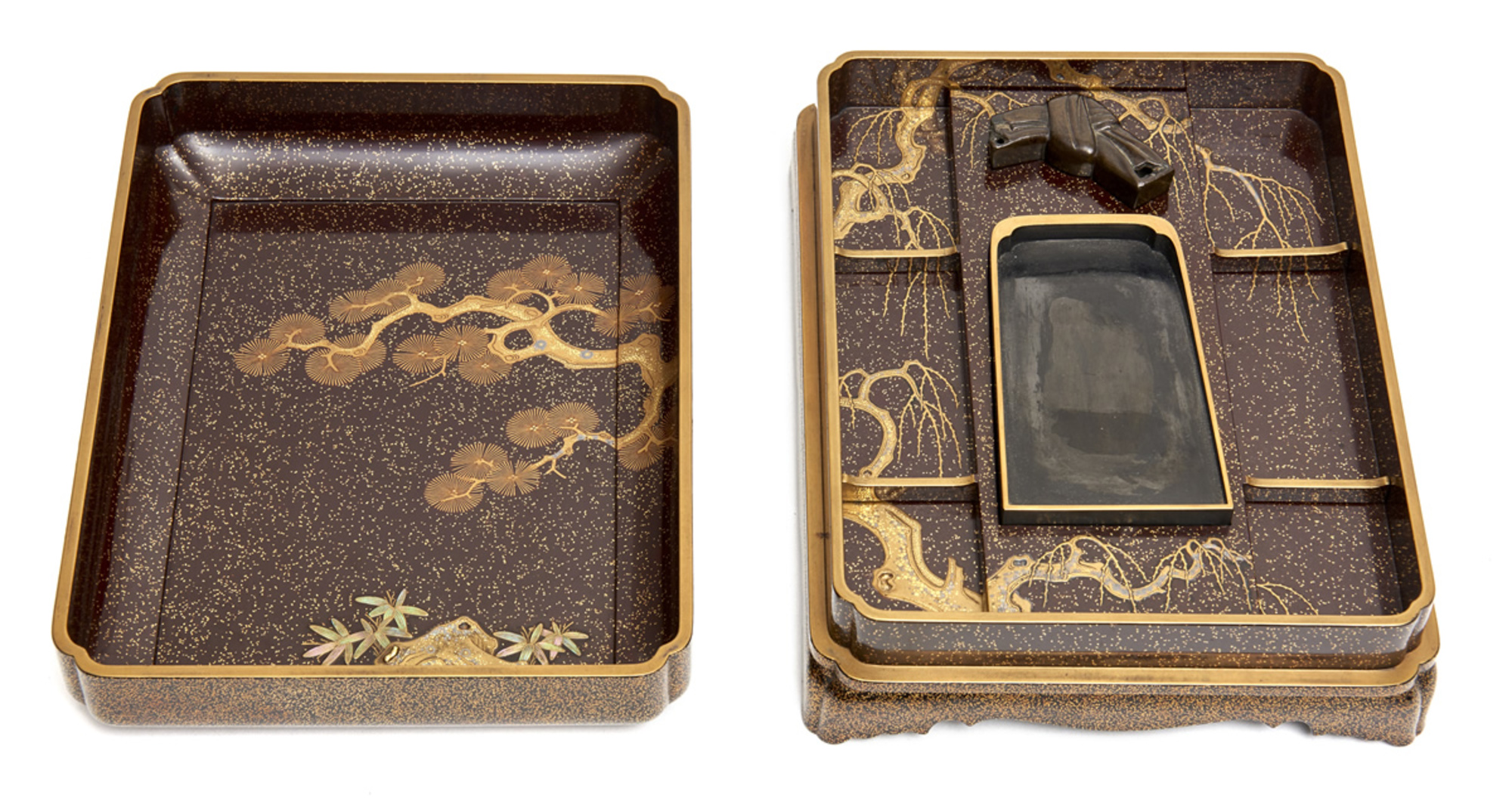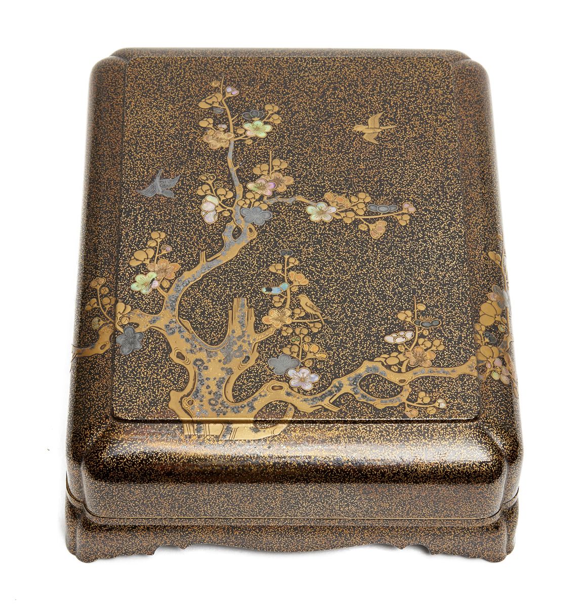 An important lacquer ware writing box (suzuribako) on four corner feet, all over decorated with sprinkled gold (nashiji). At the outside decorated with Japanese apricot blossom and an uguisu-bird, at the inside with a willow-tree design in gold with mother-of-pearl (raden) inlay work. The inside of the lid depicts pine-tree, bamboo and rock. Includes an ink stone and a water dropper in the shape of a pair of knots. In original box.
