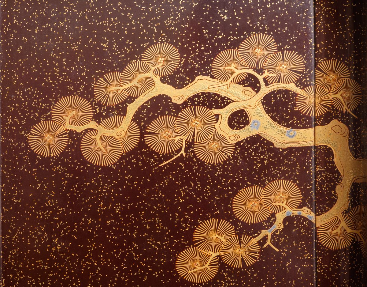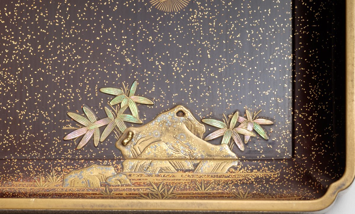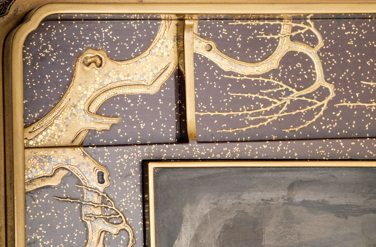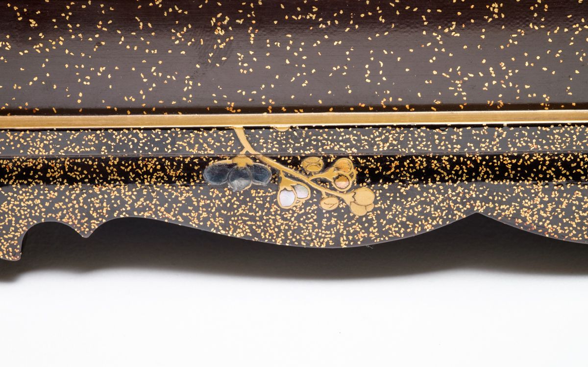 An important lacquer ware writing box (suzuribako) on four corner feet, all over decorated with sprinkled gold (nashiji). At the outside decorated with Japanese apricot blossom and an uguisu-bird, at the inside with a willow-tree design in gold with mother-of-pearl (raden) inlay work. The inside of the lid depicts pine-tree, bamboo and rock. Includes an ink stone and a water dropper in the shape of a pair of knots. In original box.