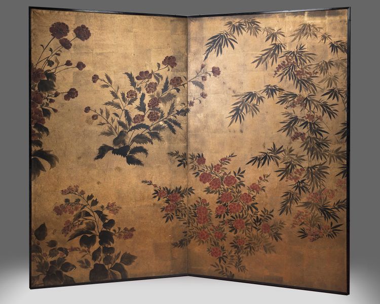 A Japanese two fold screen decorated with ink, color with monochrome floral paintings on goldleaf background.