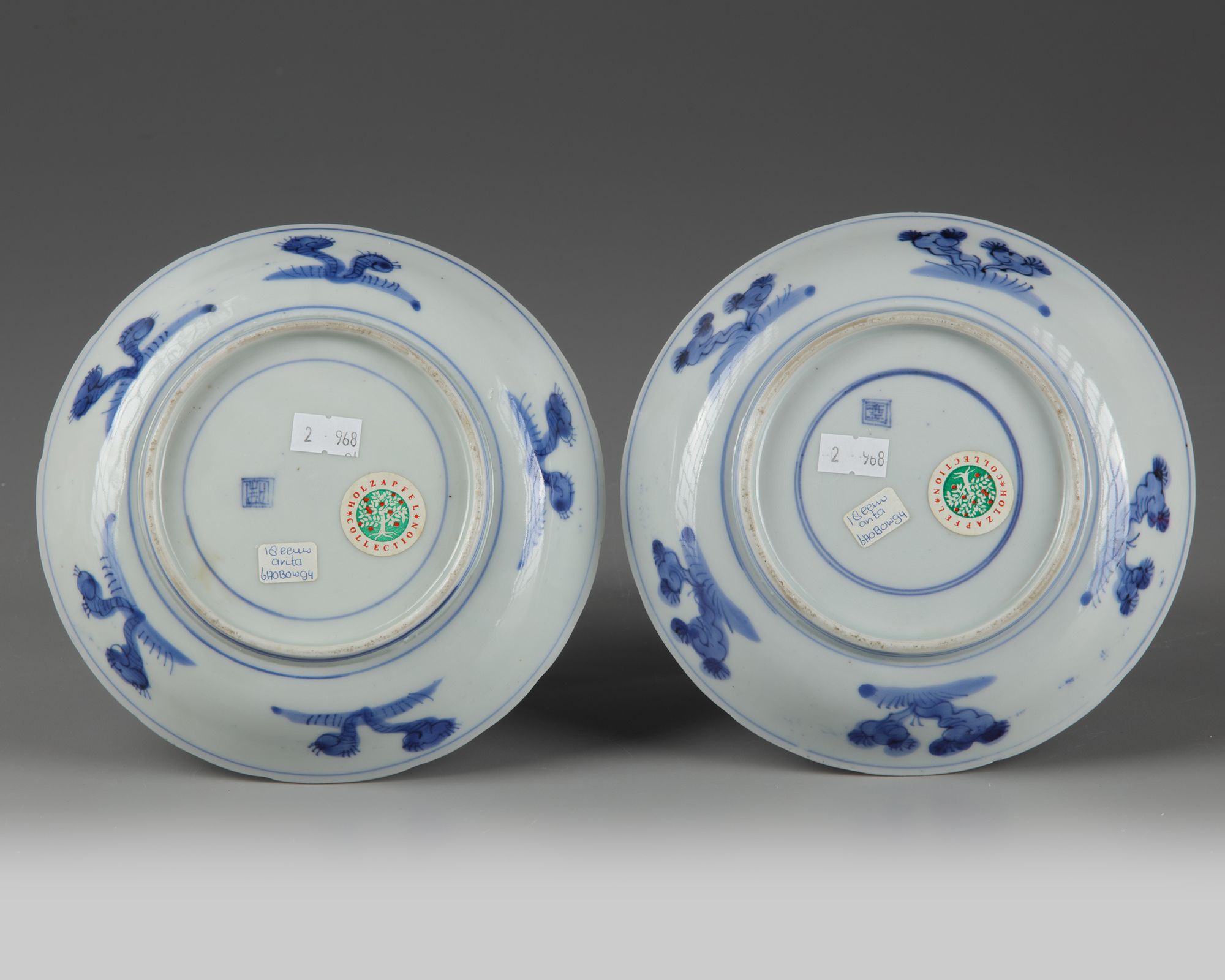 Saucer on a small footring. Decorated in underglaze blue with wo figures seated amongst flowers and trees in a landscape.