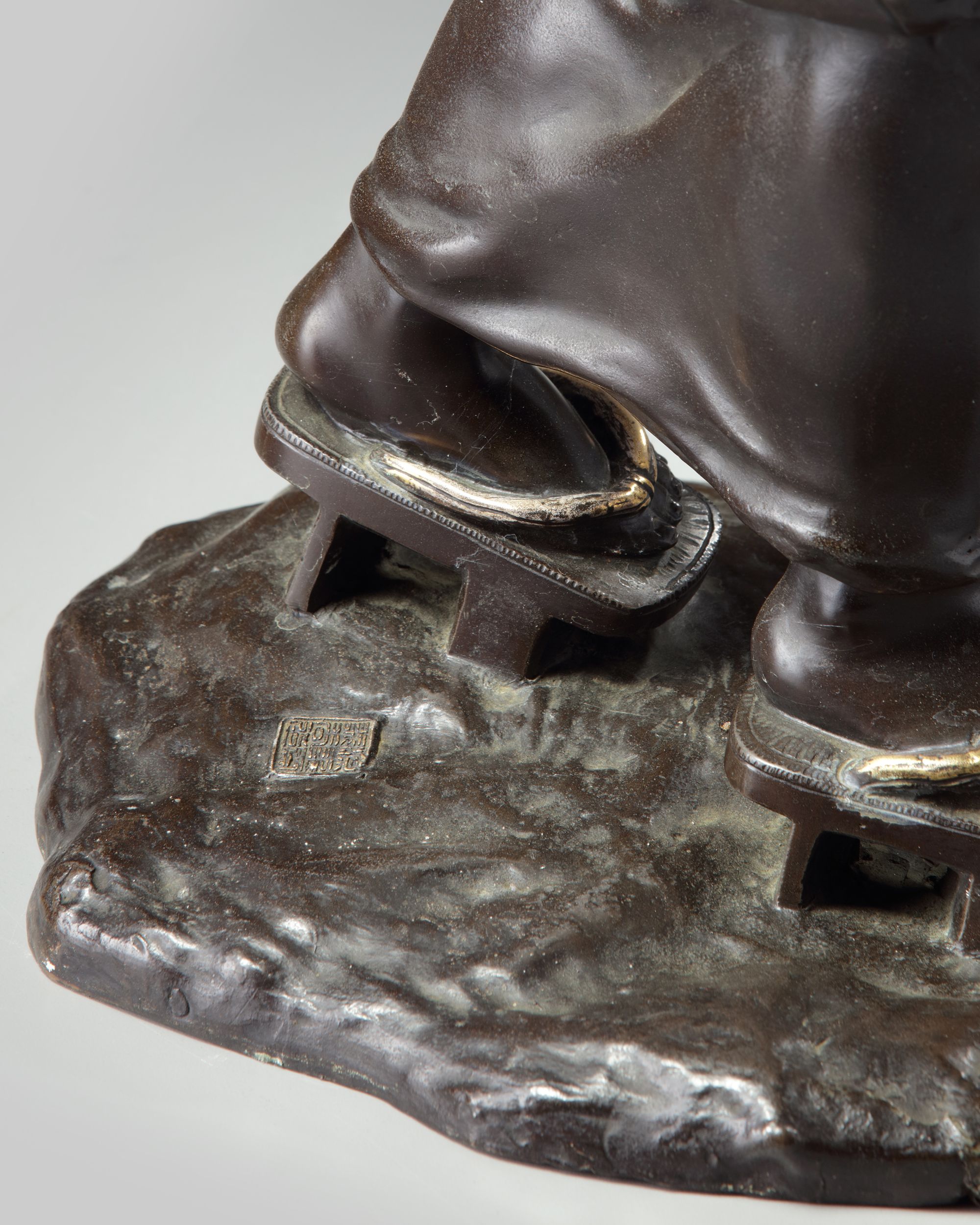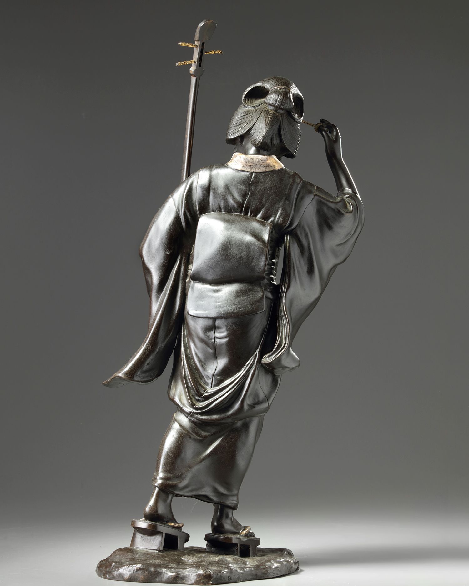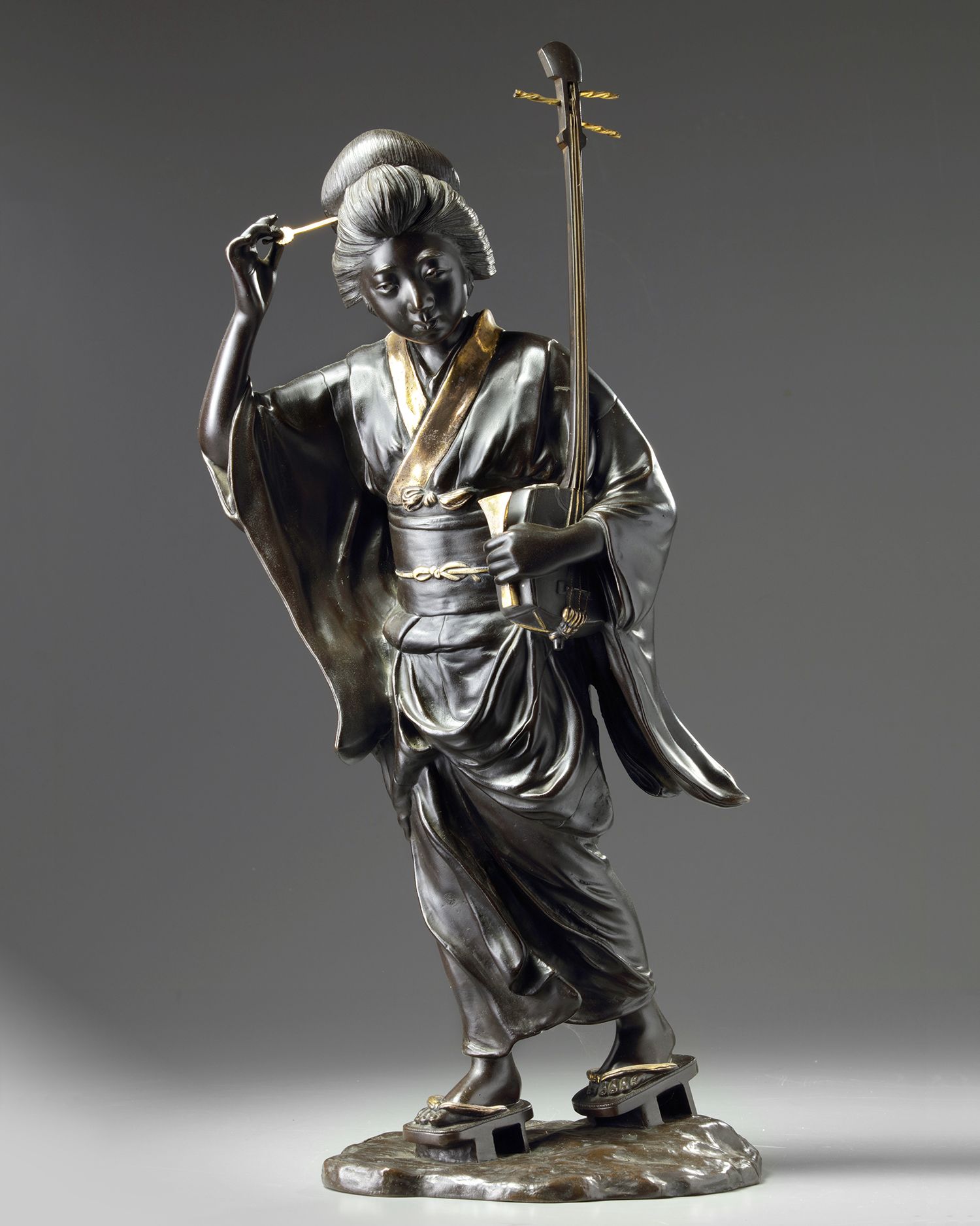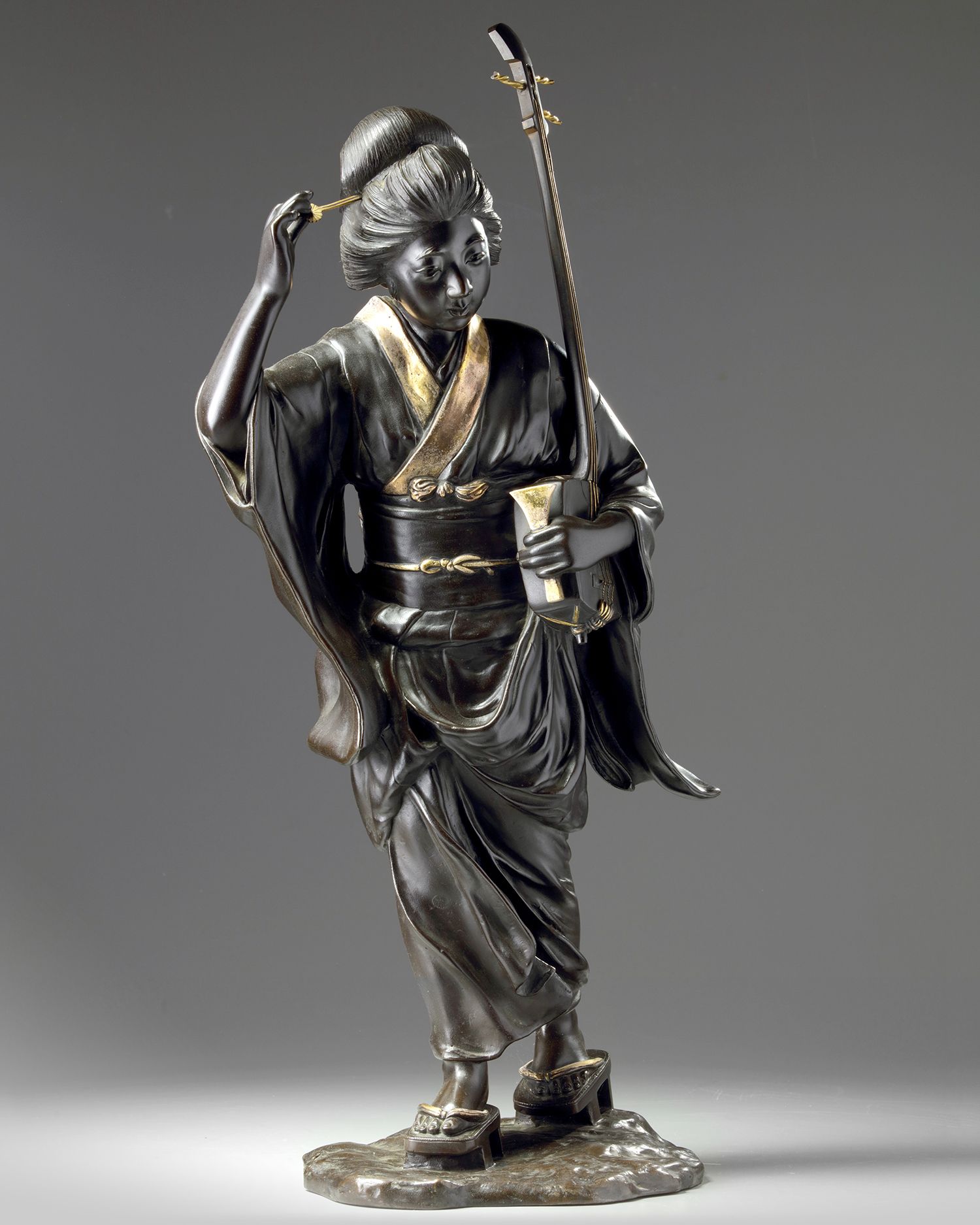 A bronze cast of a lady wearing a partial gilt kimono and holding a music instrument, with a comb in her hair and standing on an oval stand. Of Tokyo-school Meiji period around 1900.