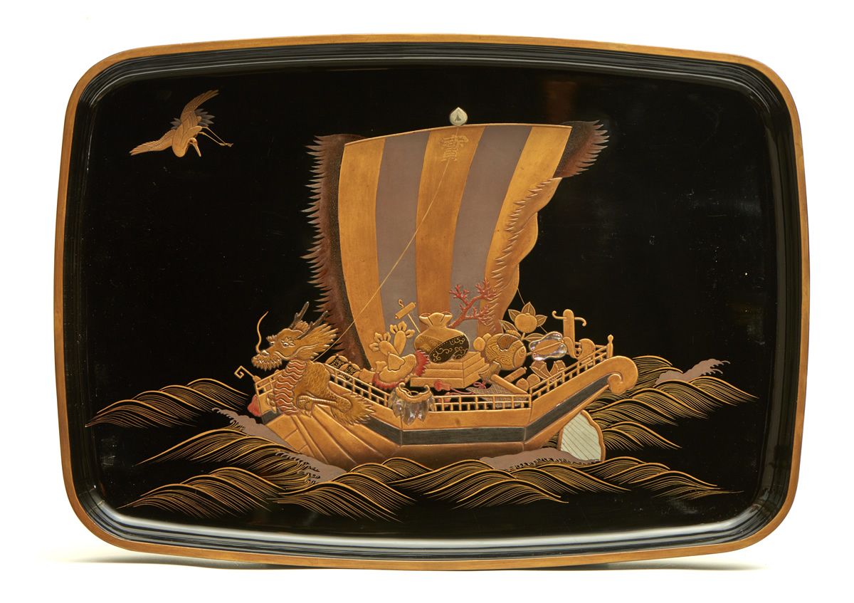 Black lacquered hirobuta-tray decorated with a dragon boat full auspicious articles in raised gold-, silver takamakie-lacquer with some red and some mother-of-pearl inlaywork. Bottom sprinkled gold-lacquer (nashiji). Gilded rim. In a box.