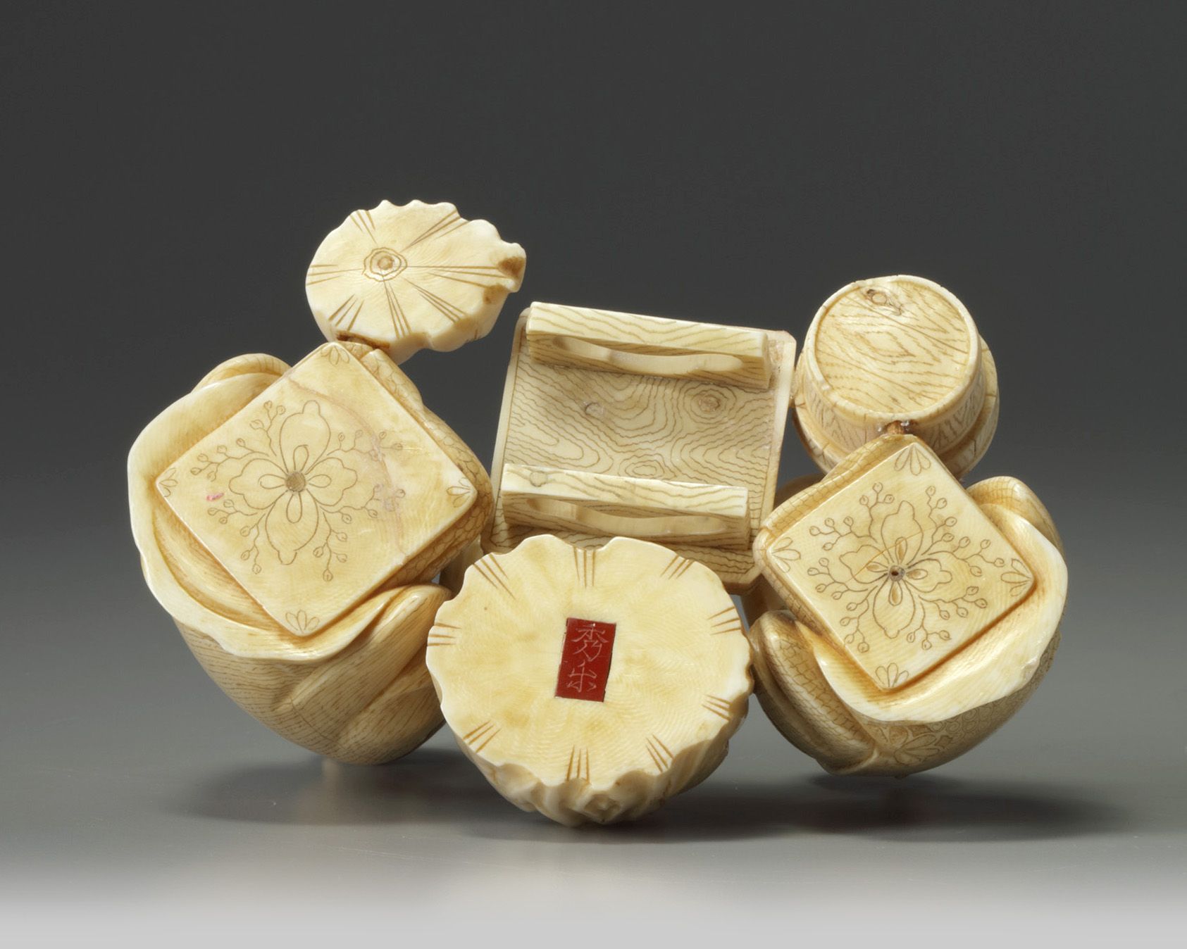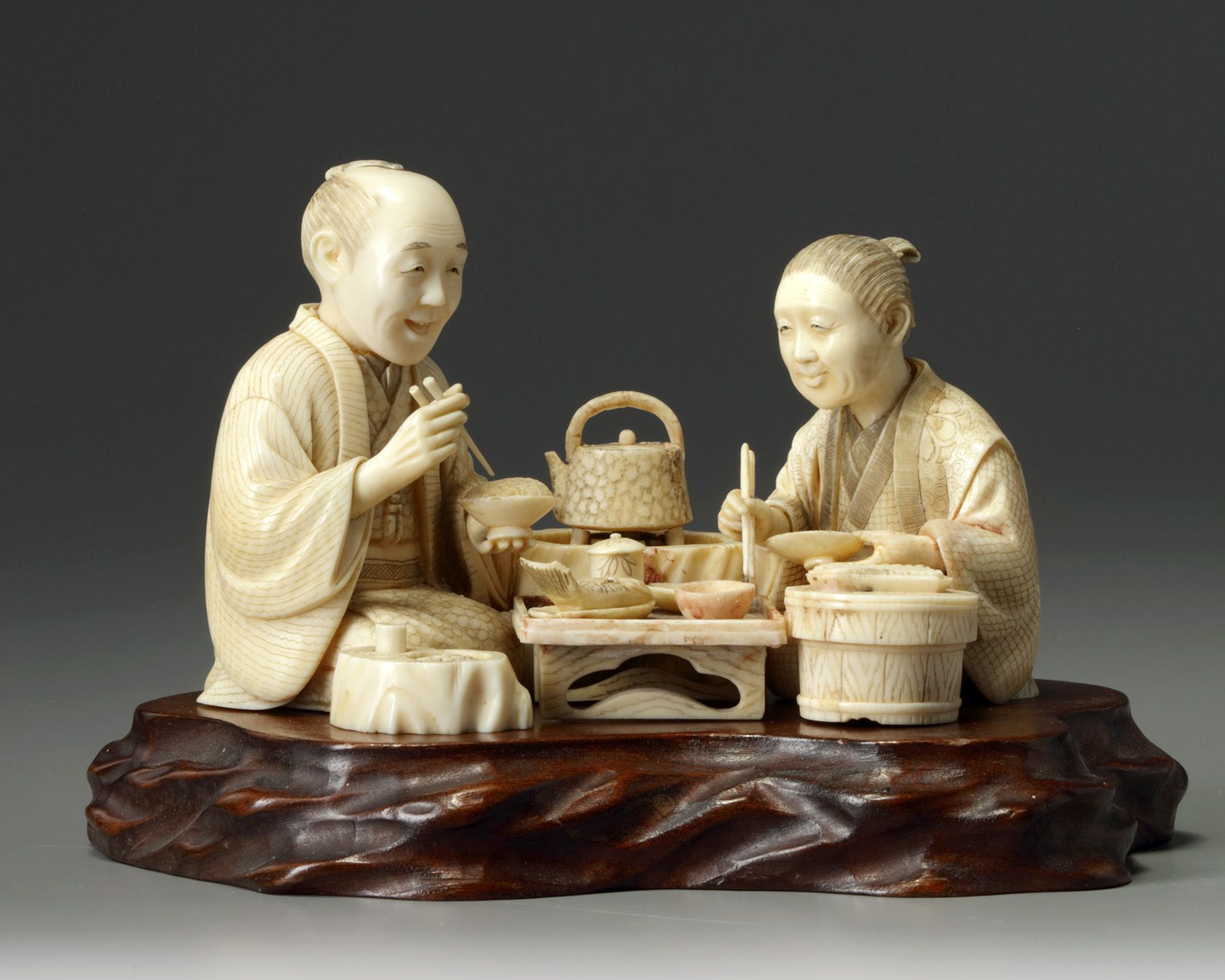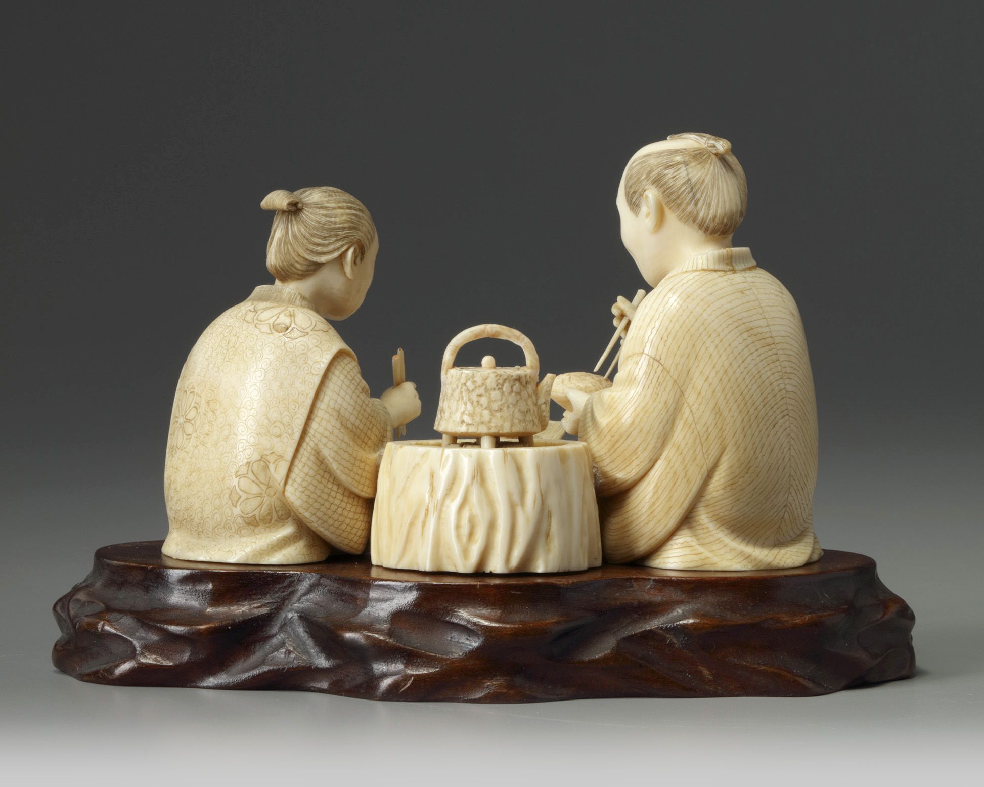 A Japanese Carved ivory okimono group, a couple knelt beside a teapot and a tray table, on a wooden stand.