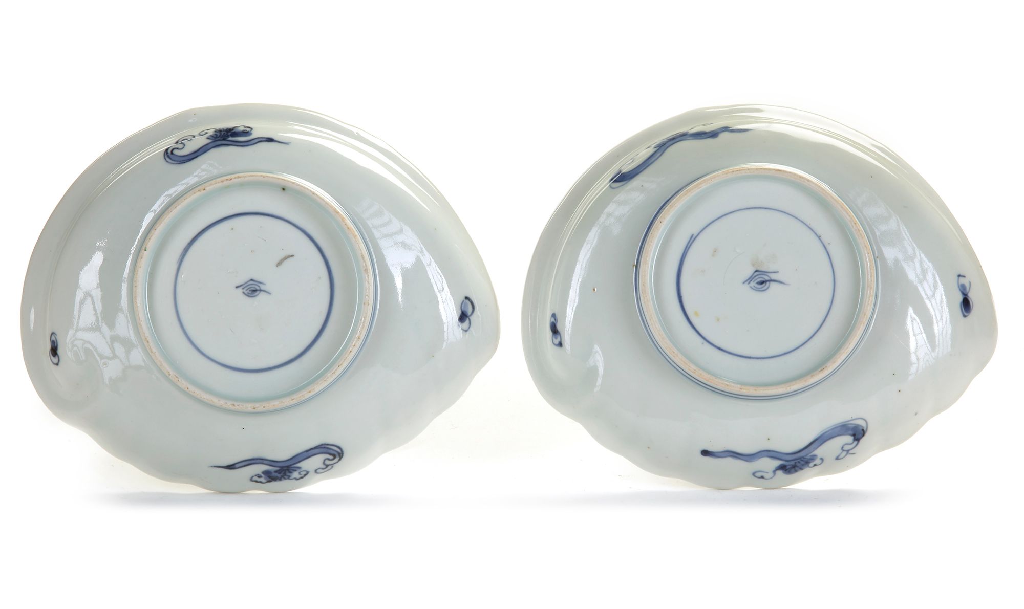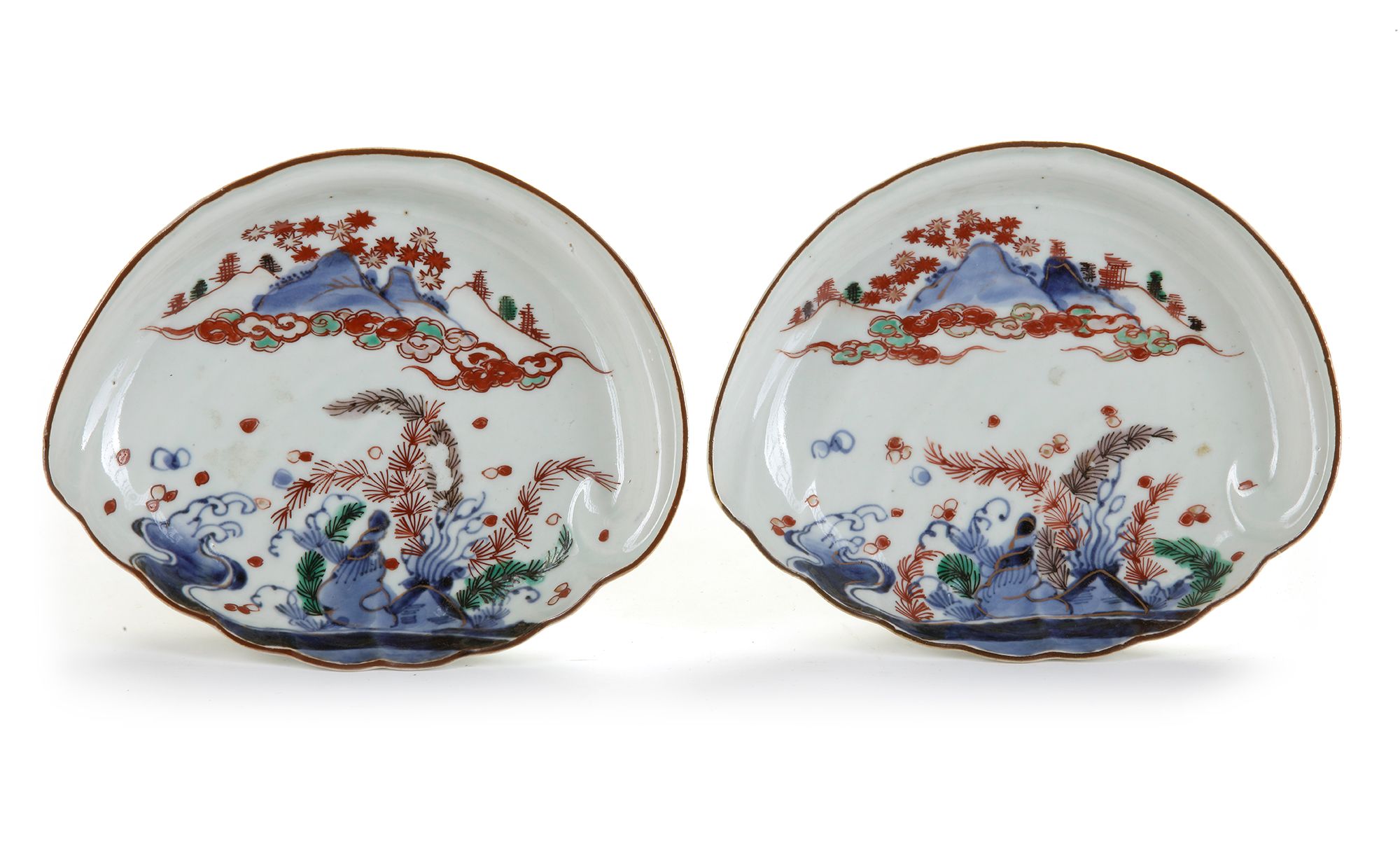 Oyster shaped dish in underglaze blue, red, green, aubergine and black enamel and gilt, decorated with plants, rock-work mountains and clouds.