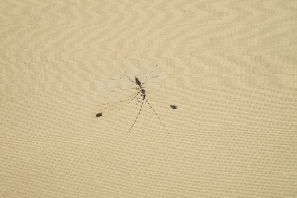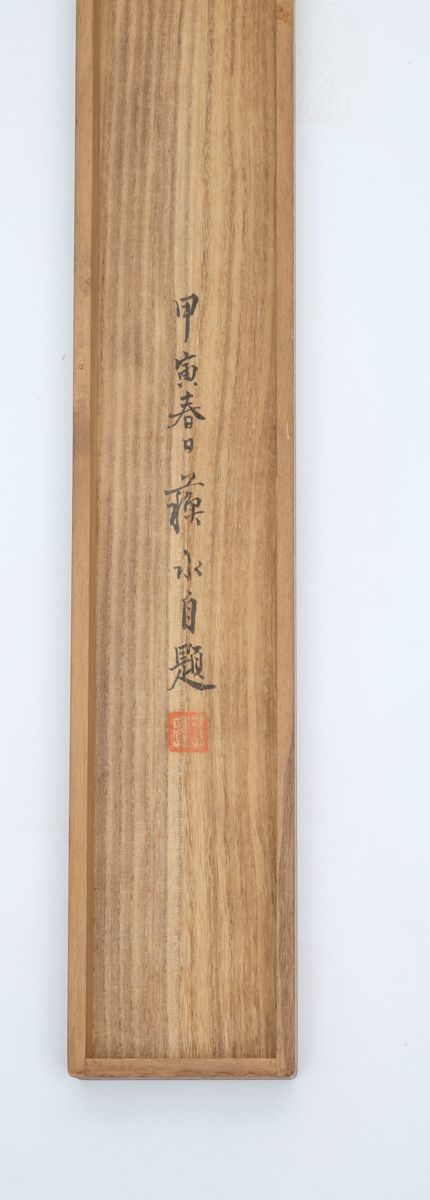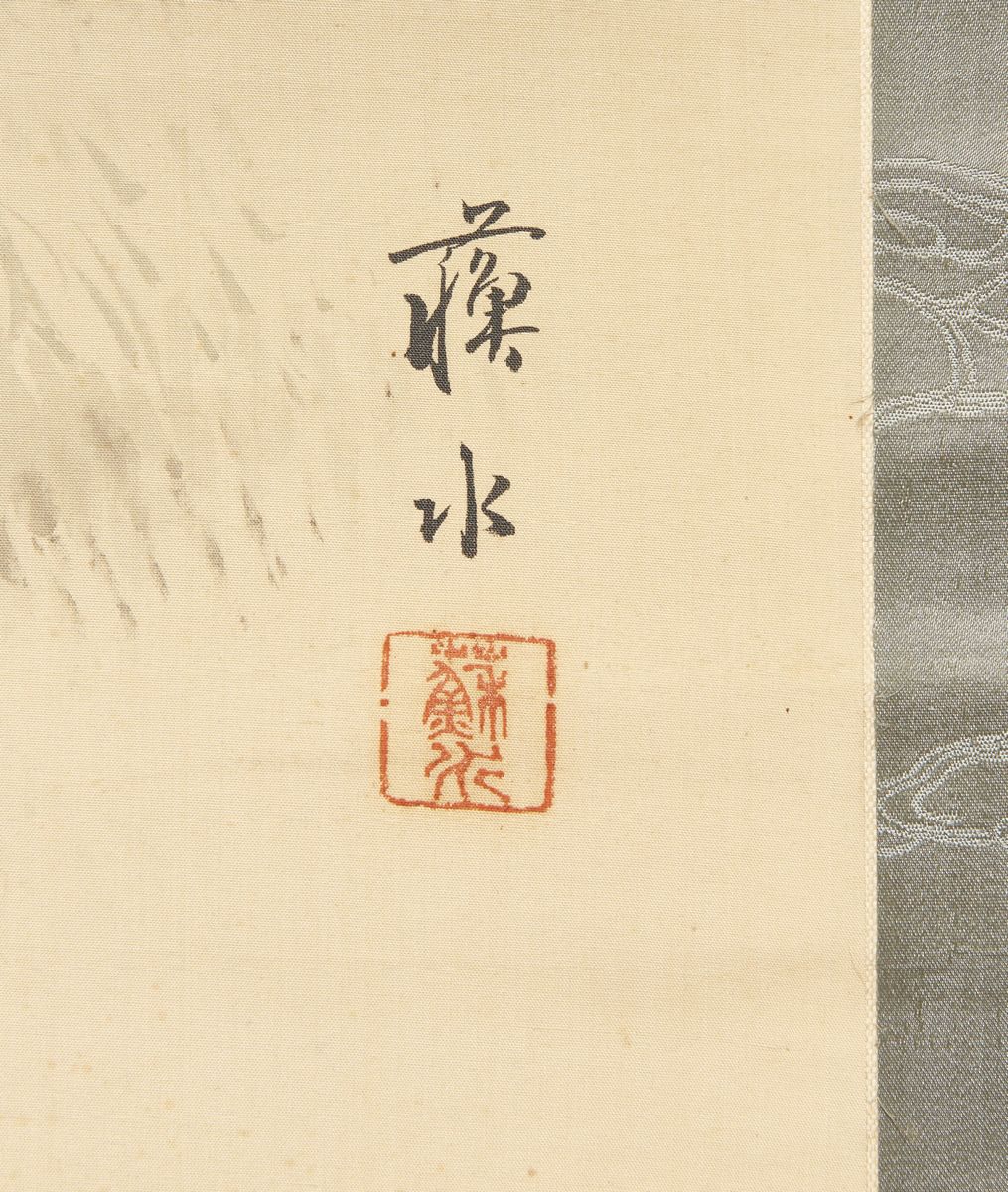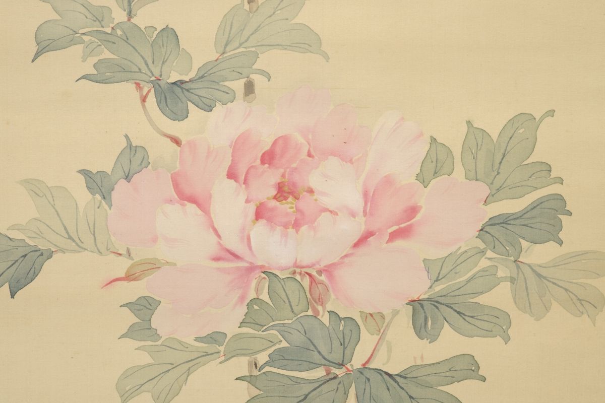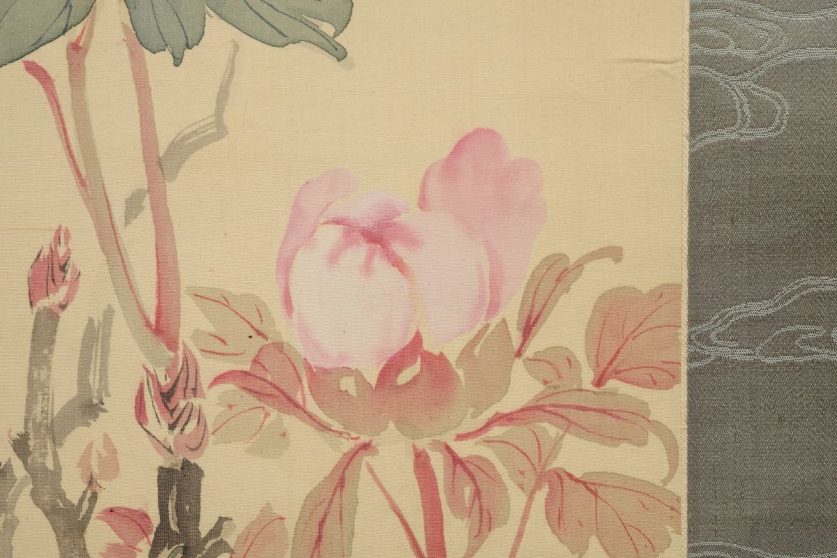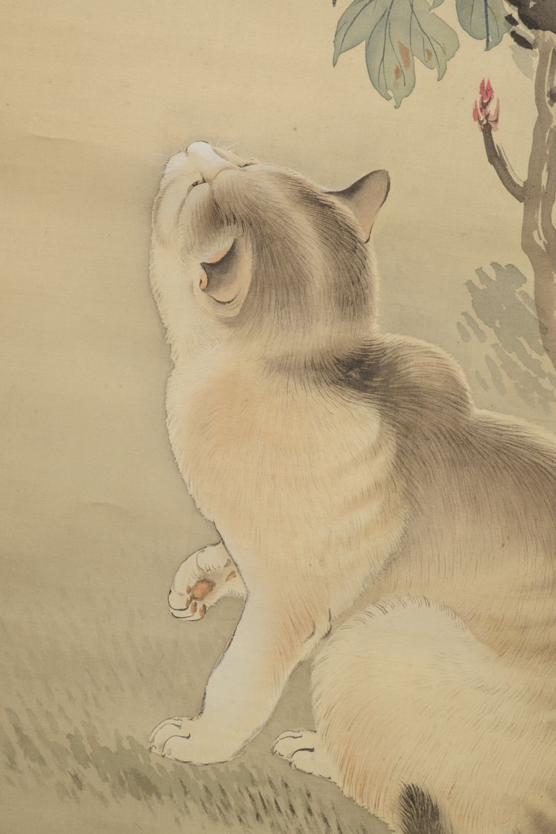 Polychrome hanging scroll painting (kakejiku) depicting a cat looking up at a butterfly in front of tree peonies in bloom behind a rock by the Nihonga and Nanga painter Okada Sosui (1880-1942), signed and sealed: Sosui. In a box dated the year kôin (1914) and signed by the painter himself.