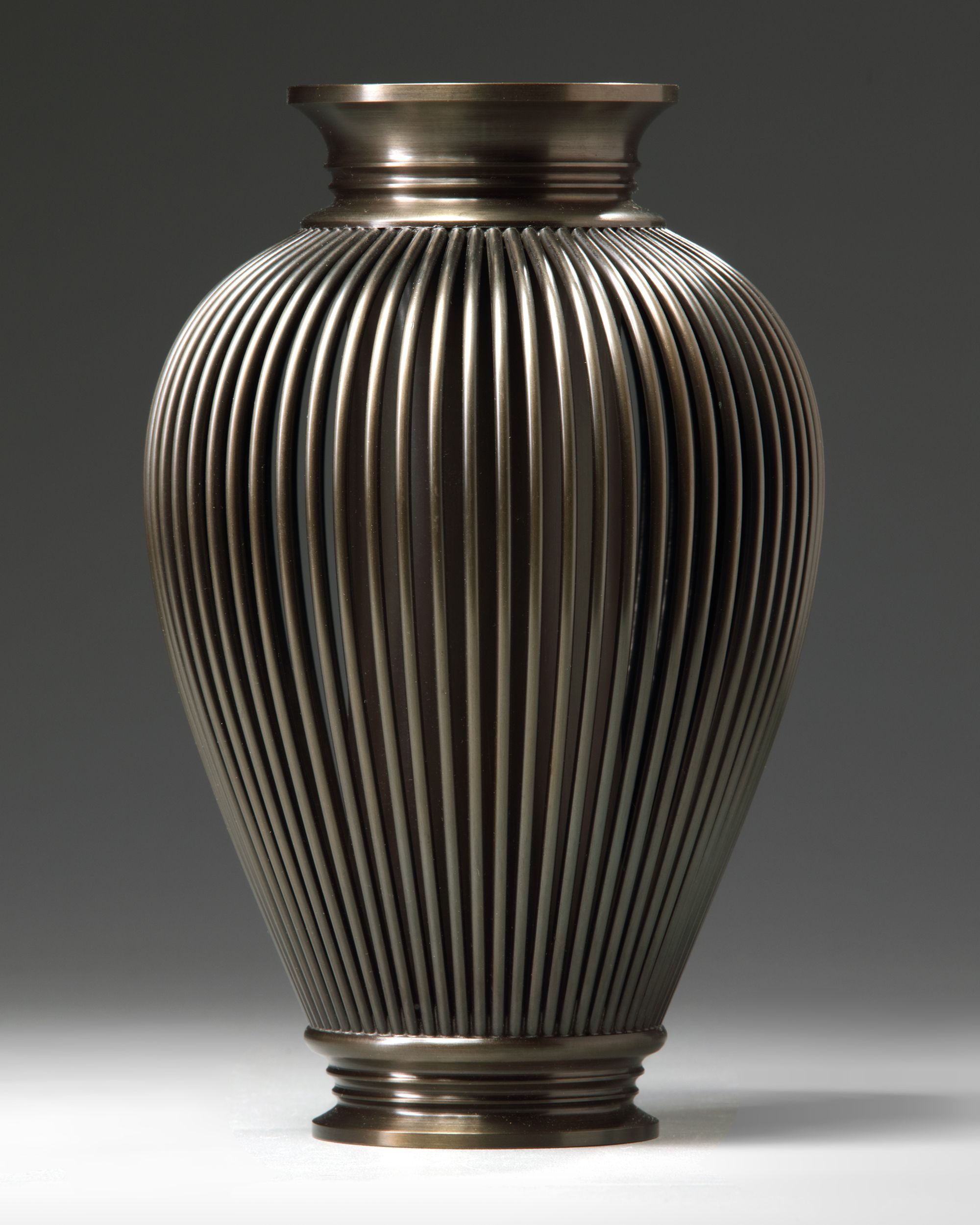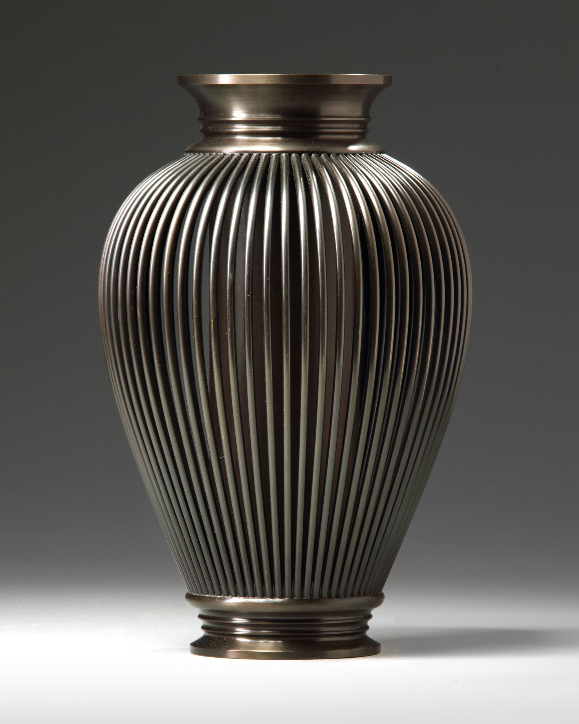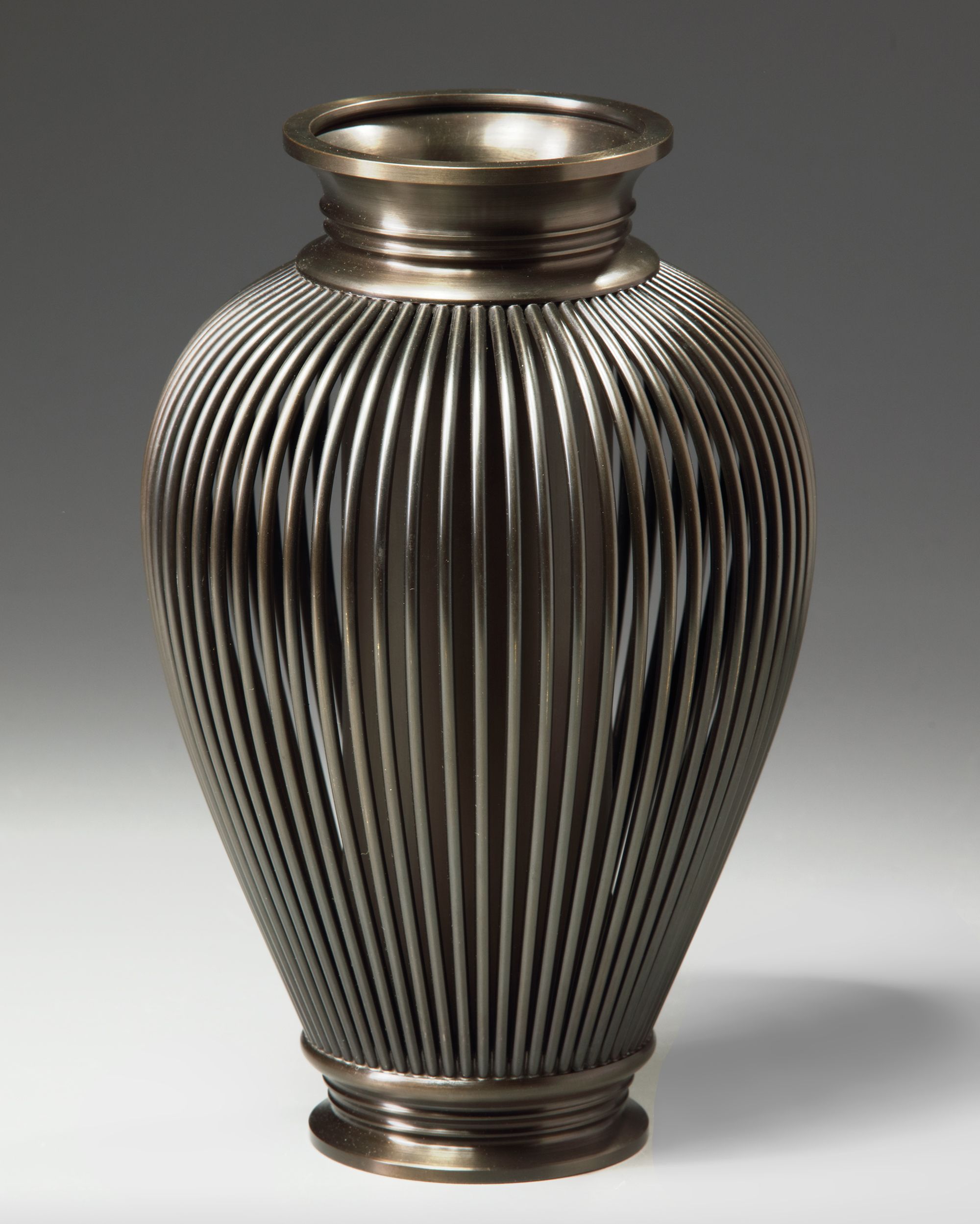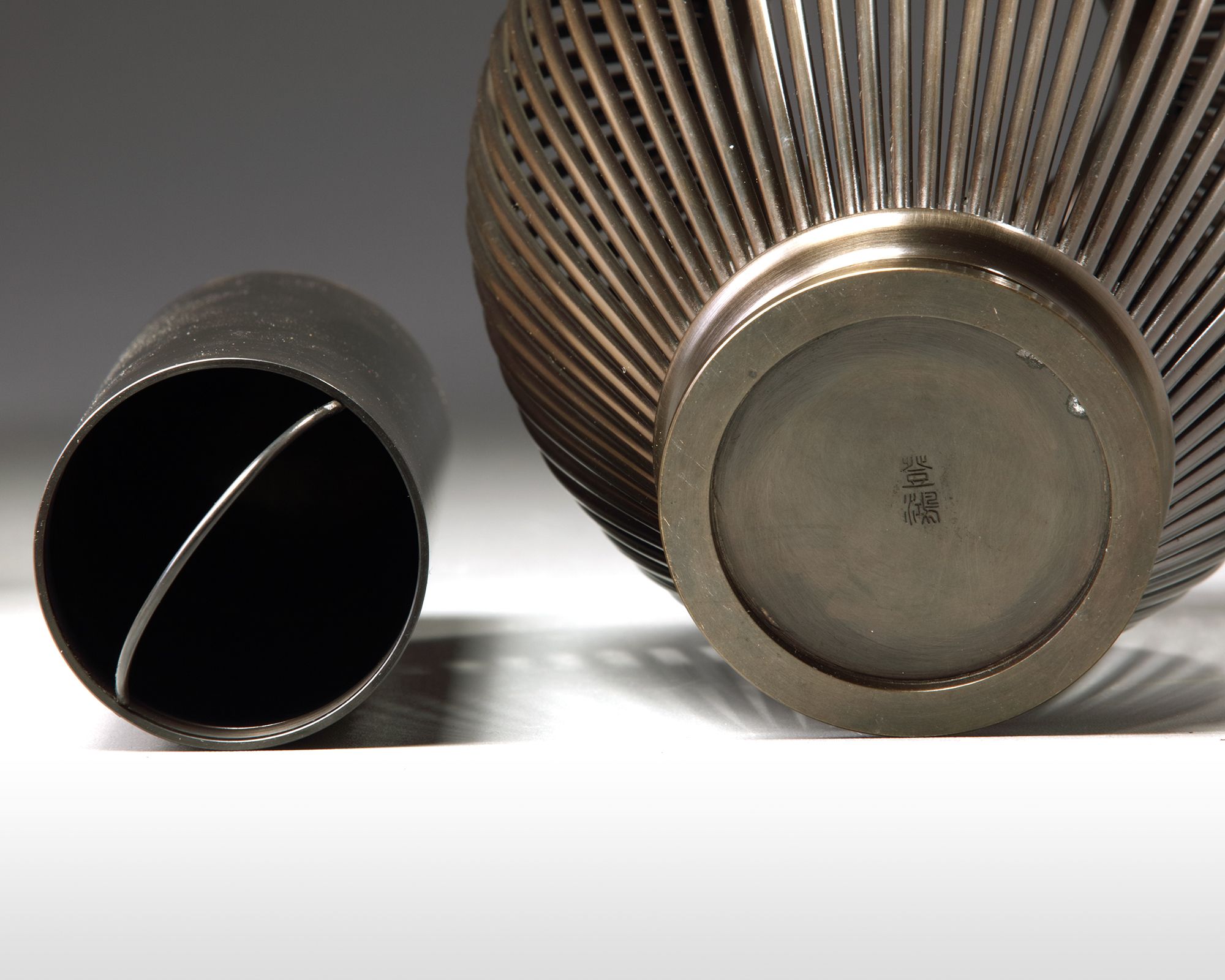 A JAPANESE BRONZE IKEBANA VASE WITH OPEN WORK WALL (SASASUKASHI), SHOWA-HEISEI PERIOD