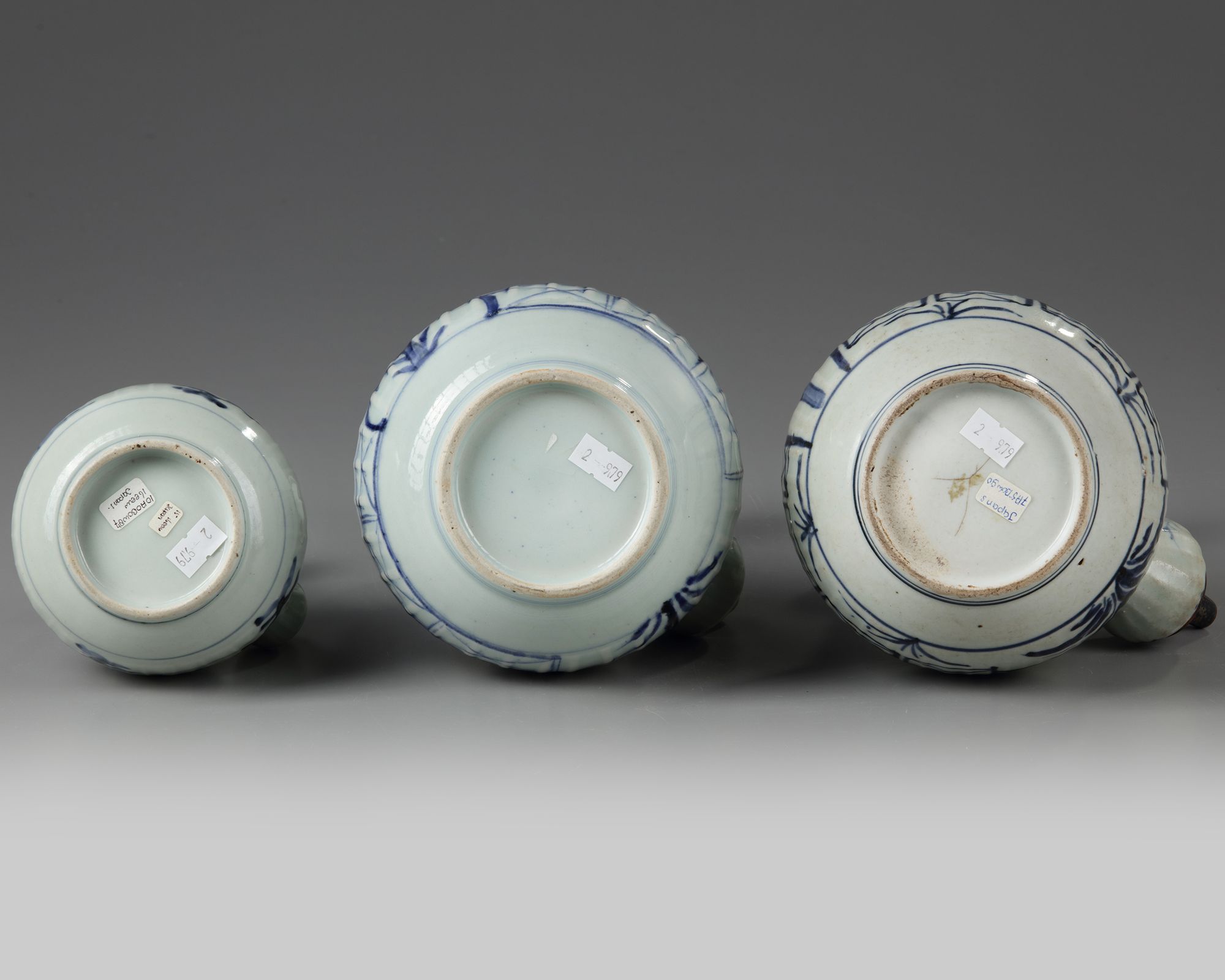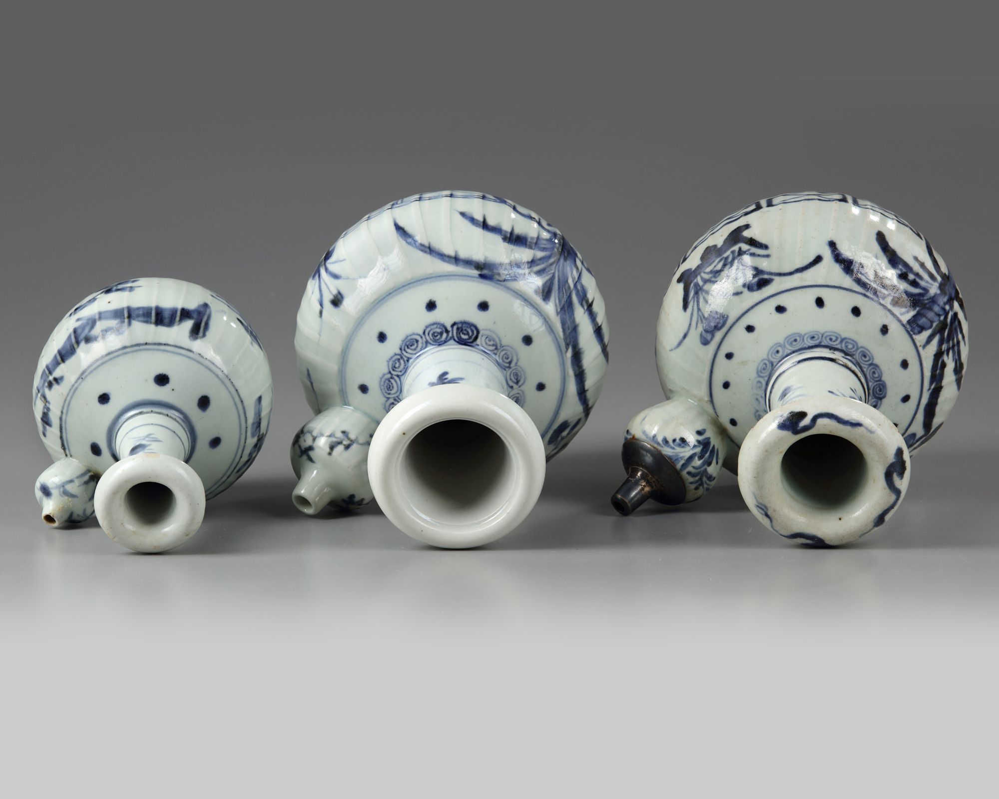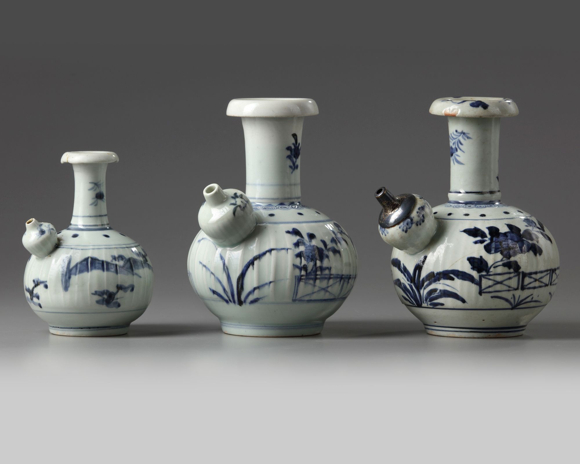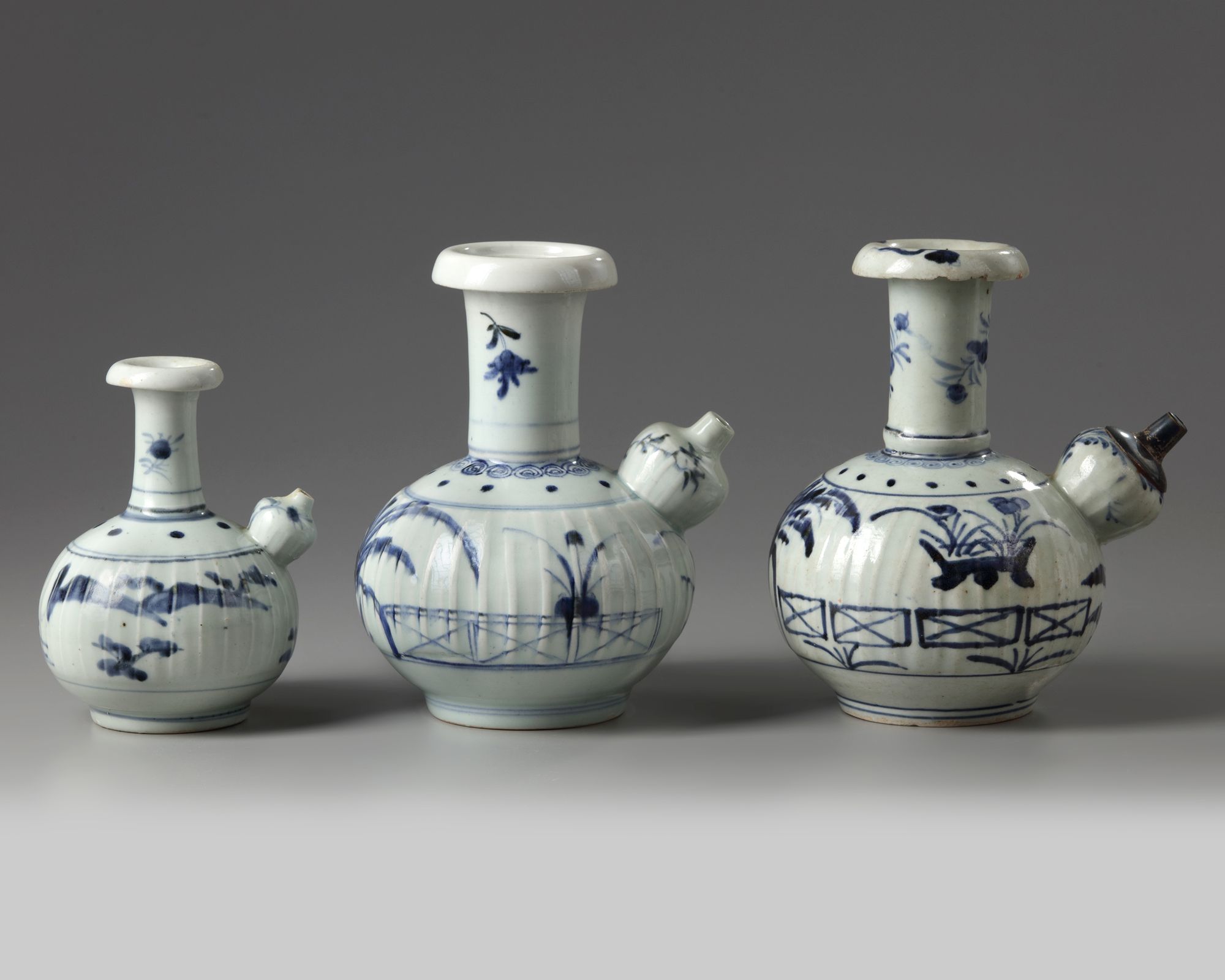 Kendi on footring, a bulbous spout on the shoulder, ribbed body and cylindrical neck ending in a splayed mouth with overturned rim. Decorated in underglaze blue with a simplified landscape and flowers in a fenced garden. On the shoulder with circles. One the spout a flower spray. The small kendi of 15 cm height.