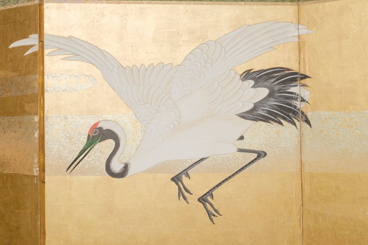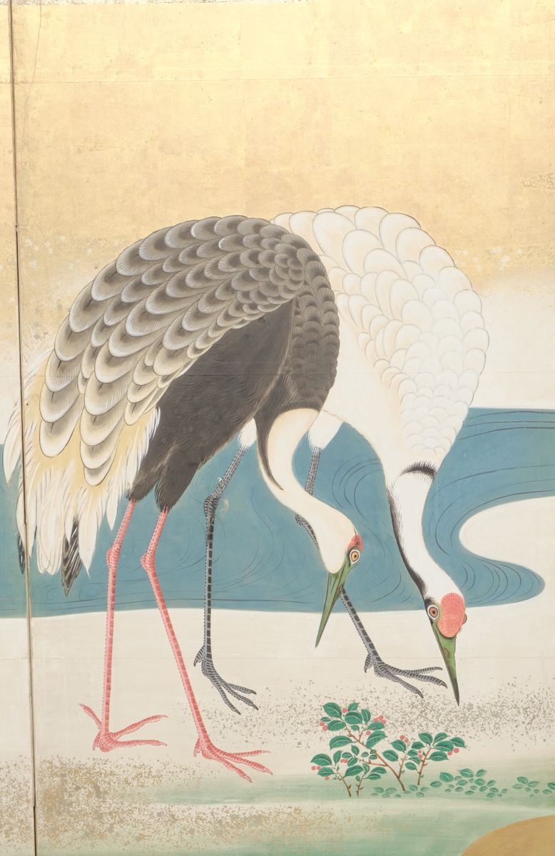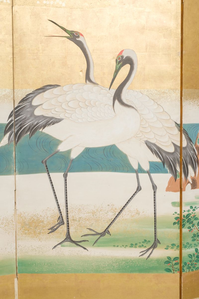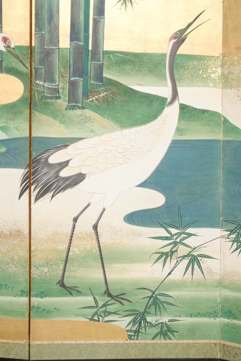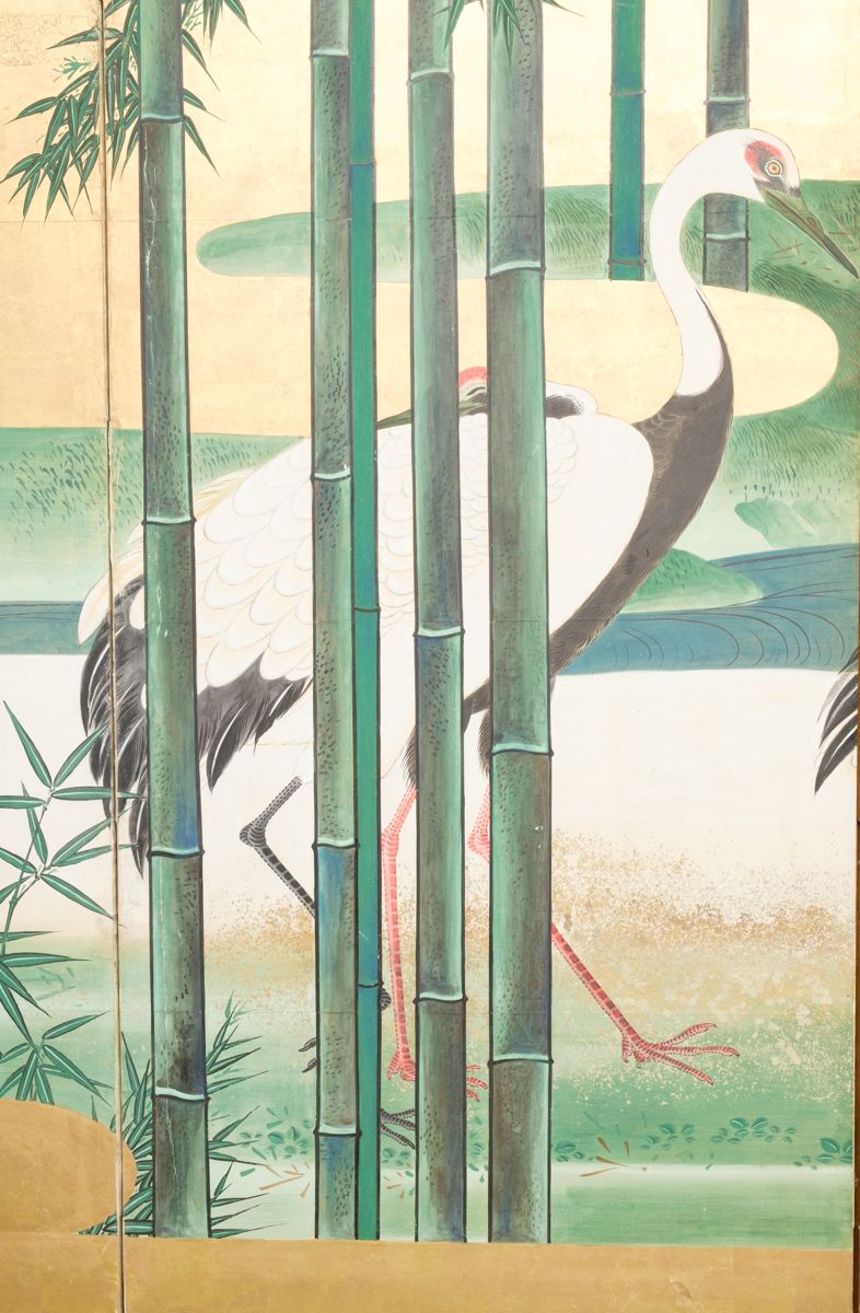 Set of two six panel byobu-screens with a polychrome painting on gold leaf depicting red head cranes and a few other birds on one screen among bamboo near running water and on the other screen next to a pine-tree. Both screens signed: “Kazuga edokoro hōkyö Takugan Abe Chūki” (the Kano-school painter Katsuyama Takugan, 1747-1824). Edo Period. Height: 171 cm., width 64 cm. (2x, 6x)