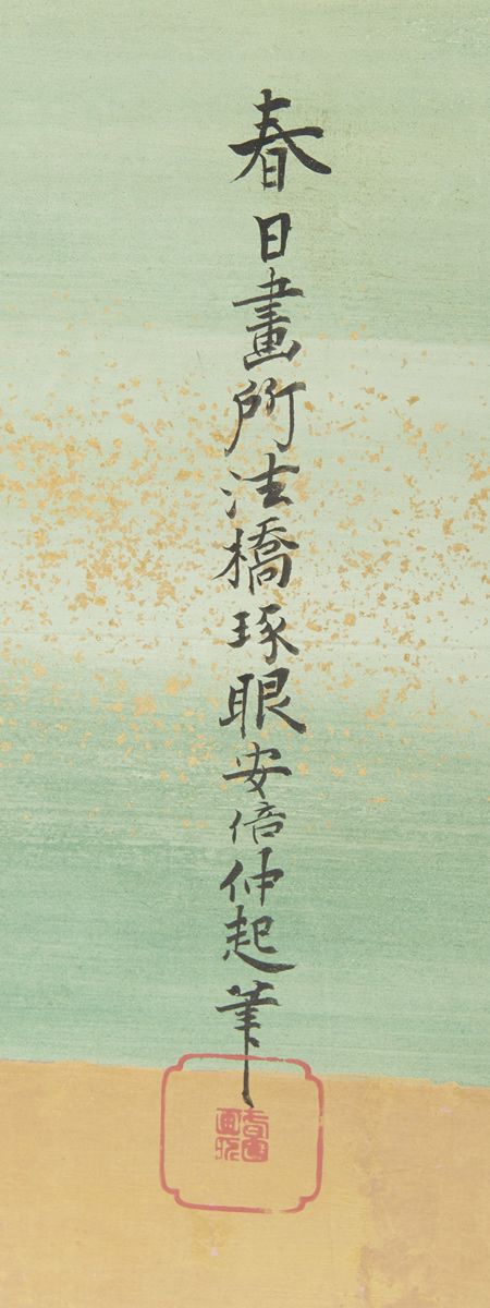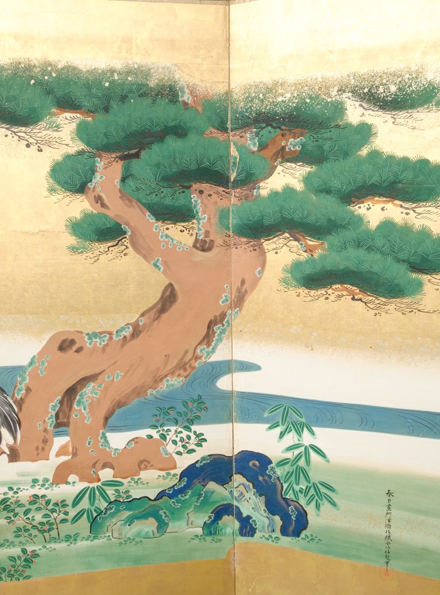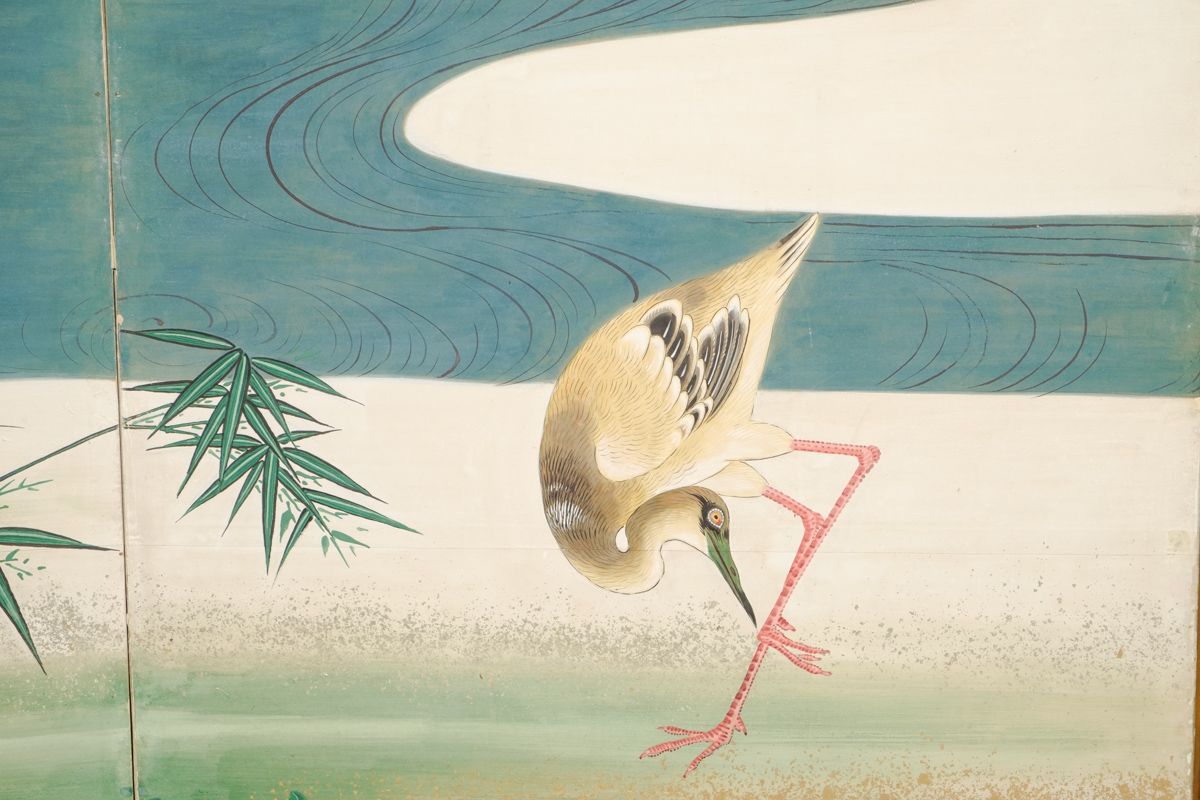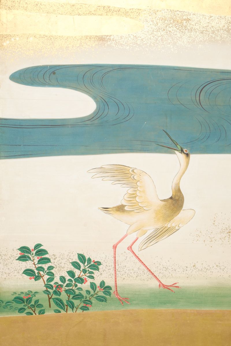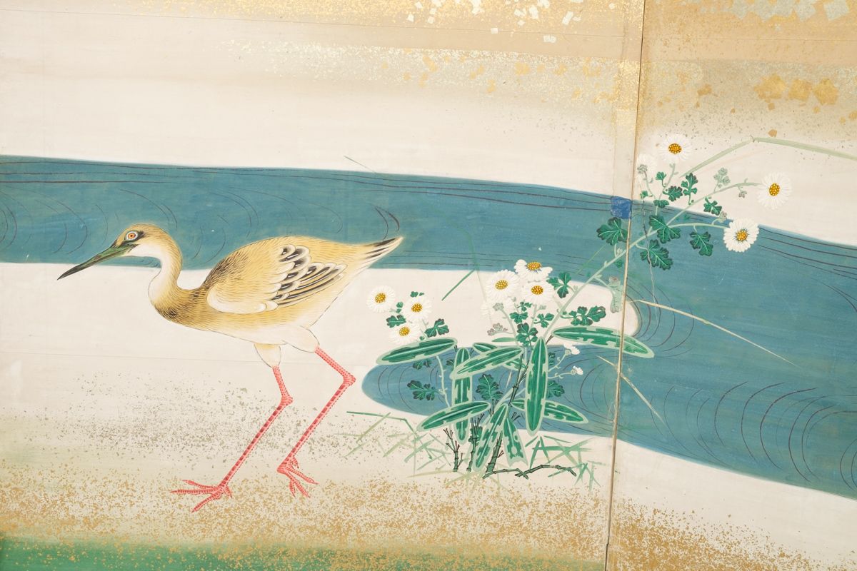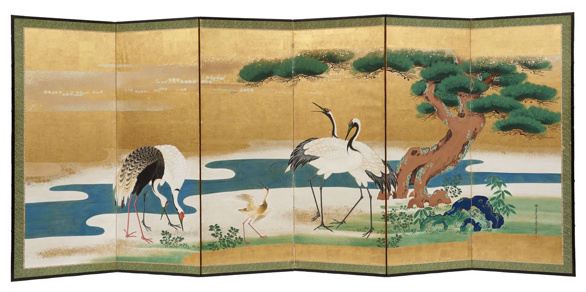 Set of two six panel byobu-screens with a polychrome painting on gold leaf depicting red head cranes and a few other birds on one screen among bamboo near running water and on the other screen next to a pine-tree. Both screens signed: “Kazuga edokoro hōkyö Takugan Abe Chūki” (the Kano-school painter Katsuyama Takugan, 1747-1824). Edo Period. Height: 171 cm., width 64 cm. (2x, 6x)