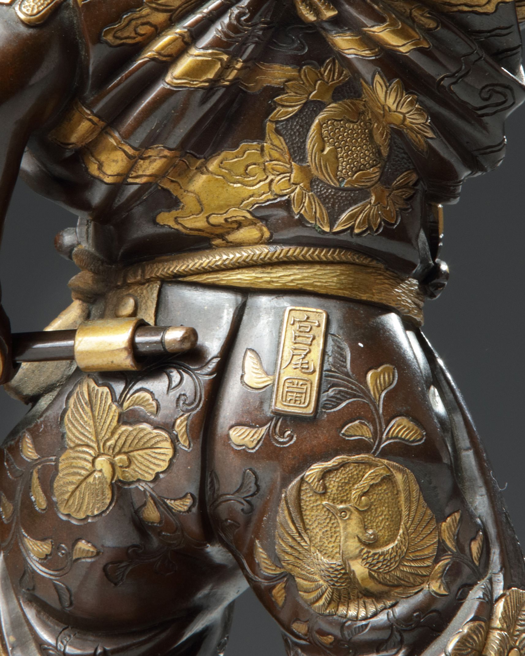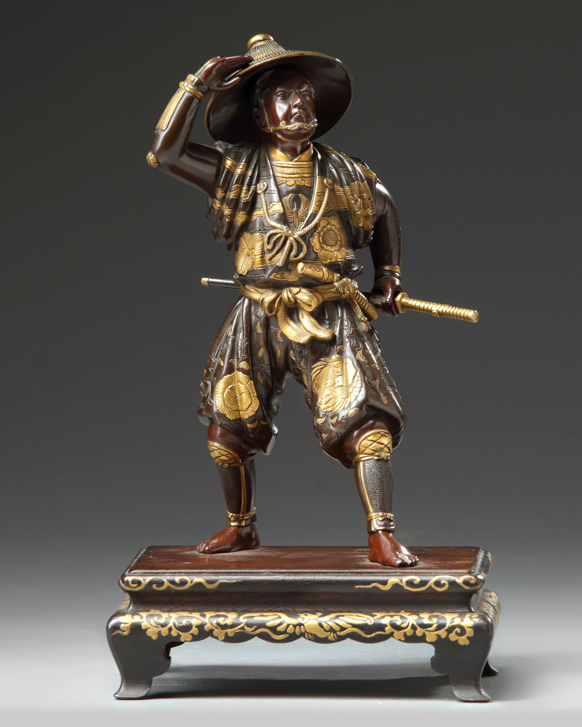 A Japanese gilt bronze samurai warrior, holding a sword is his hand and touching his bamboo hat with the other, having gilded relief decoration and mounted on hardwood stand with gilt flower scrolls. wearing a wakizashi [short sword] tucked into his belt. 17.00 cm. high without stand