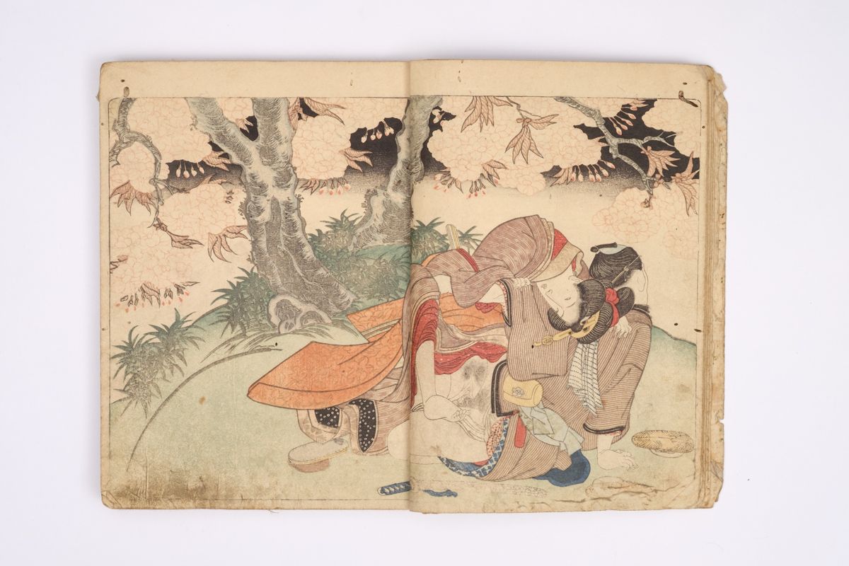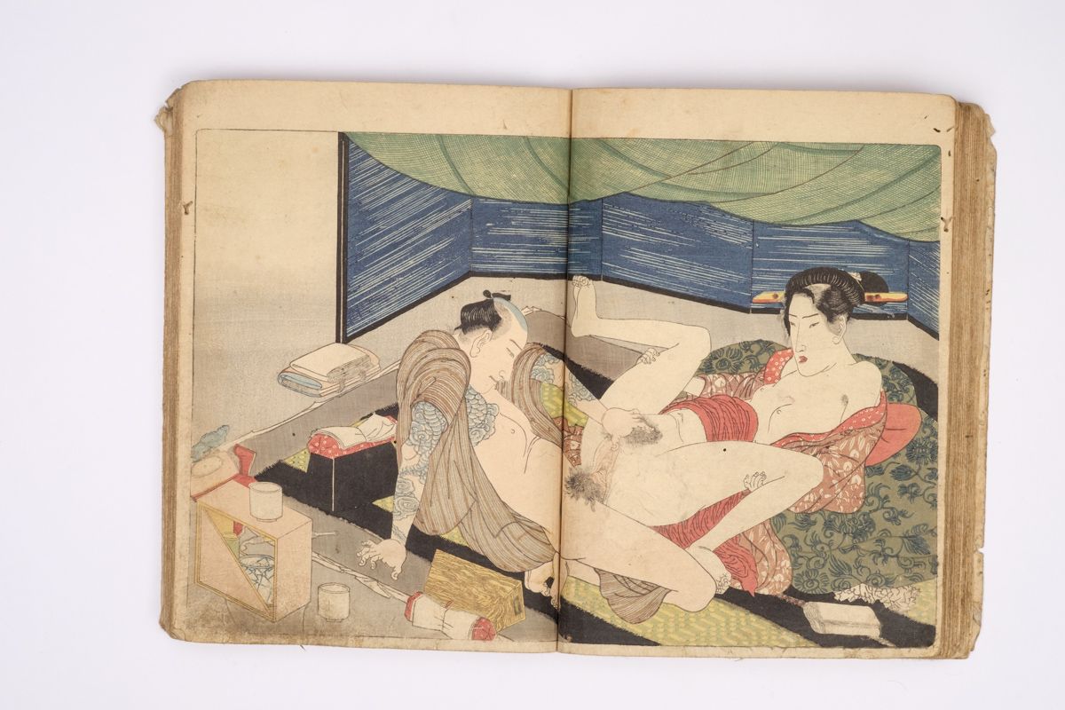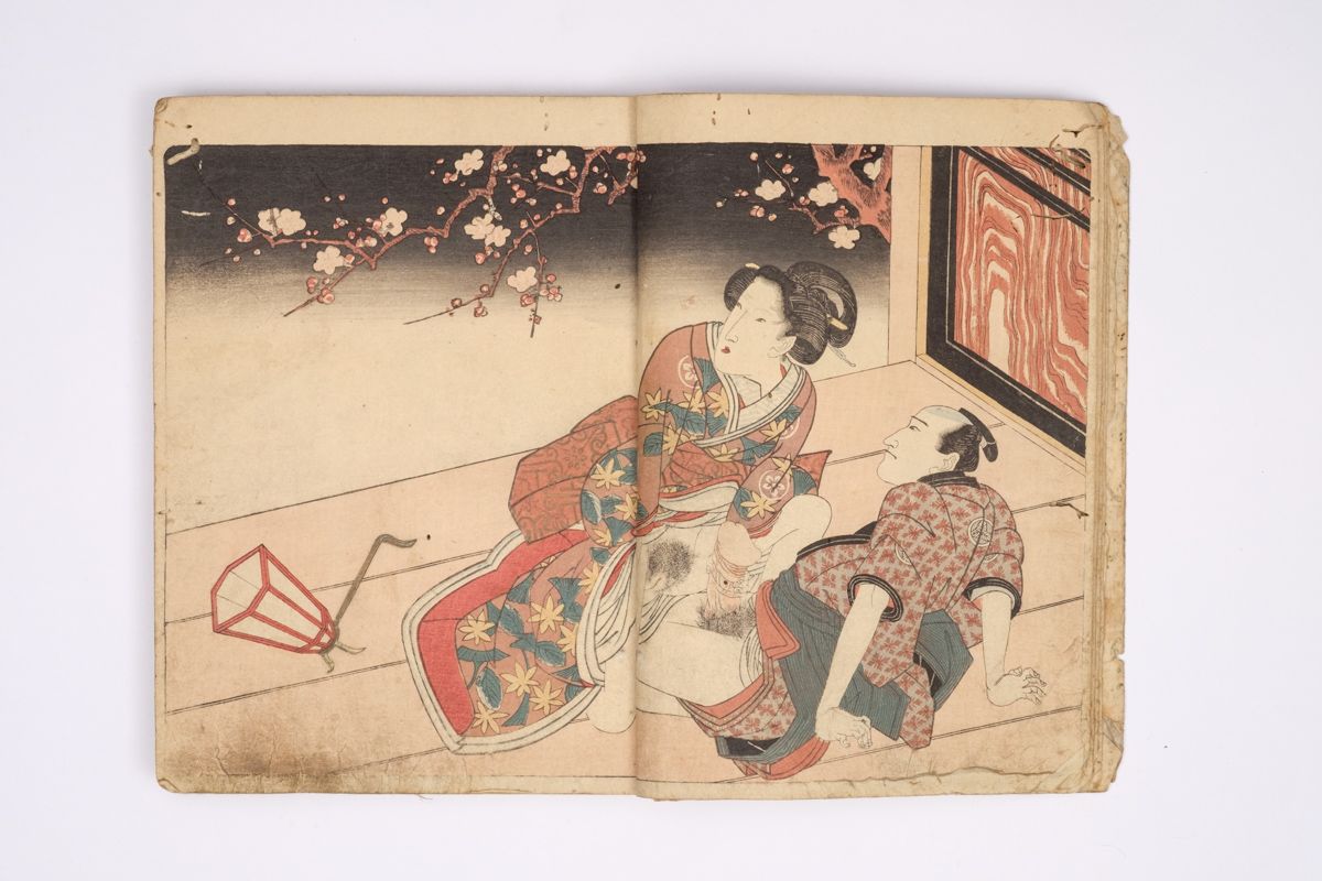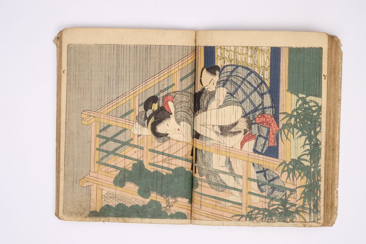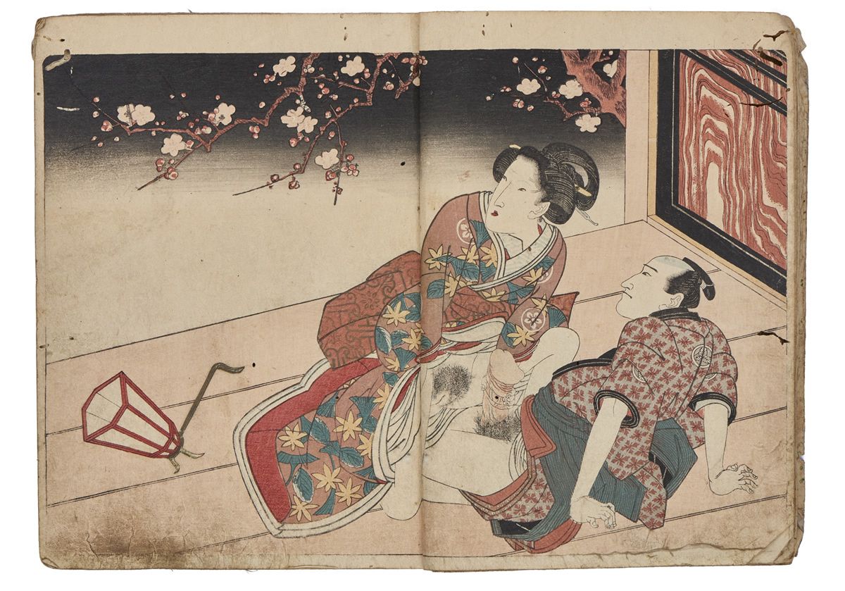 Two volumes, rebound as one volume, with one title page extracted of the erotic shunga-book: (Shunka shuto) Shiki no nagame (In Praise of Love - in the Four Seasons) vol. natsu no bu. The book illustrated by Utagawa Kunisada (1786 - 1865) has 8 and 7 double sheets coloured shunga illustrations and contains the story: - Koi no shianno soto naranu musume no shigoto - by Sukitei and Hatsuhana Sakime.