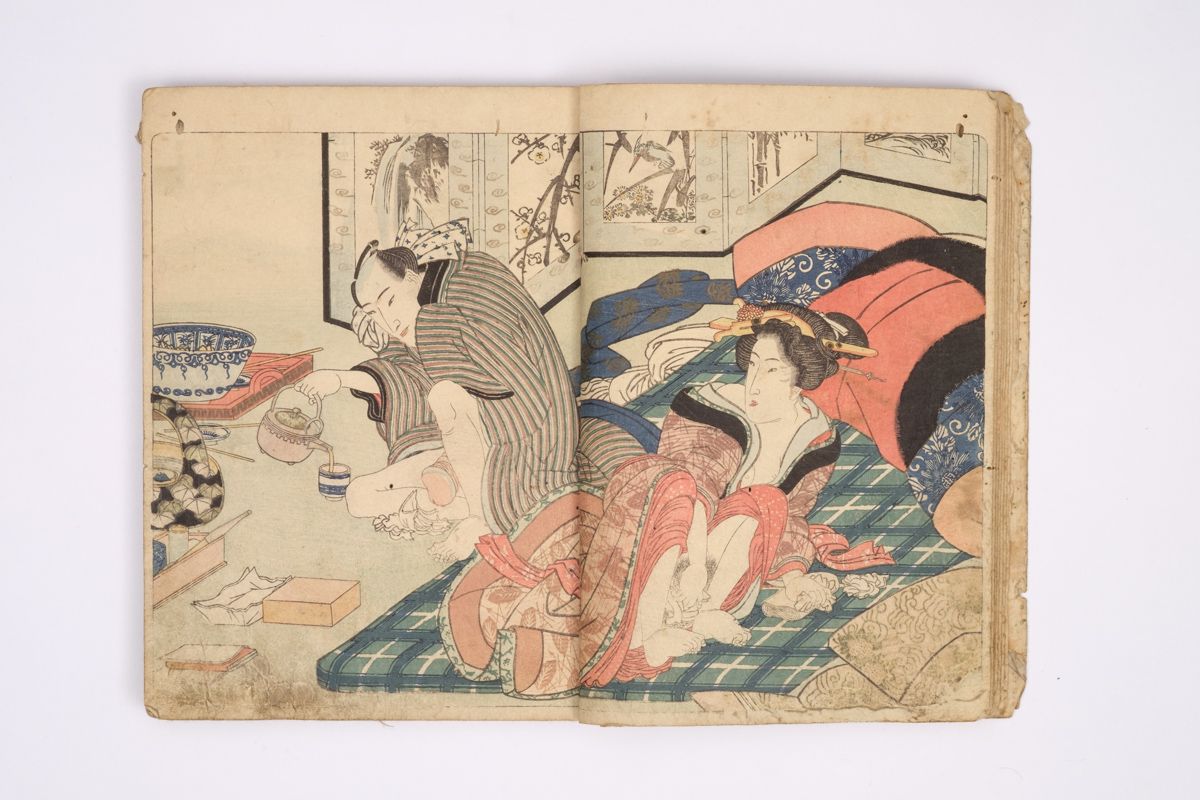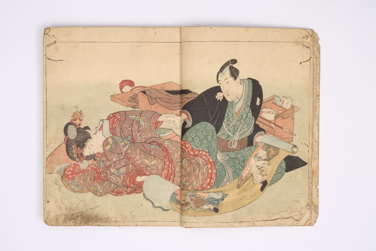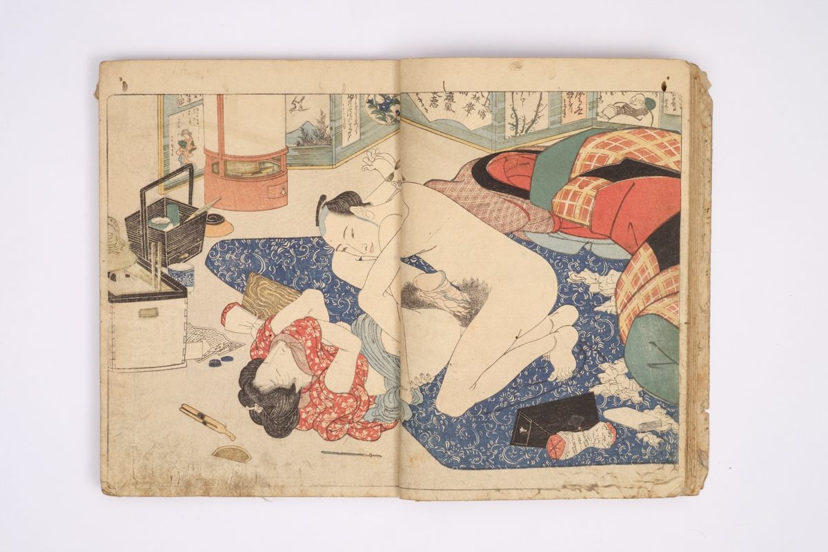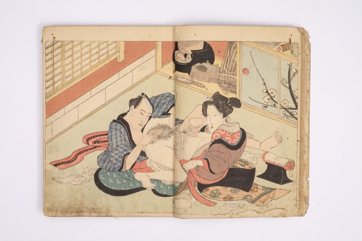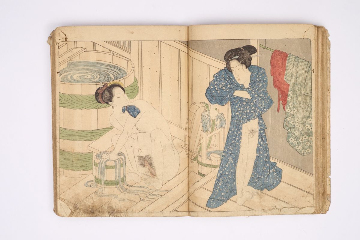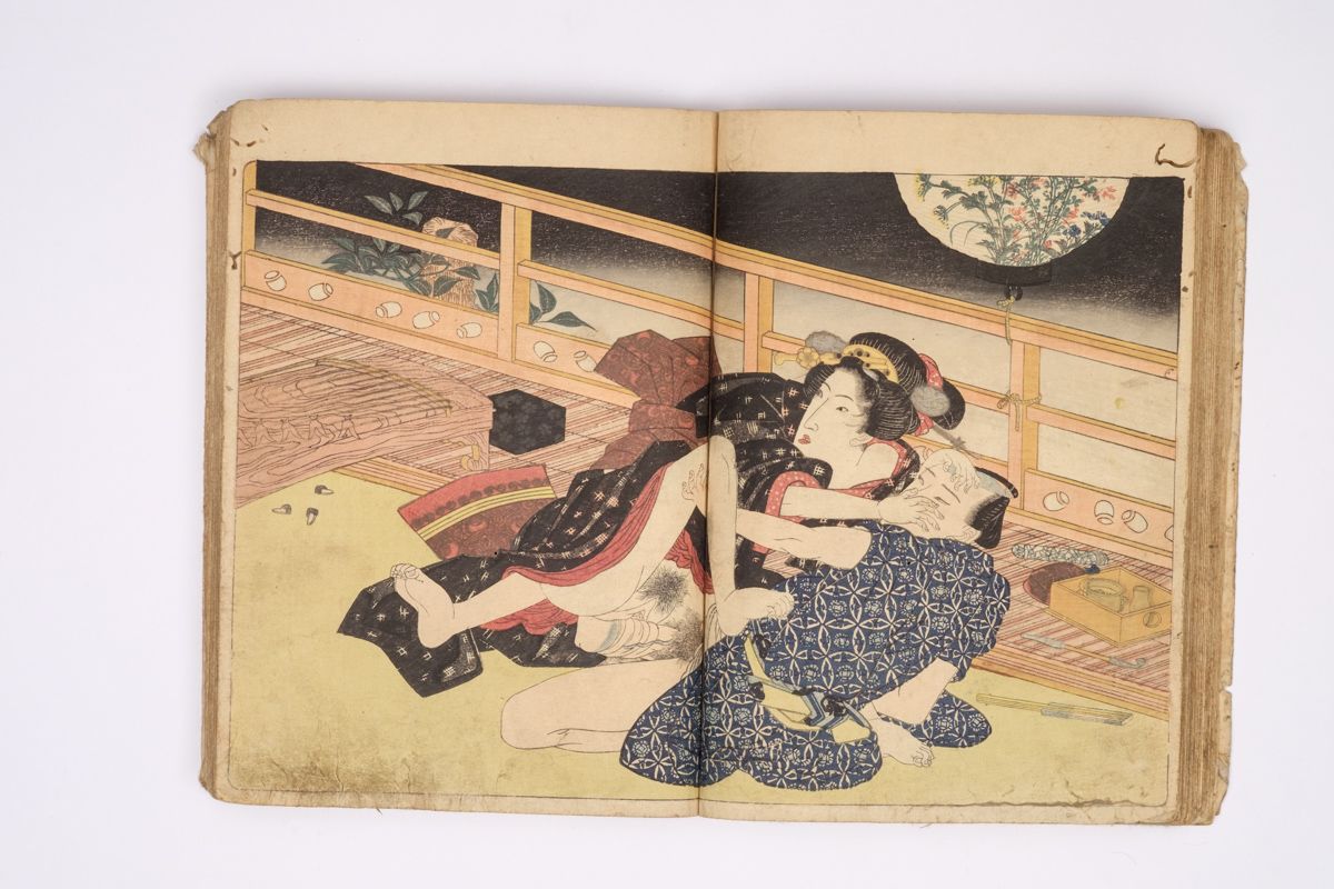 Two volumes, rebound as one volume, with one title page extracted of the erotic shunga-book: (Shunka shuto) Shiki no nagame (In Praise of Love - in the Four Seasons) vol. natsu no bu. The book illustrated by Utagawa Kunisada (1786 - 1865) has 8 and 7 double sheets coloured shunga illustrations and contains the story: - Koi no shianno soto naranu musume no shigoto - by Sukitei and Hatsuhana Sakime.