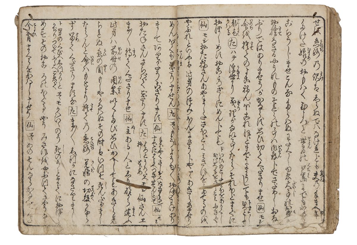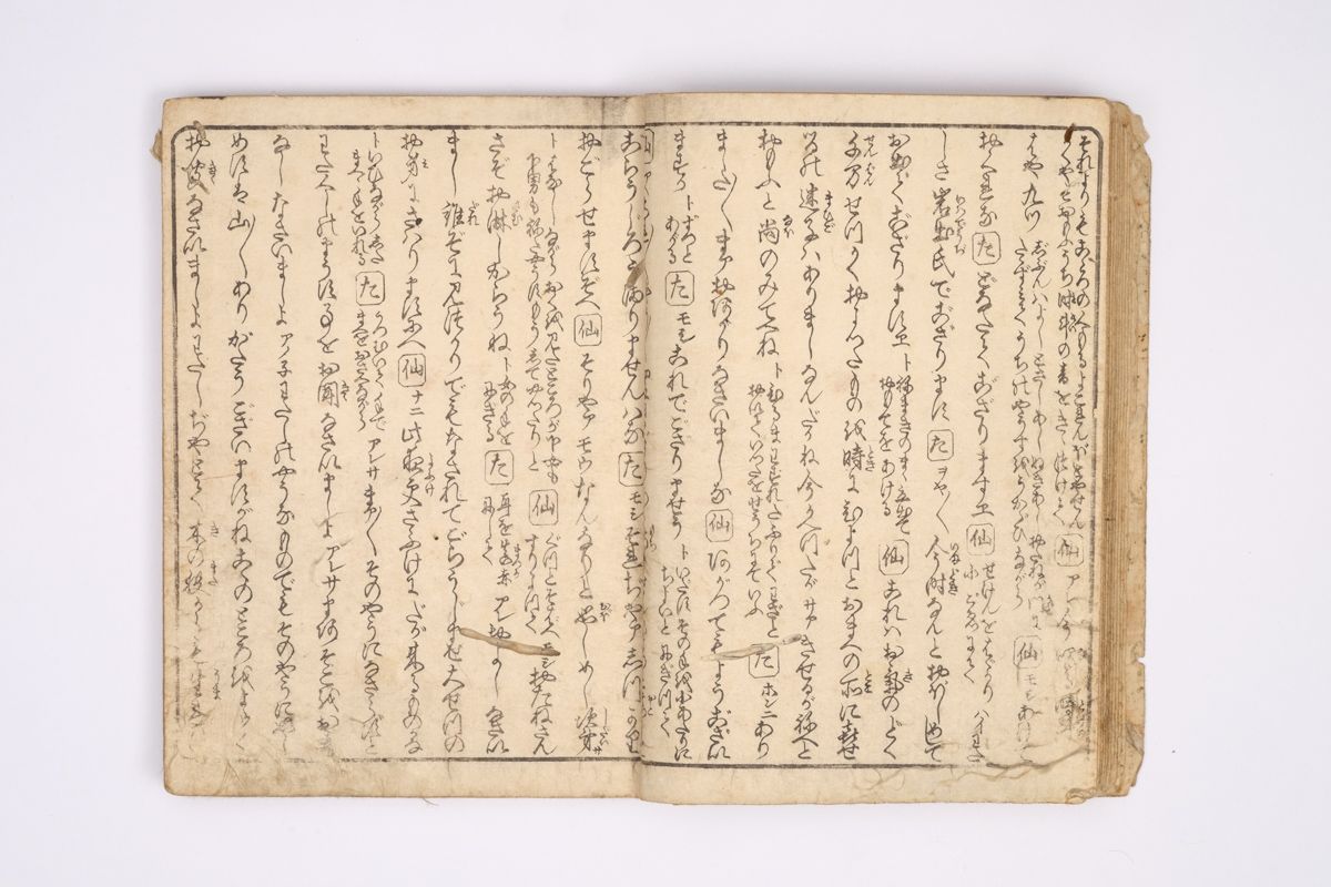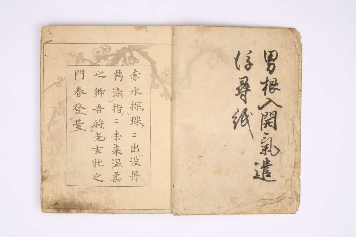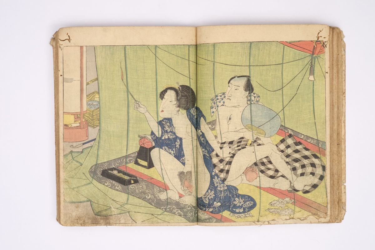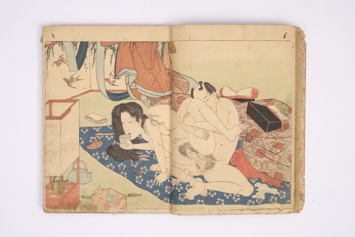 Two volumes, rebound as one volume, with one title page extracted of the erotic shunga-book: (Shunka shuto) Shiki no nagame (In Praise of Love - in the Four Seasons) vol. natsu no bu. The book illustrated by Utagawa Kunisada (1786 - 1865) has 8 and 7 double sheets coloured shunga illustrations and contains the story: - Koi no shianno soto naranu musume no shigoto - by Sukitei and Hatsuhana Sakime.