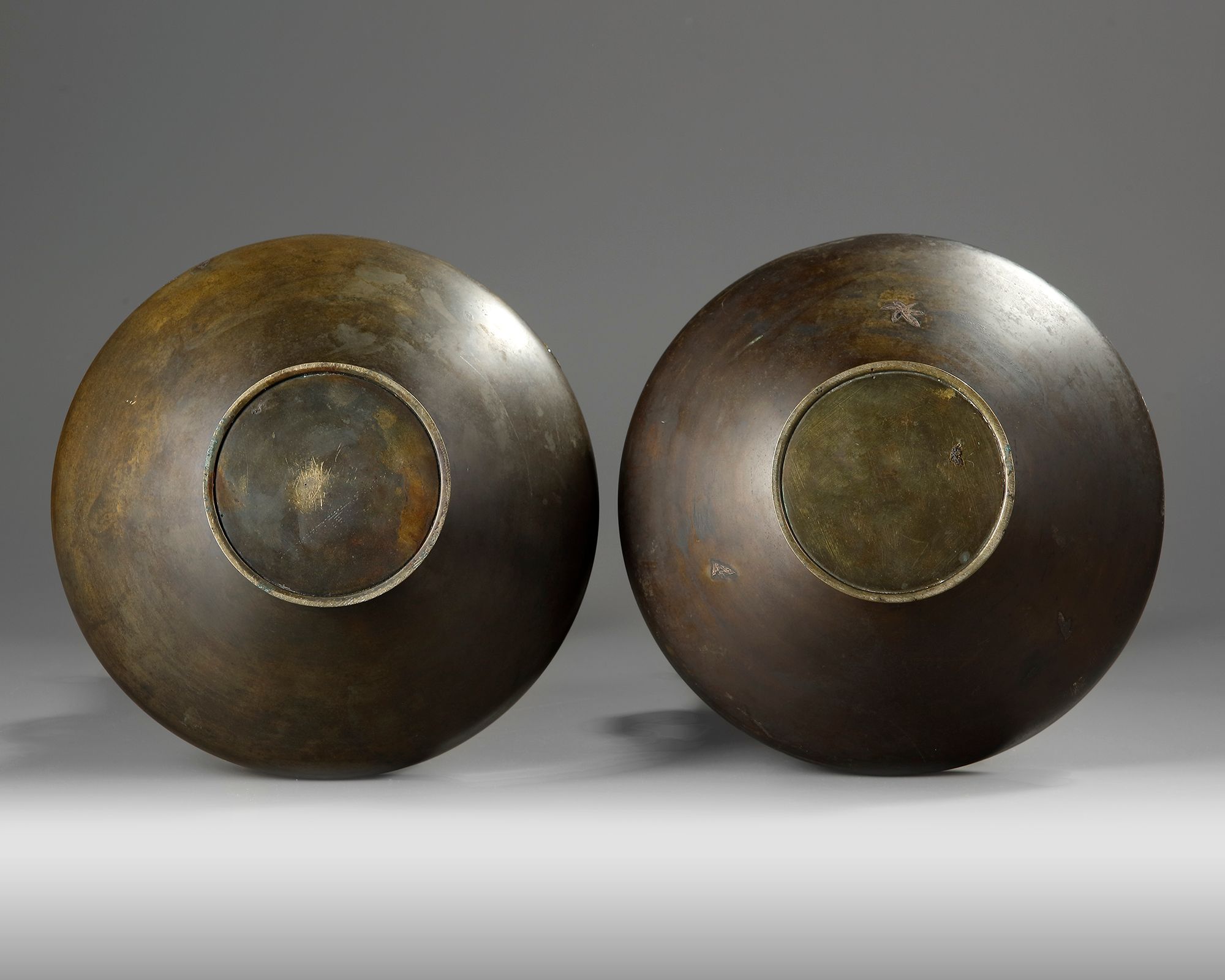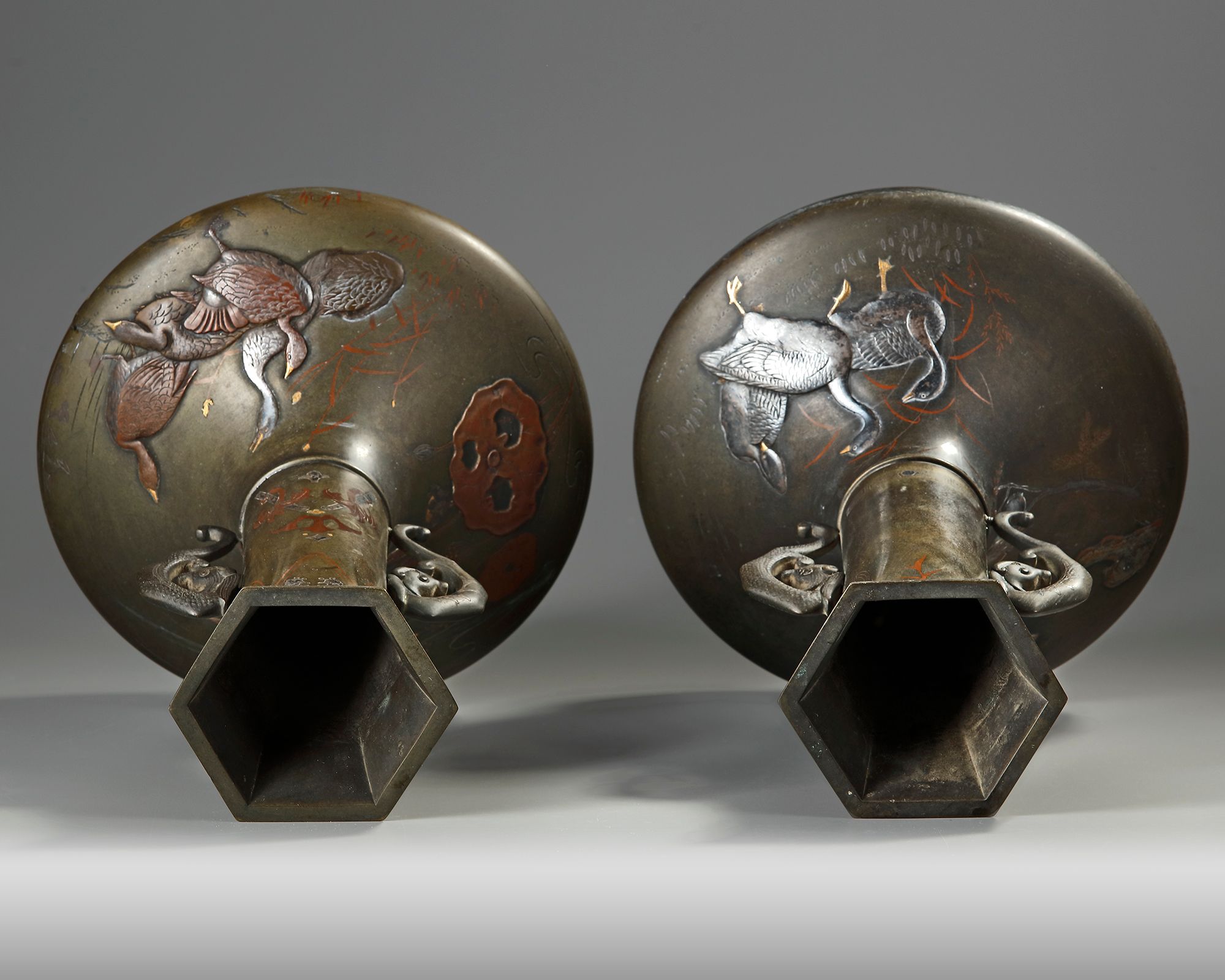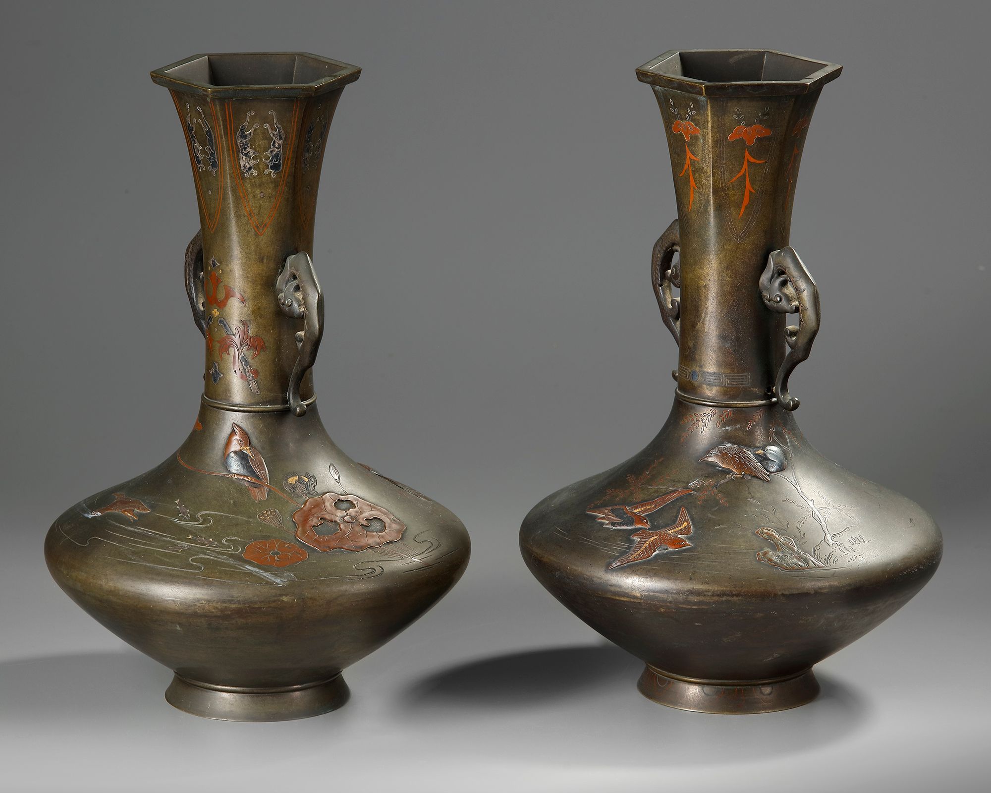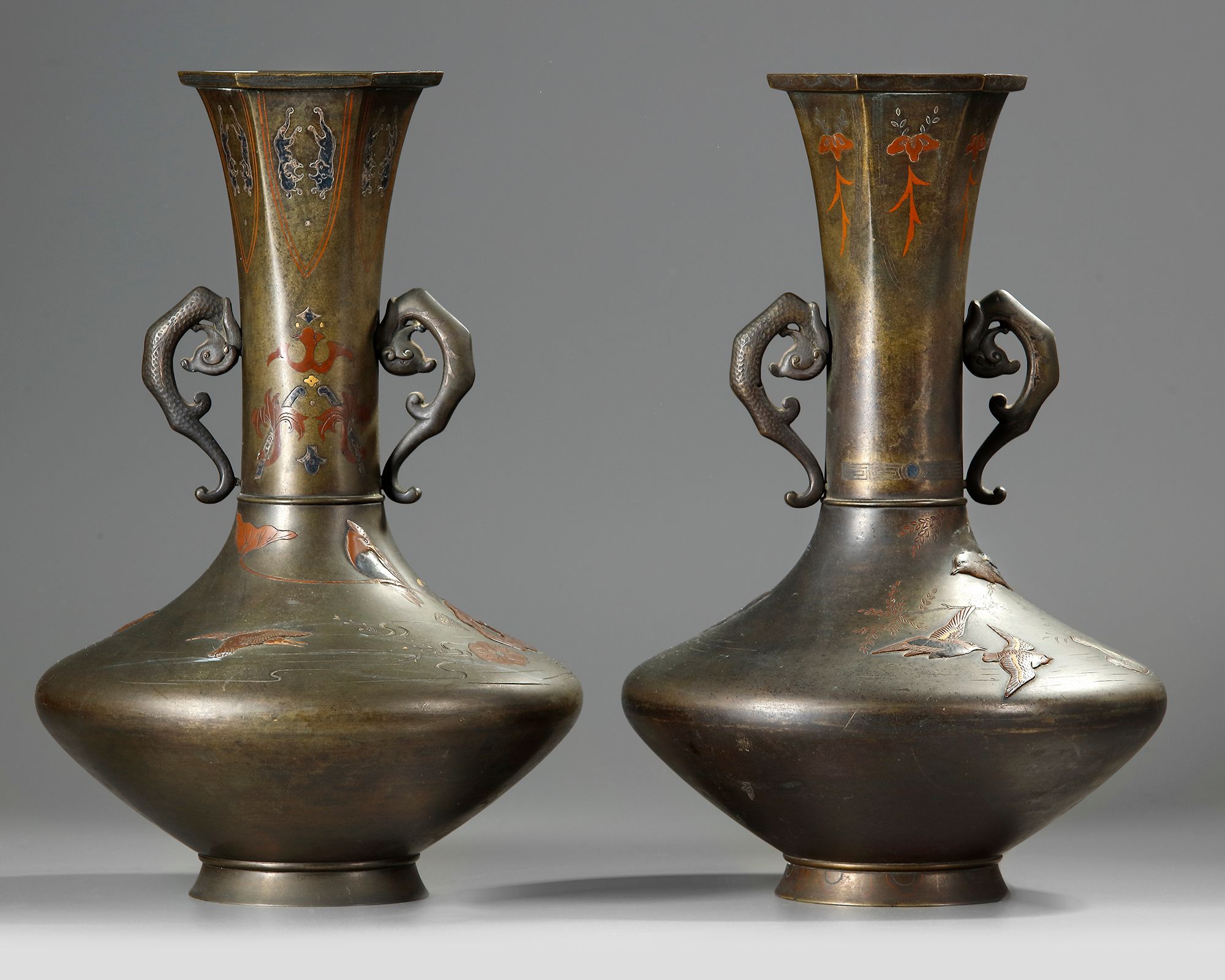 A pair of vases each with stylized dragon shaped handles and engraved with silver inlaid raised florals and geese. H. 34 cm
