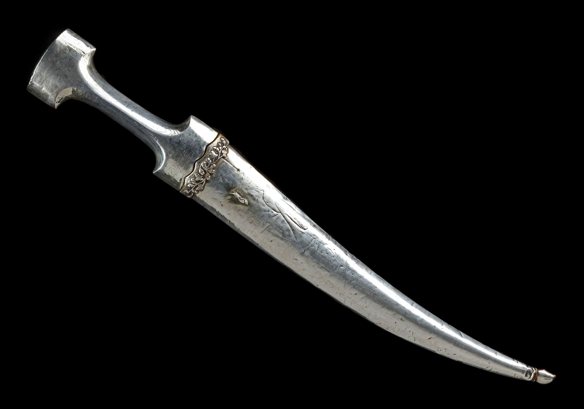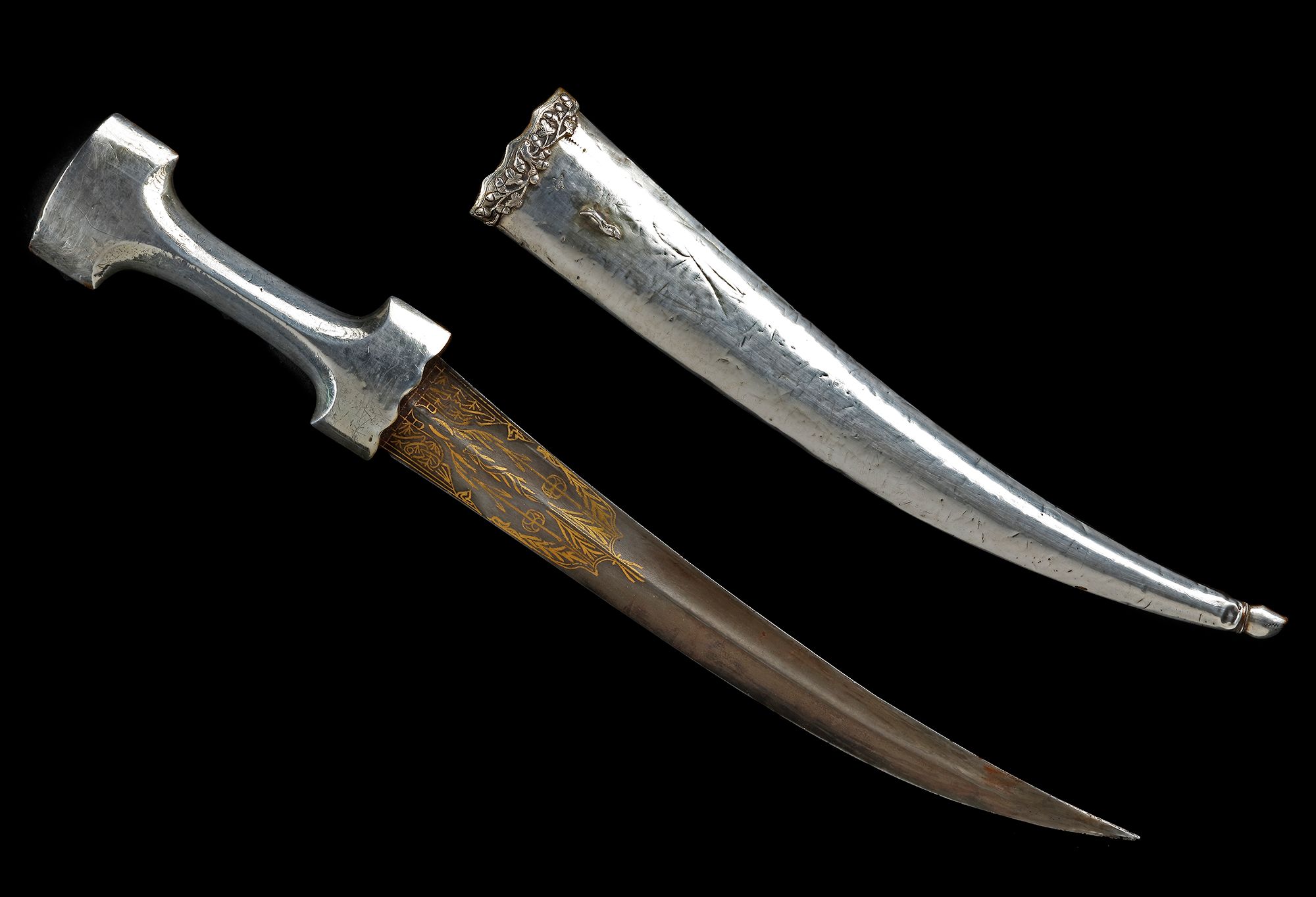 Plain silver hilt with scalloped shoulder, the slightly curved blade with gold damascening decoration at forte.