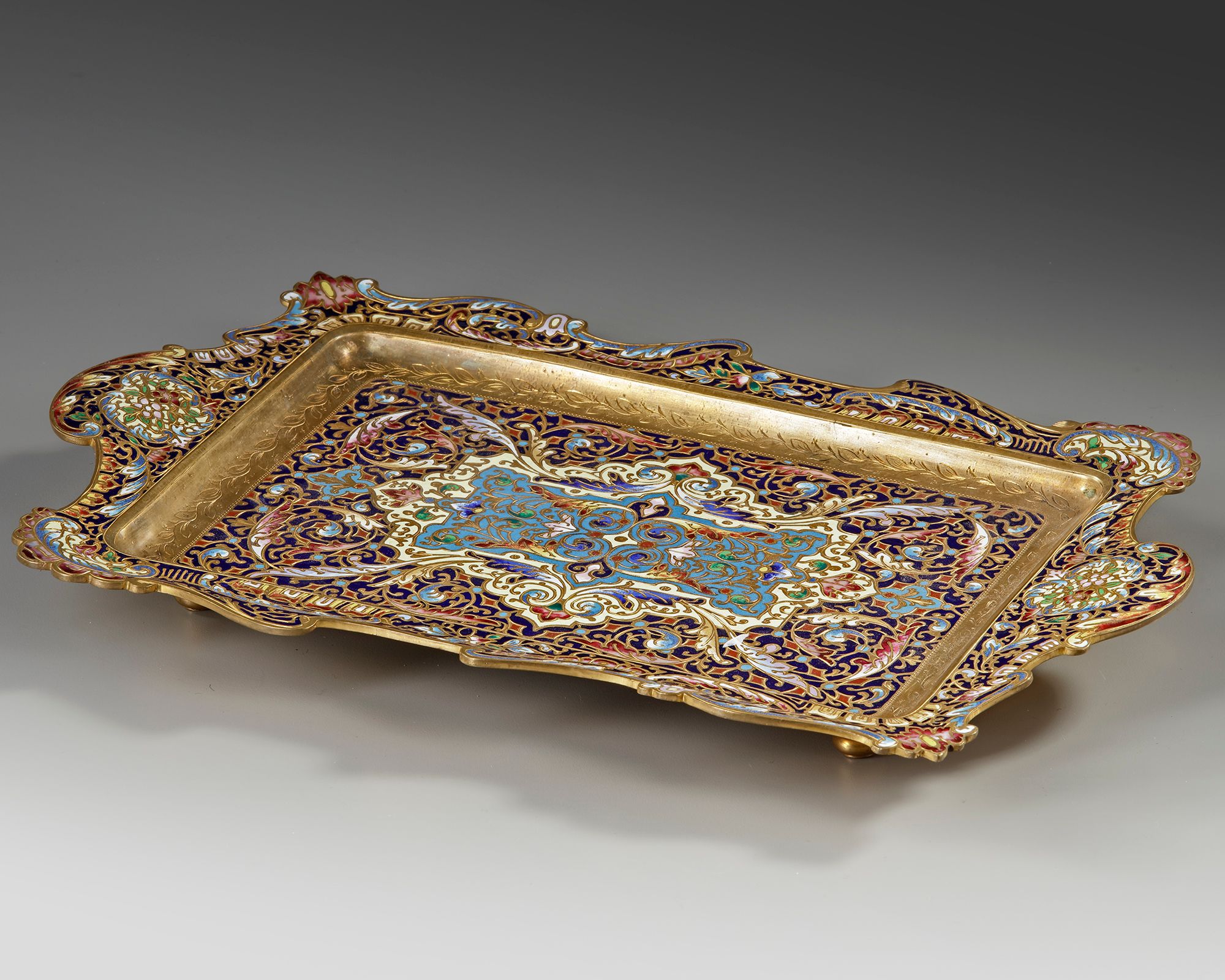 Beautiful 19th century French enamel, gilt bronze, and champlevé, four footed dresser stand or plate dish. L 36 cm. In a good condition.