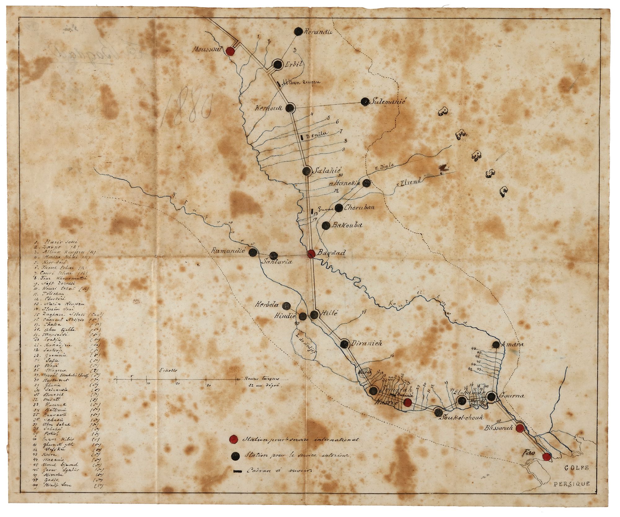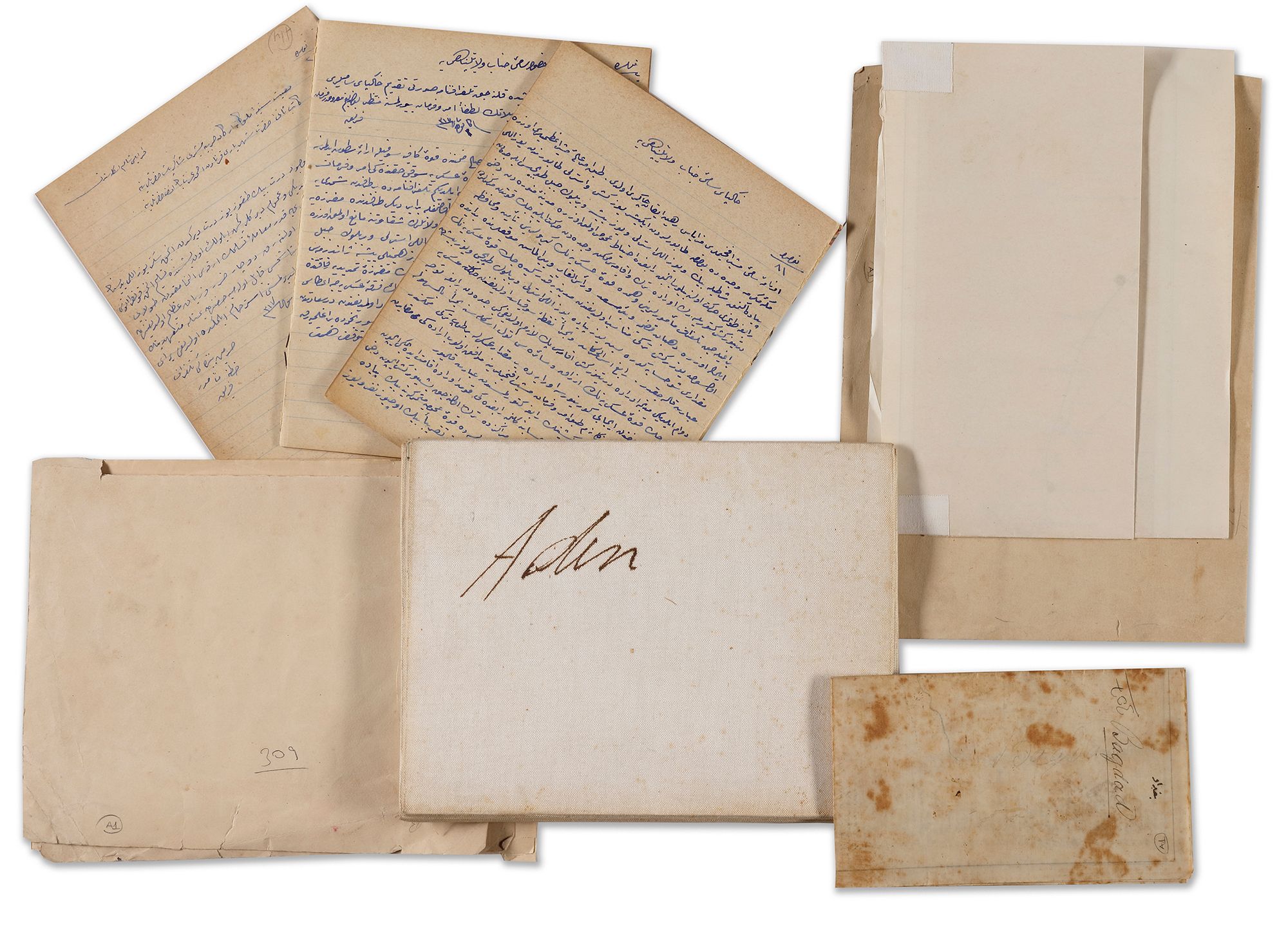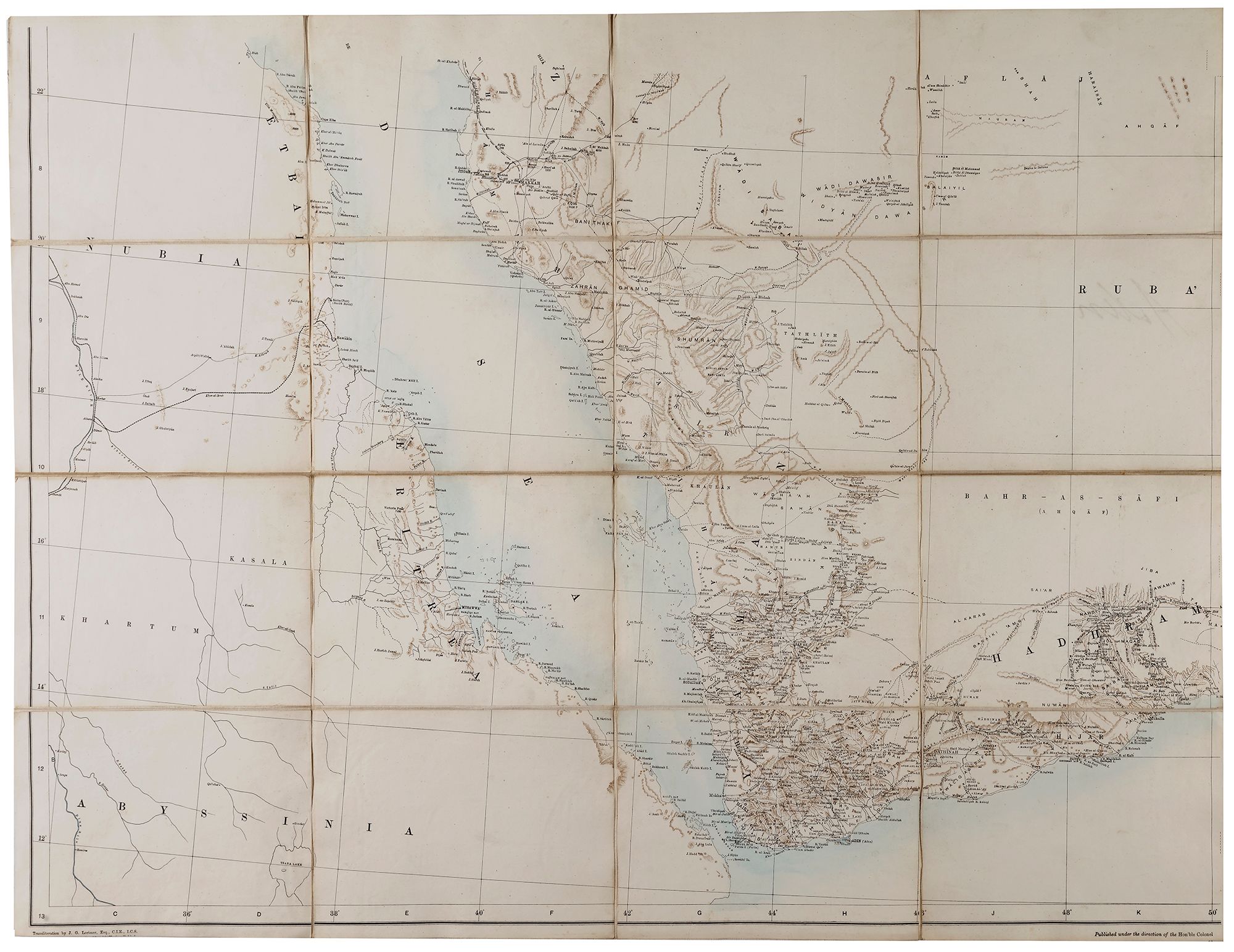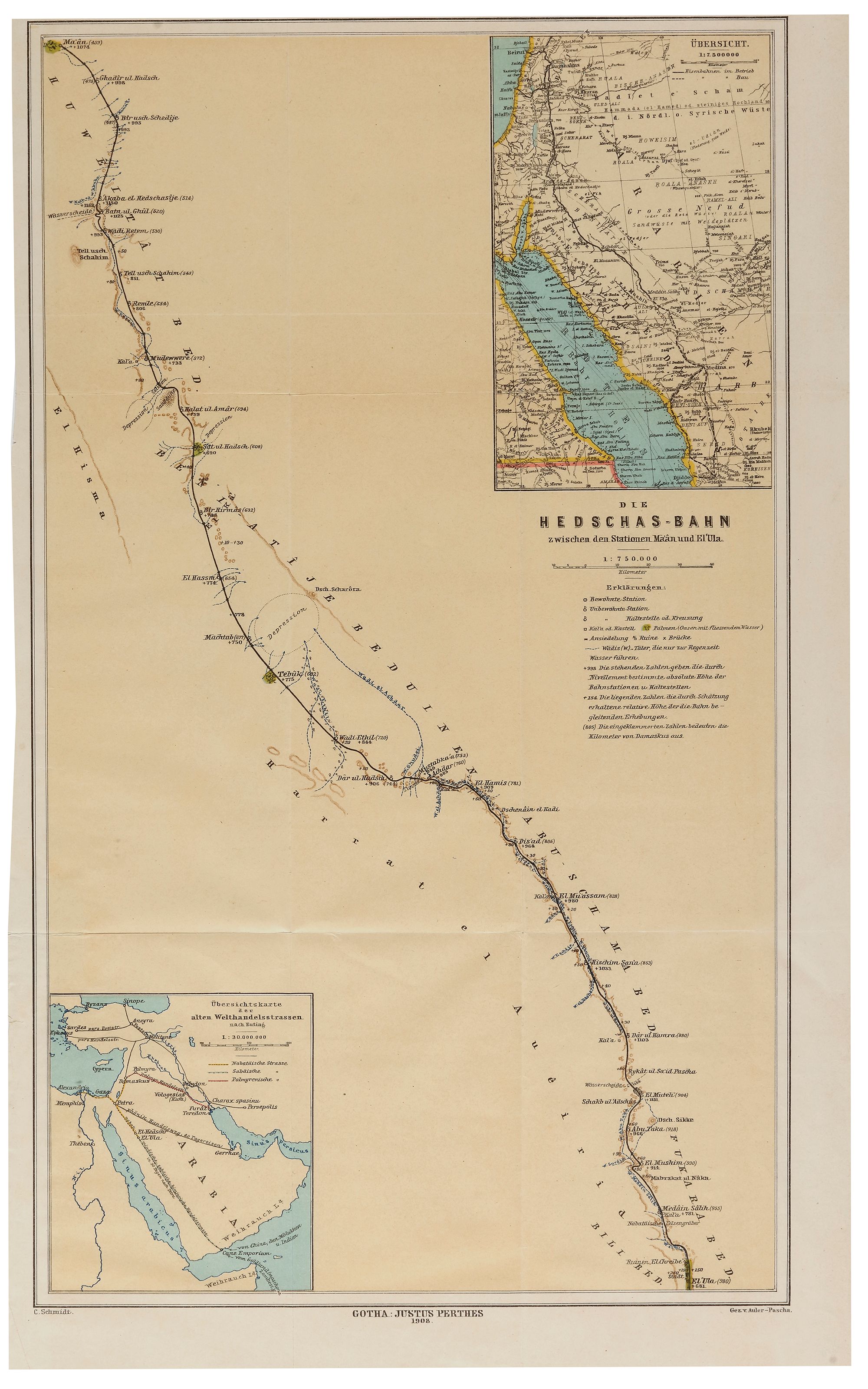 Attached: Printed map of Basra Gulf. 53 by 82 cm. A French map, printed in Germany 1908 of the Hijazi railway from Maan, Alula to Medina. 36 by 82 cm. A military printed map of Yemen, Aseer and the south of Hijaz, 1906. 70 by 90 cm.