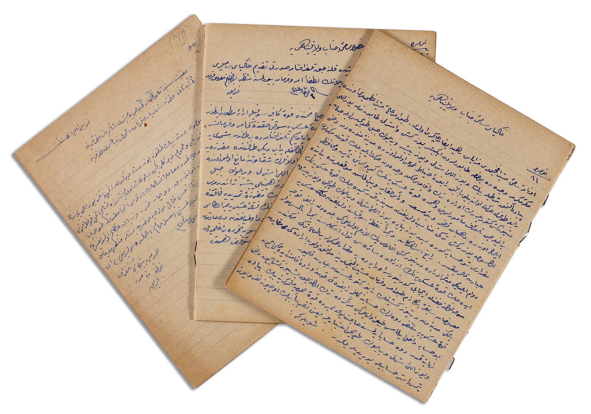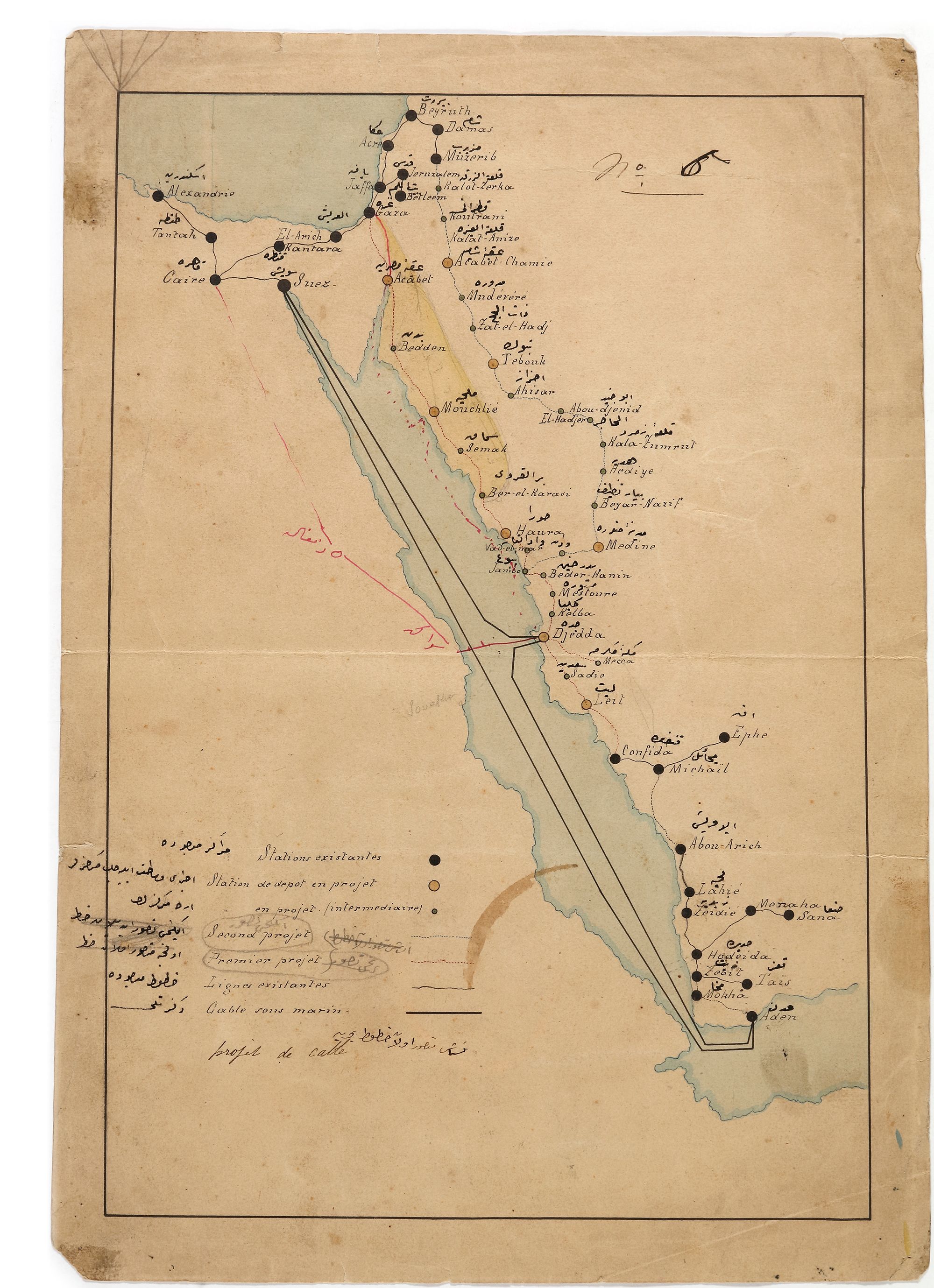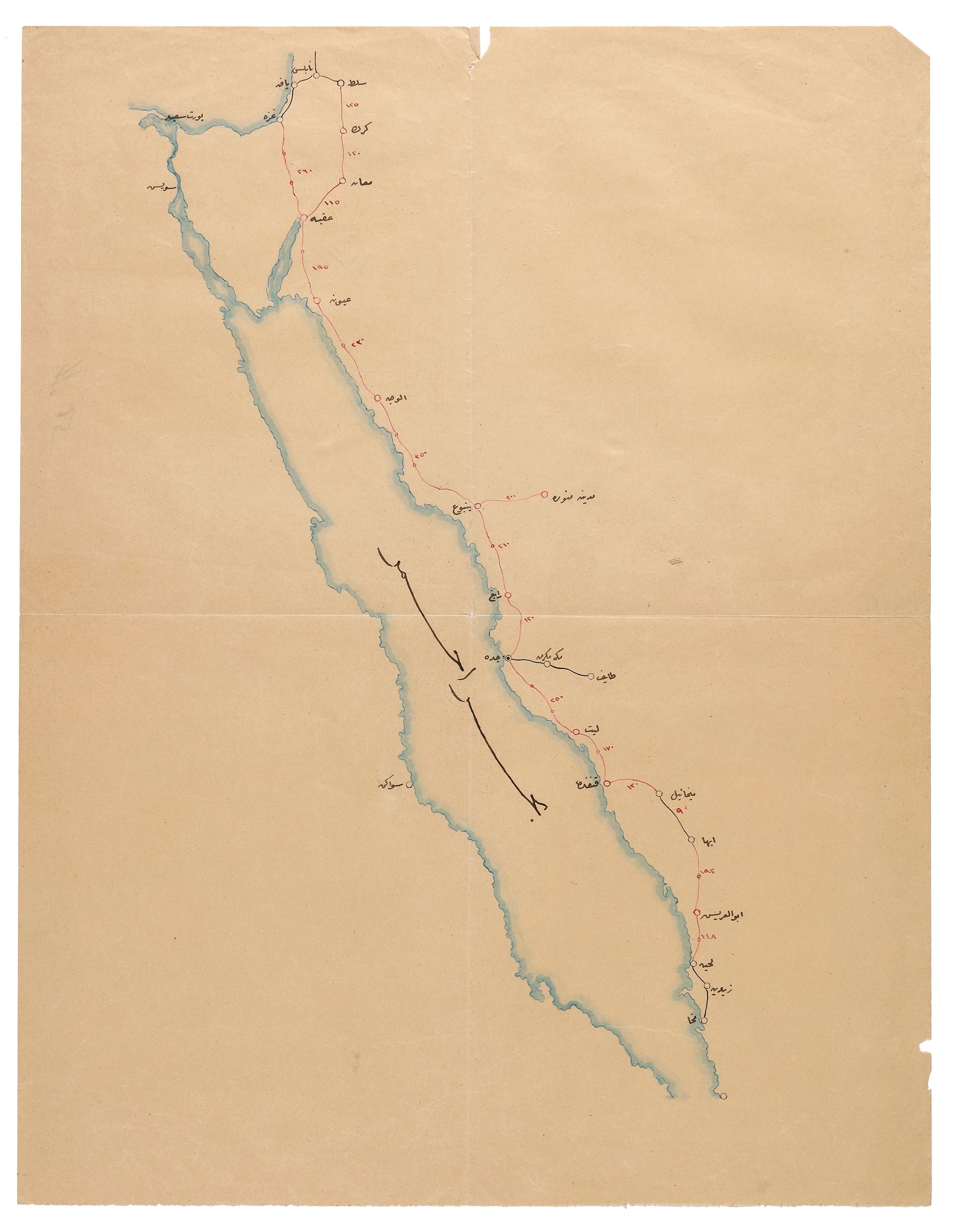 Copybook contains 80 register outgoing correspondence, 1317 AH/1900-1901 AD among Jeddah, Hijaz, Taif, Medina, Alsham and the Ministry of Defence in Istanbul. Colored hand-drawn map to Hijazi telegraph lines with lots of details. 27 by 38 cm. Colored hand drawing map same like the above but with fewer details. 22 by 35 cm. Colored hand drawing map showing the distances between the telegraph lines. 36 by 47 cm. Colored hand-drawn map of the Hijazi telegraph organization, in French. 33 by 39 cm.