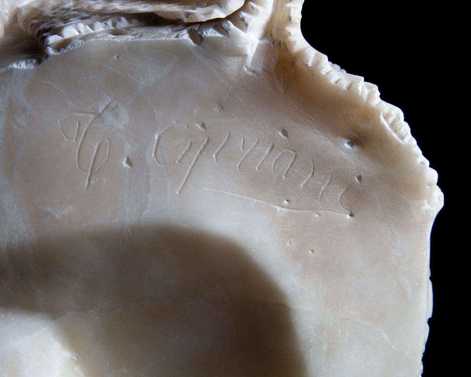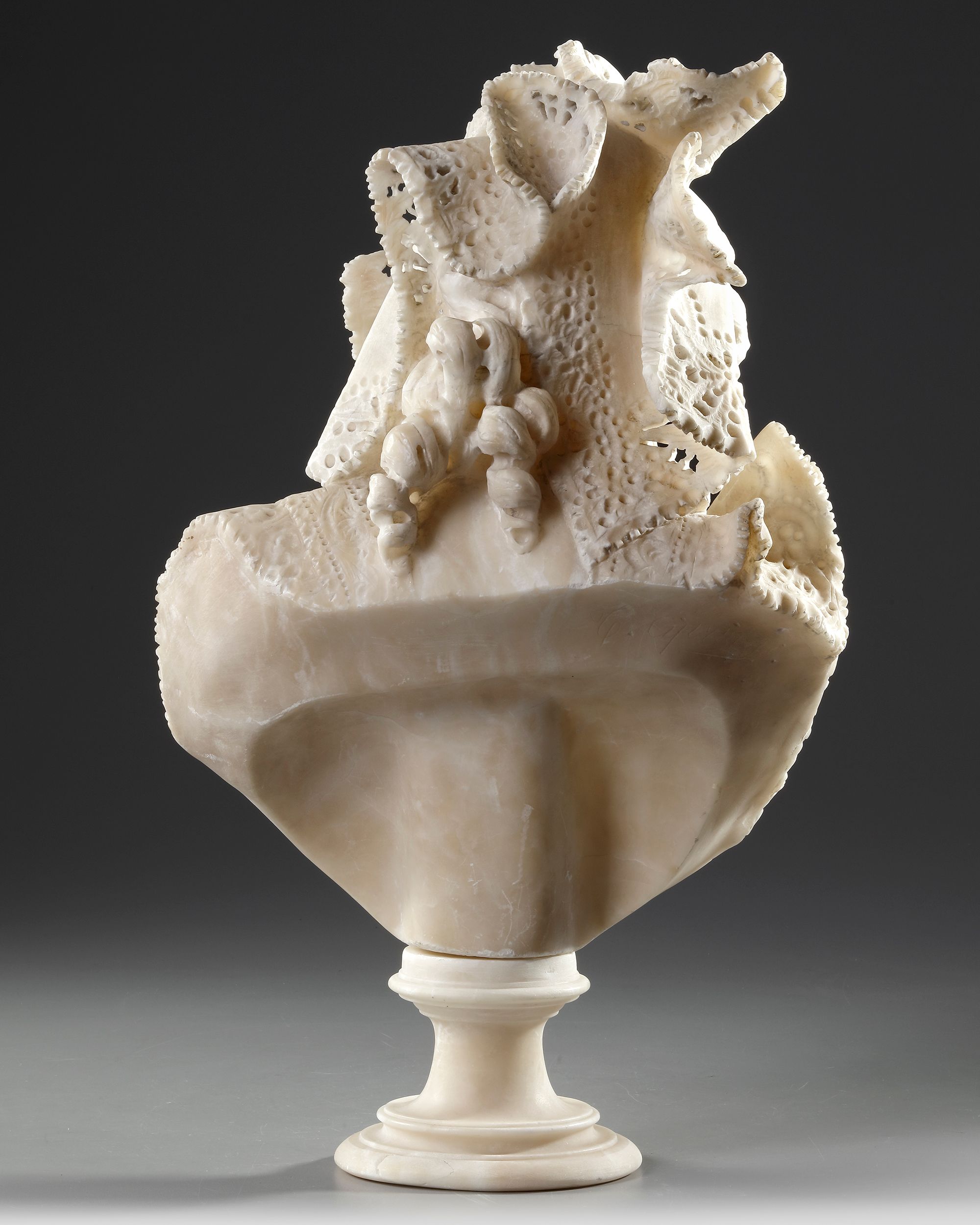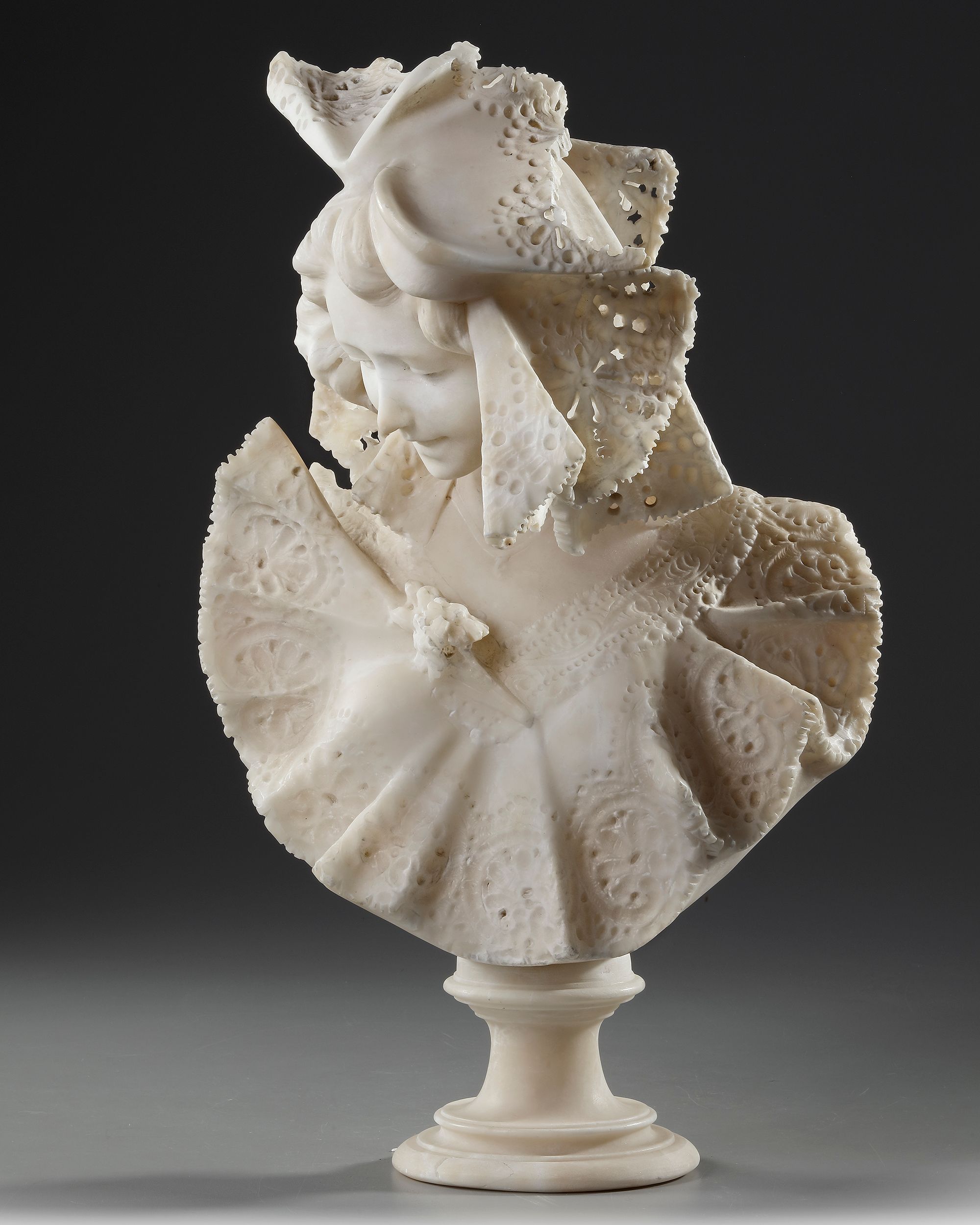 A buste of a girl in alabaster with beautiful detailed lace decoration. Late 19th century Some missing parts. Signed. H 55 cm. D 35 cm.