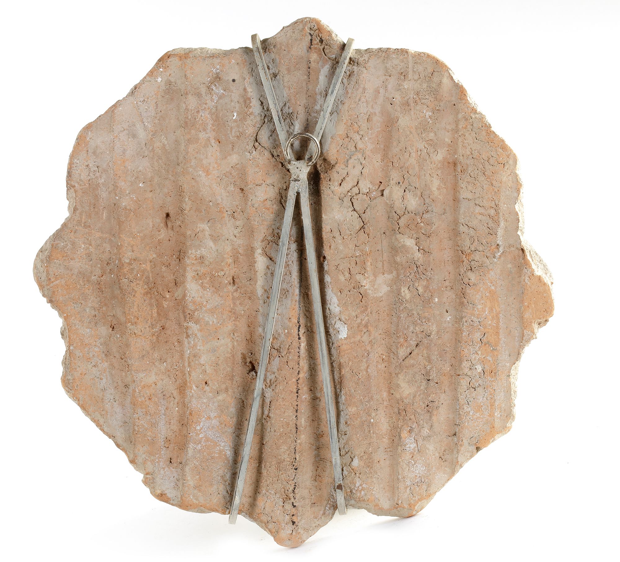 A Qajar lustre star tile, the lustre ground painted with half portrait of Alexander on terrace with border of scrolling foliage. 39 cm. diam.