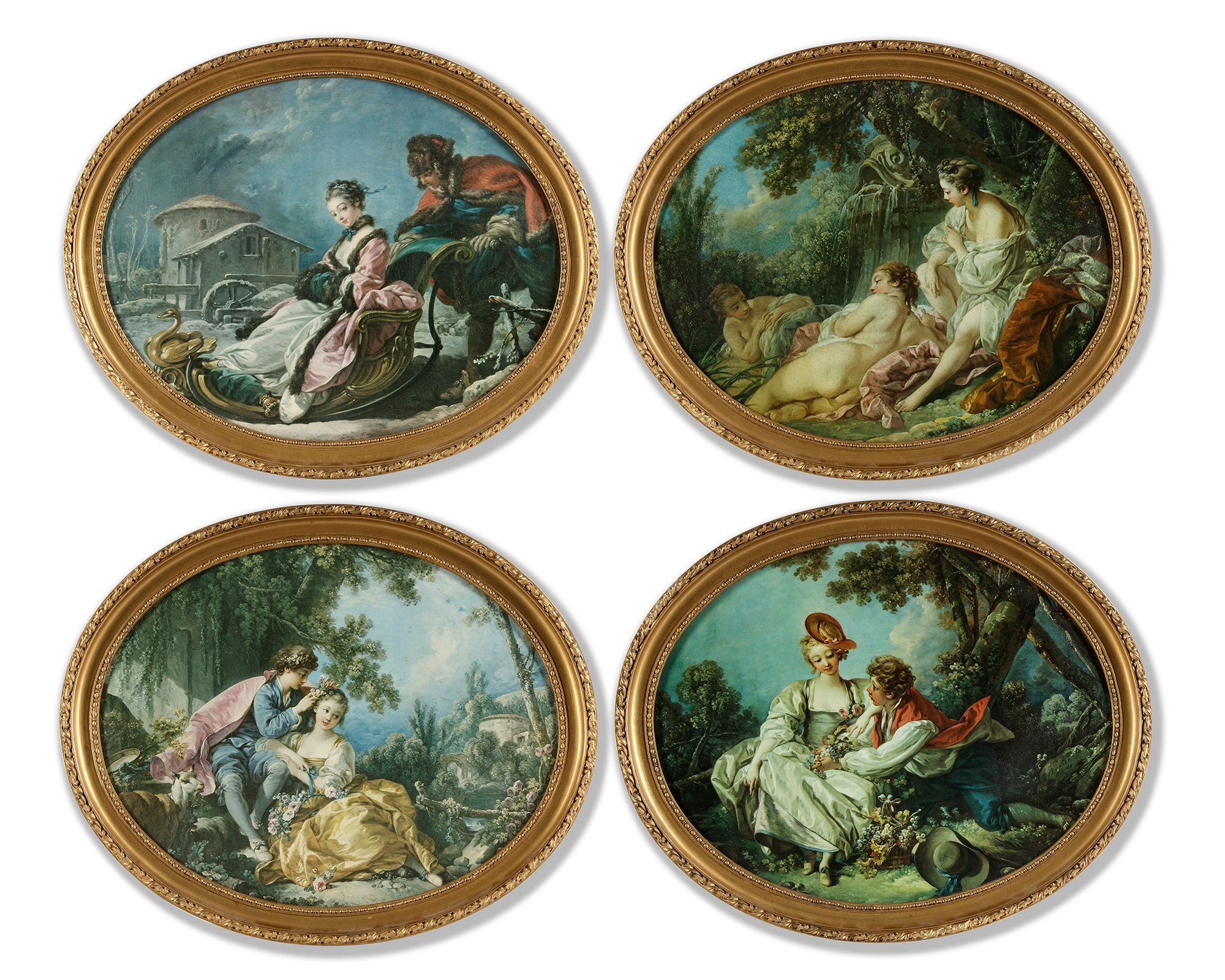 The 'four seasons', oil on canvas, in oval gilt wood frames. Depicting French romantic scenes. H 40 cm. D 50 cm.