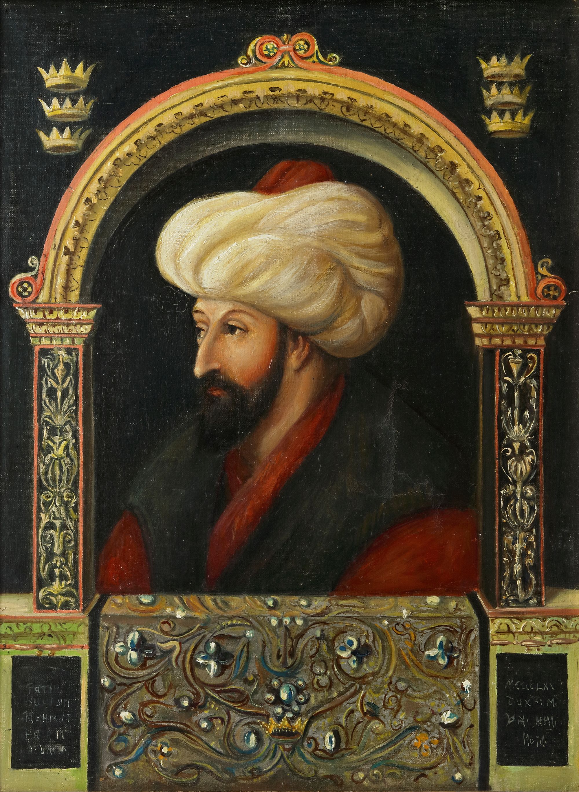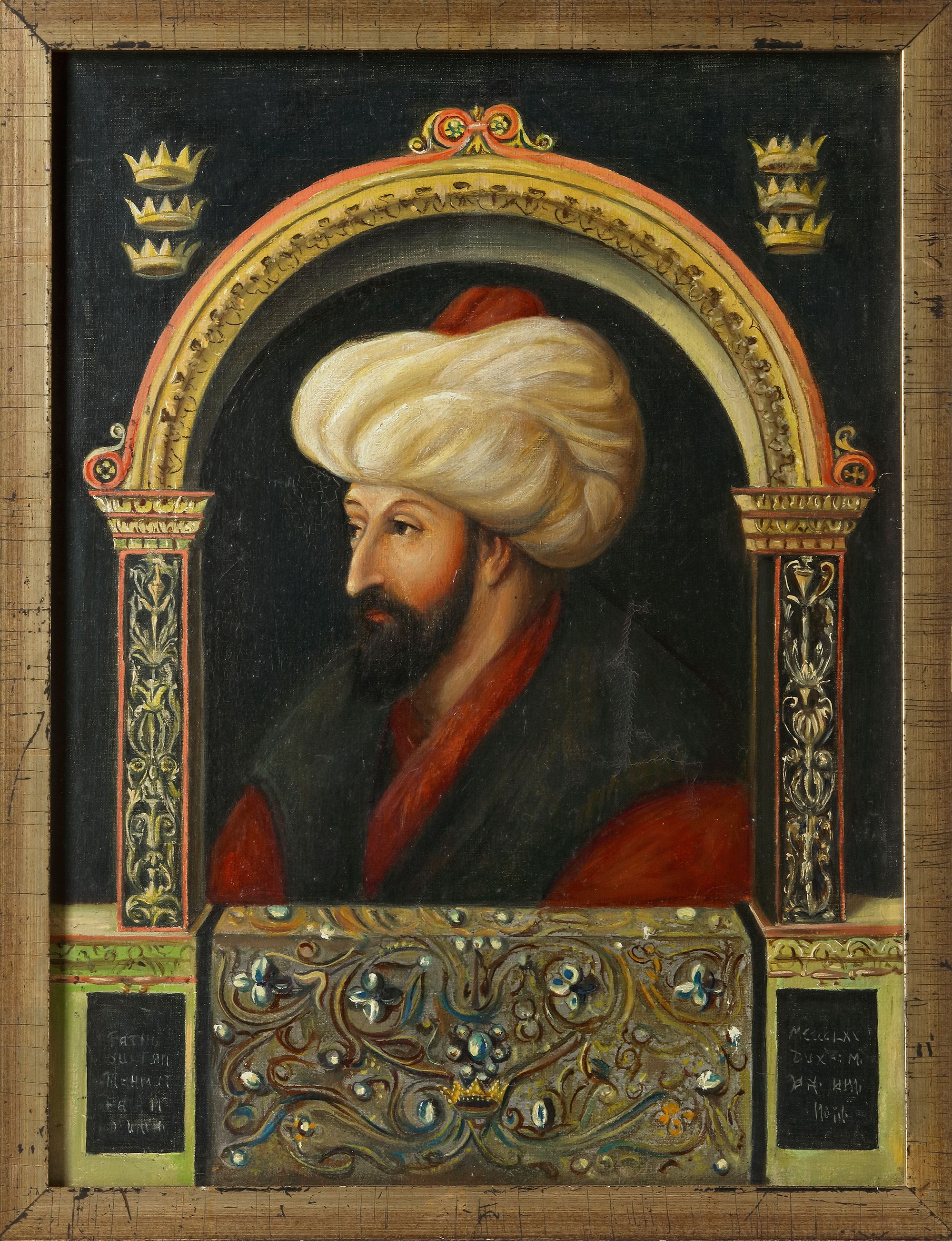 A copy of the famous portrait painting of Sultan Mehmed II by Gentile Bellini. 43 by 33 cm. As ruler of the expanding Islamic Ottoman Empire, Sultan Mehmet II was one of the most powerful men in the world when this portrait was painted. Fascinated by portraiture and European culture, he sent a request for a painter to the Venetian authorities in 1479. Gentile Bellini, having recently completed a series of portraits of the doges (elected rulers) of Venice, was well qualified for the task.
