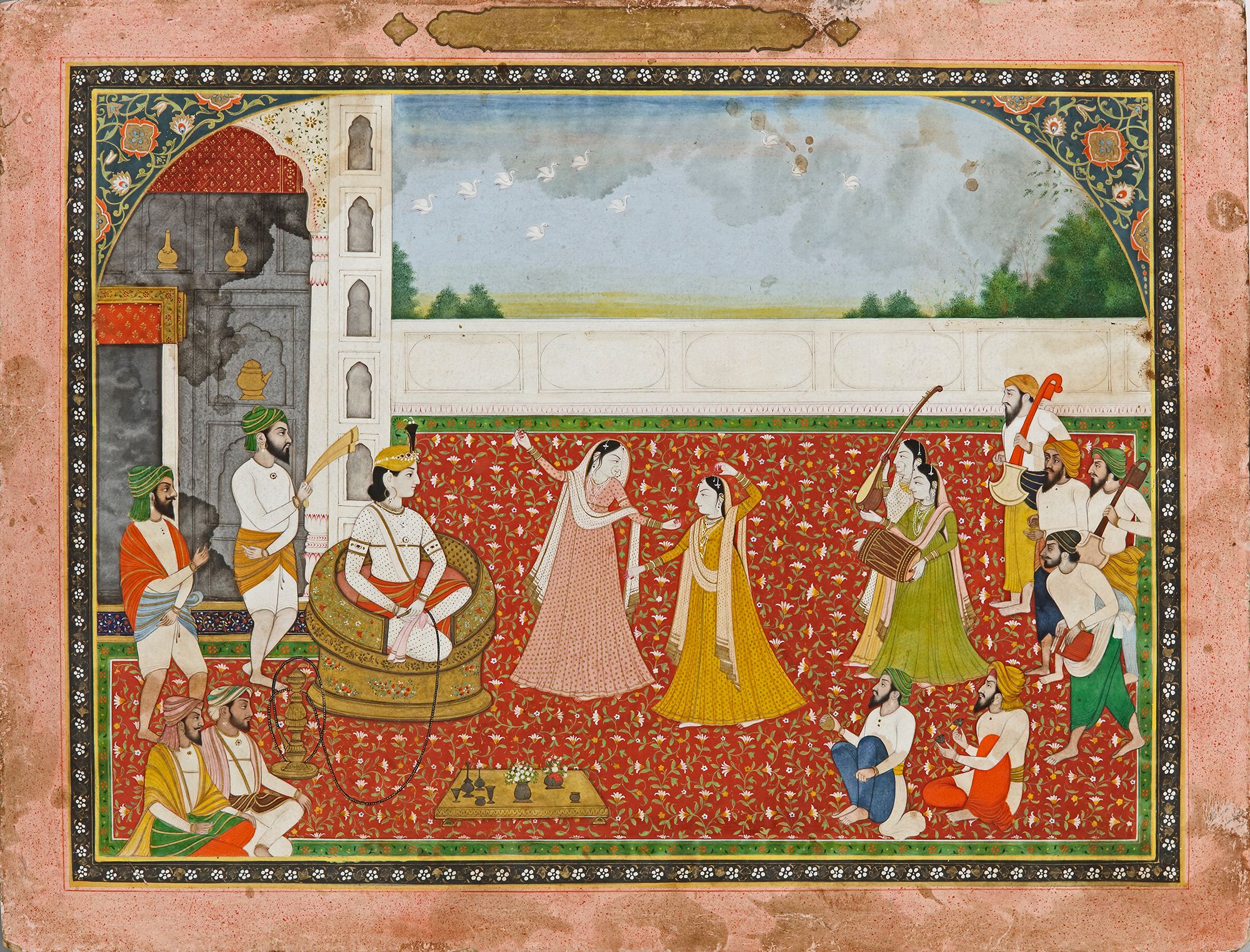 Opaque pigments heightened with gold on paper, depicting Raja Hira Singh seated on a terrace and enjoying a nautch performed by elegant dressed dancers with musicians, ruled in gold and flower decorated borders.