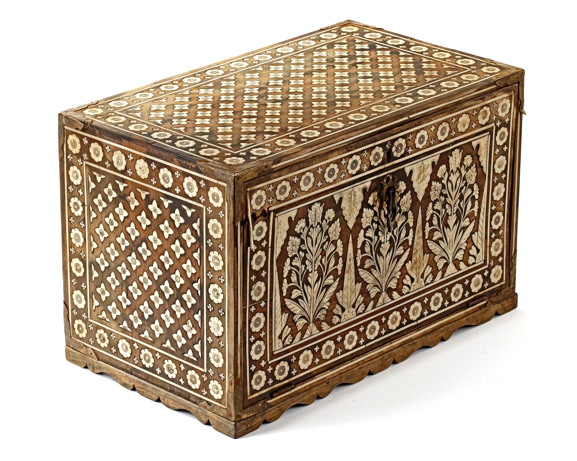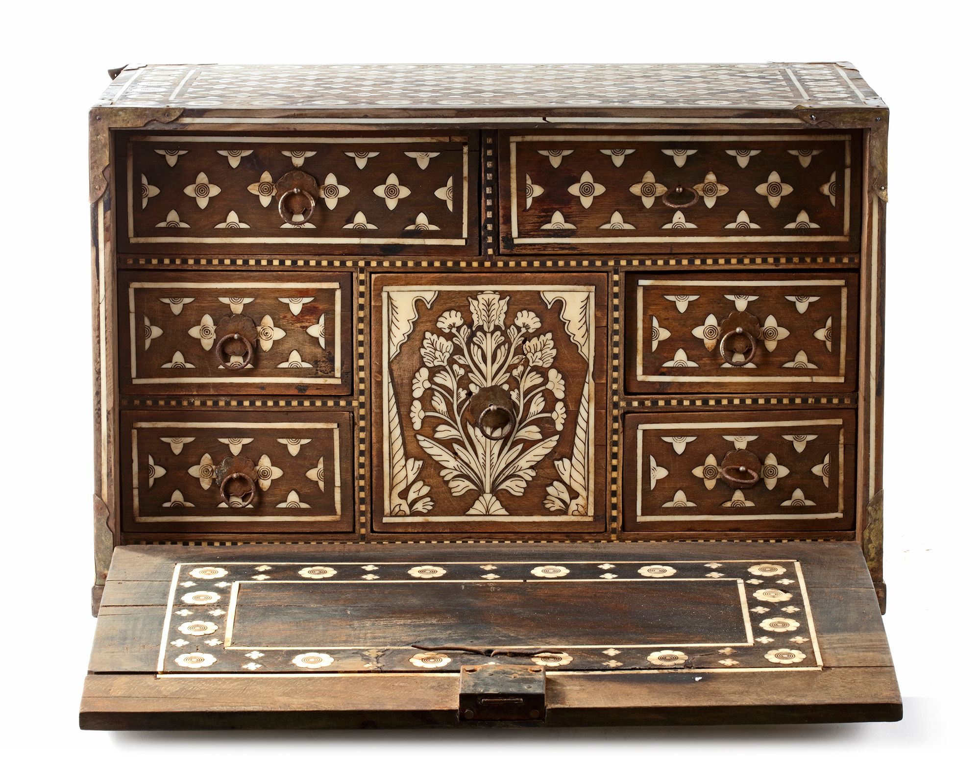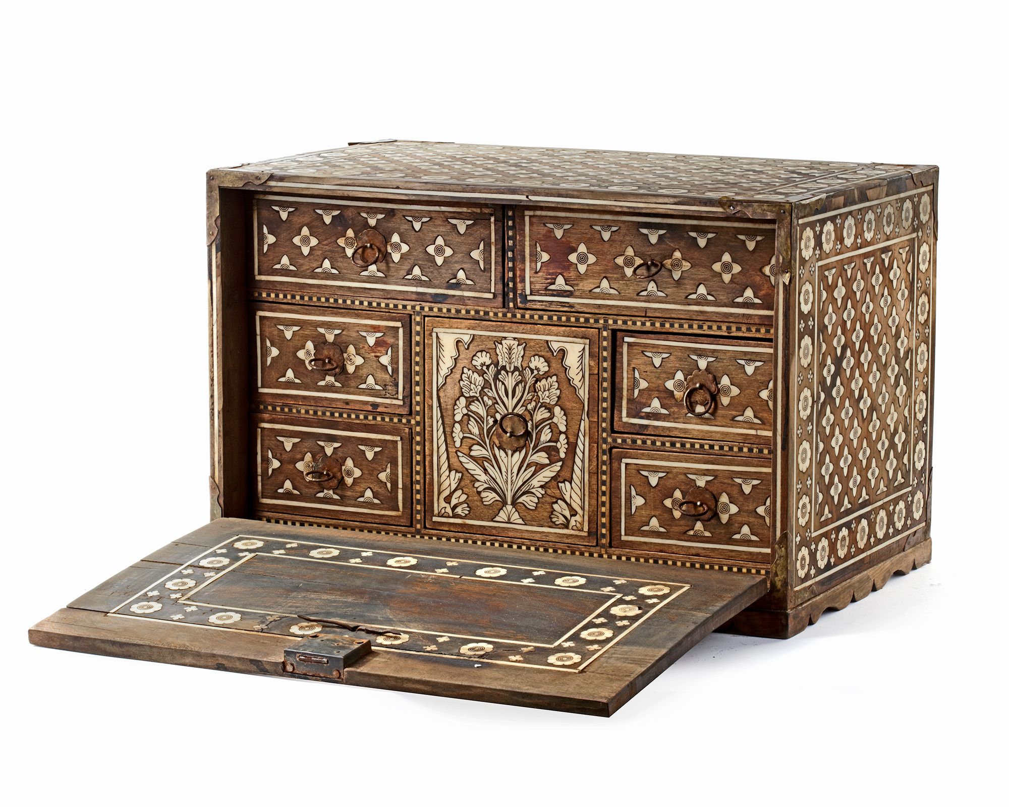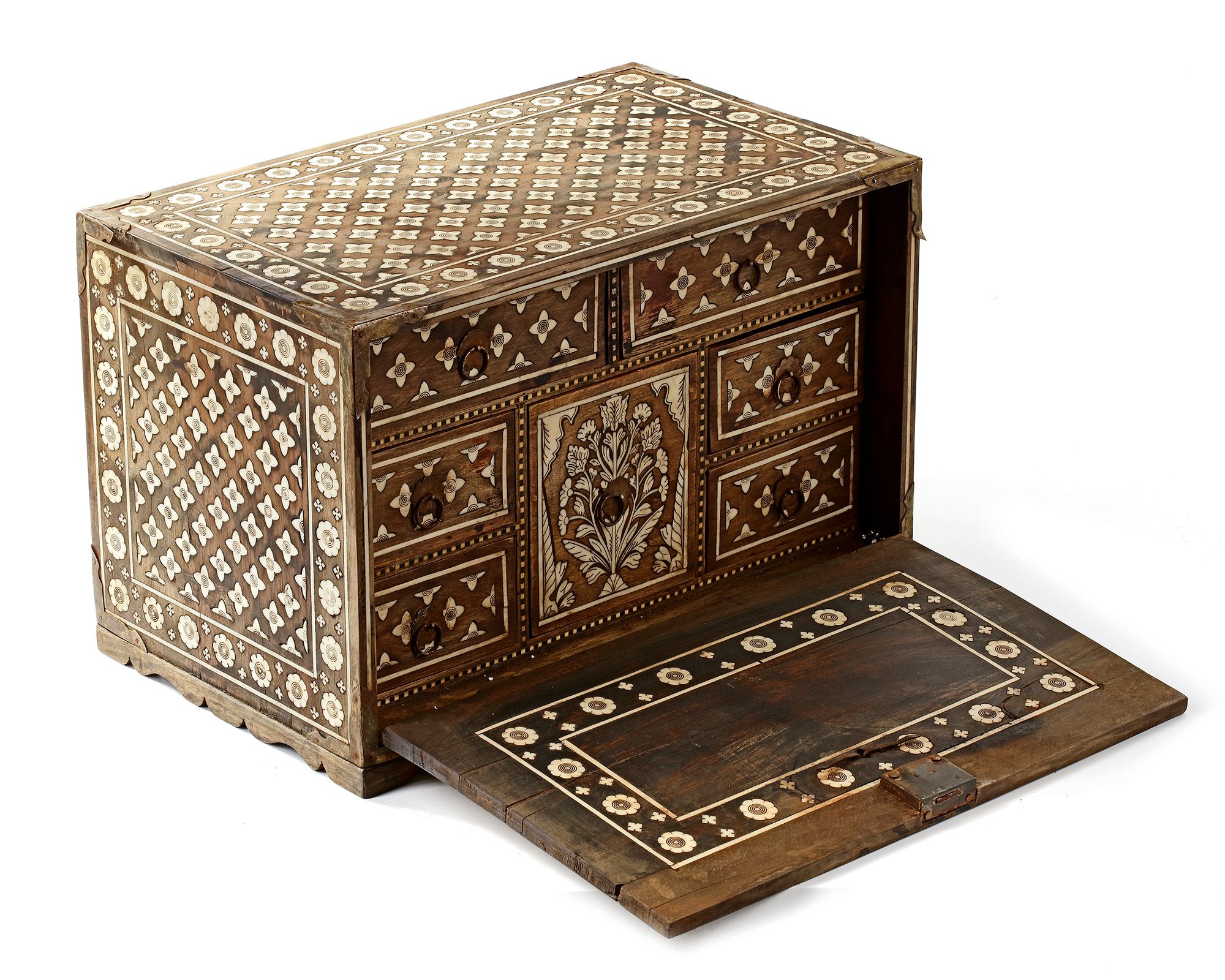 The two-handled box with ring hinged drop front revealing seven interior drawers, front inlaid with floral pattern with border of stylized flowers, same border to each side and top framing diaper pattern, drawer fronts with ring pulls centered on framed bone panels with concentric circles. 35.5 by 54.5 by 33 cm.