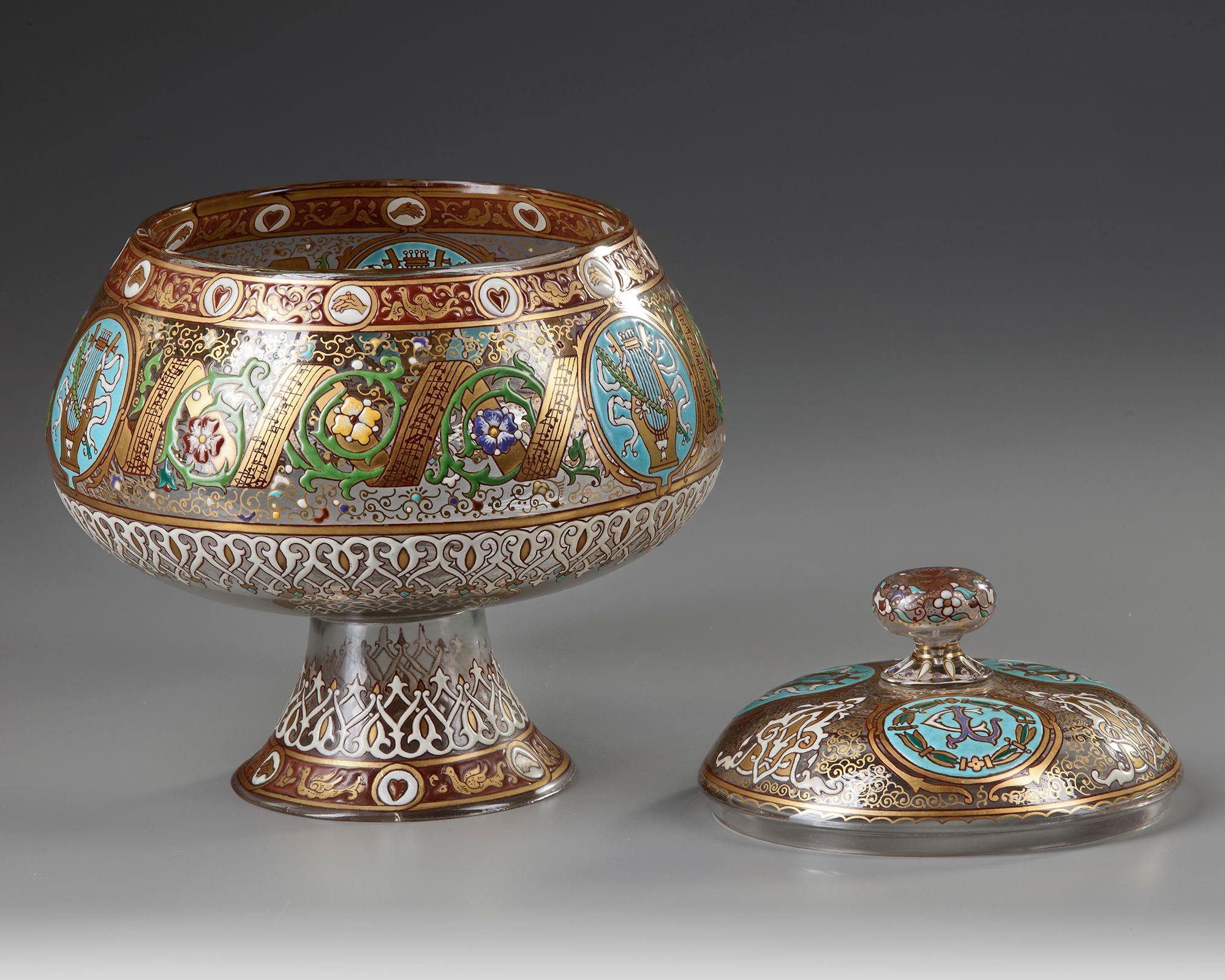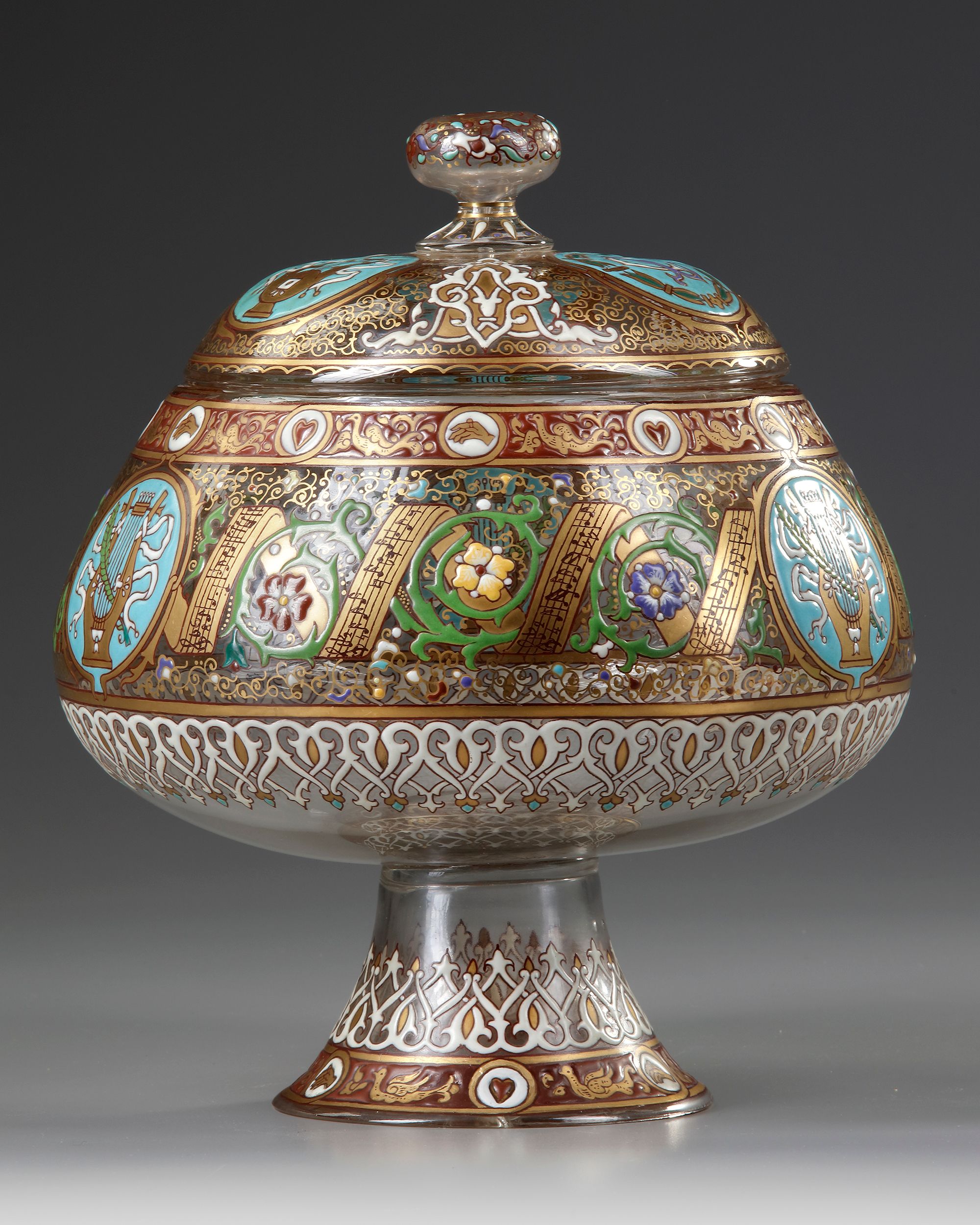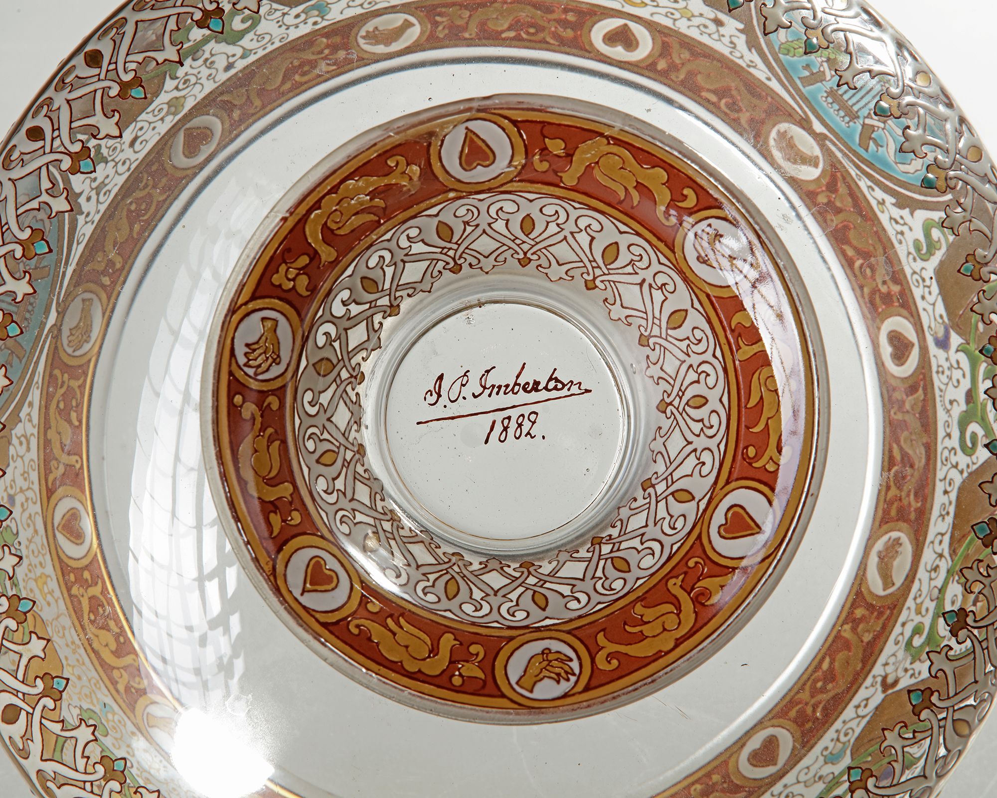 A green and clear glass with white and gold edges and borders. enamel colored border H 25 cm. Small restoration at the bottom.