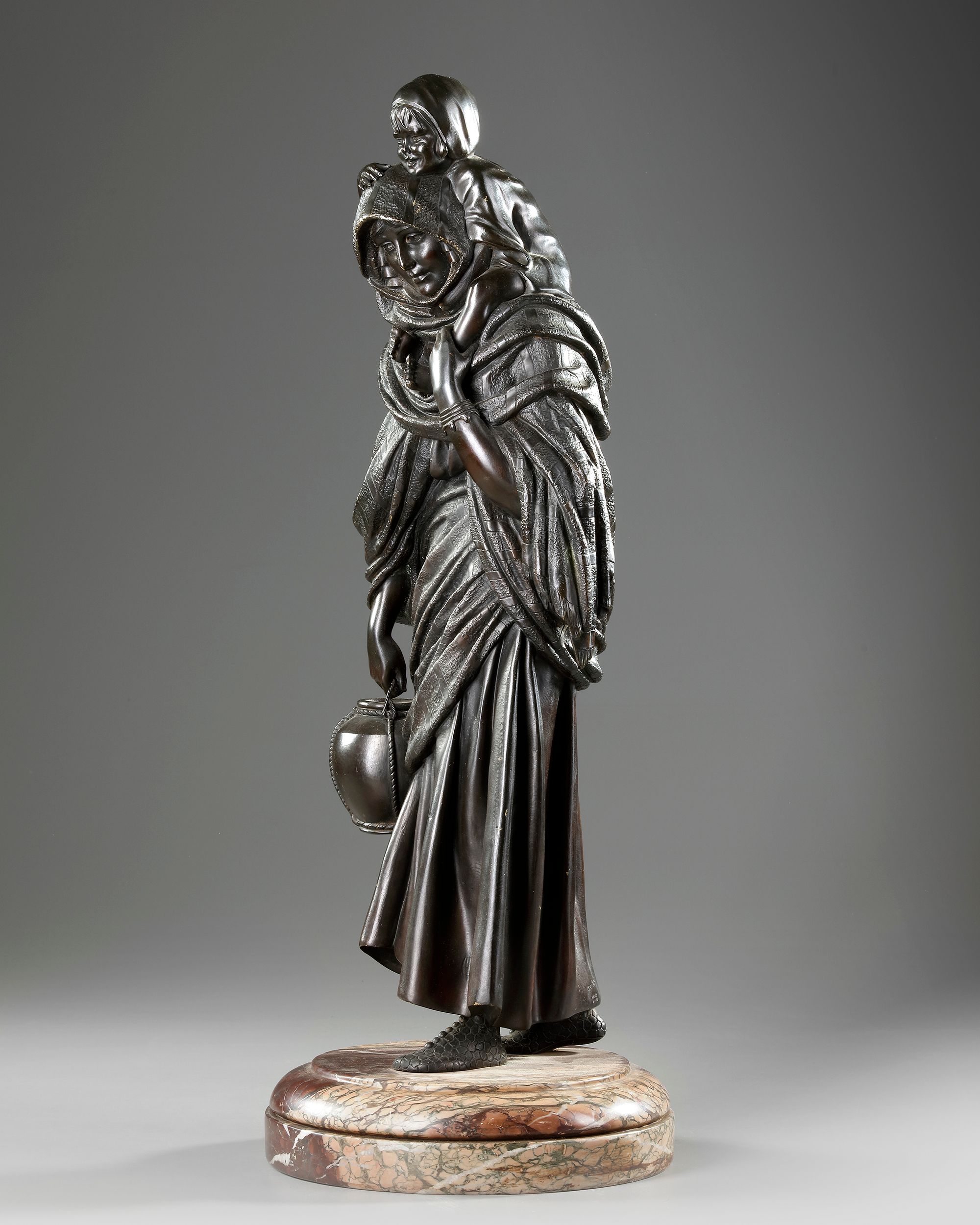 Statue of oriental lady carrying her baby on her shoulders. A very nice brown patina. On a red marble base.