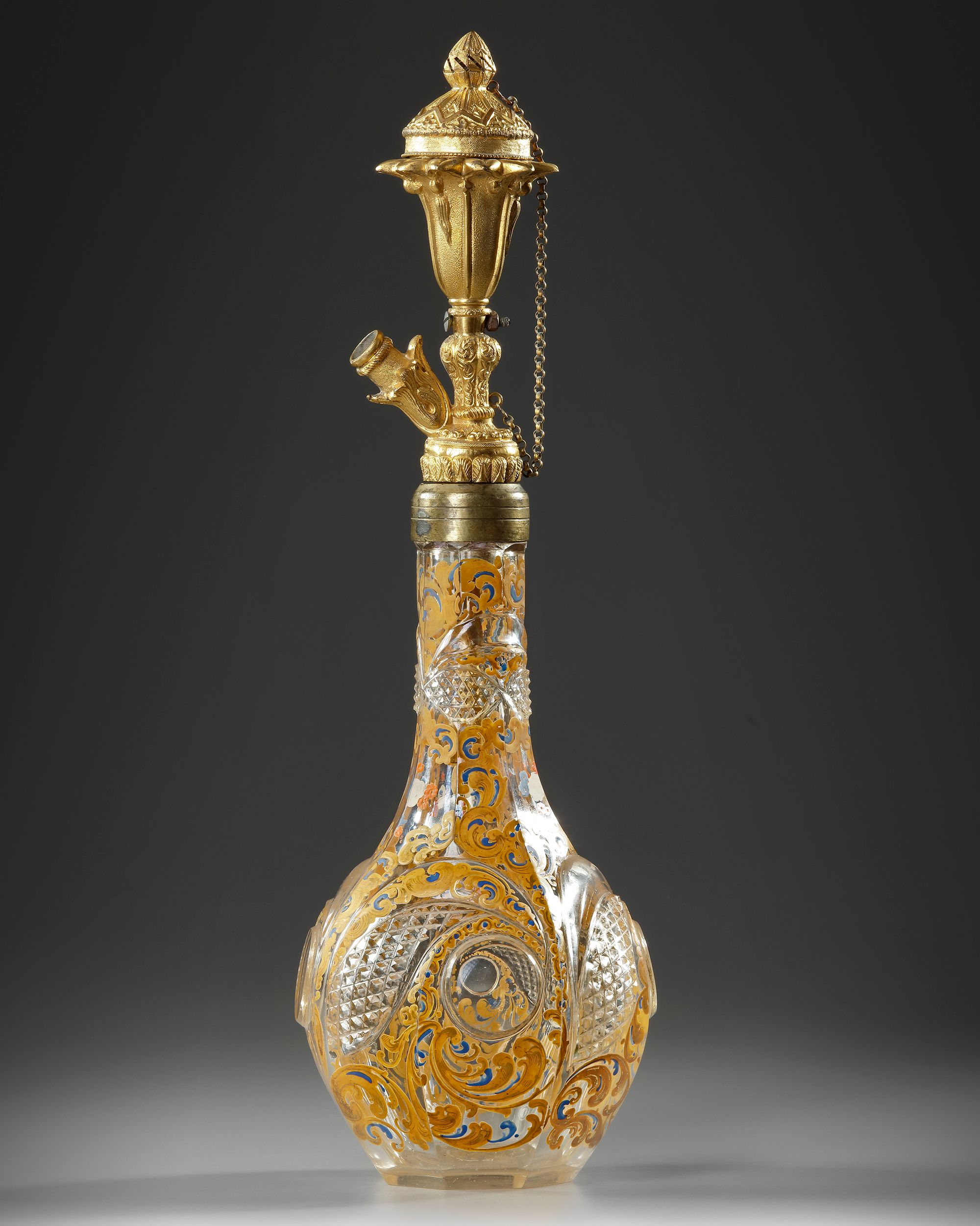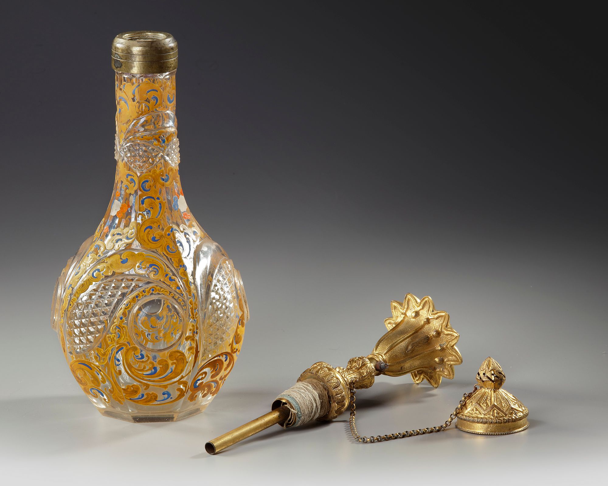 Extraordinary designs with a gilt bronze laden top, its a typical luxury item of Sultan Abdulmecid (1839-1861). White cut-glass with gold enameled decors of flowers.